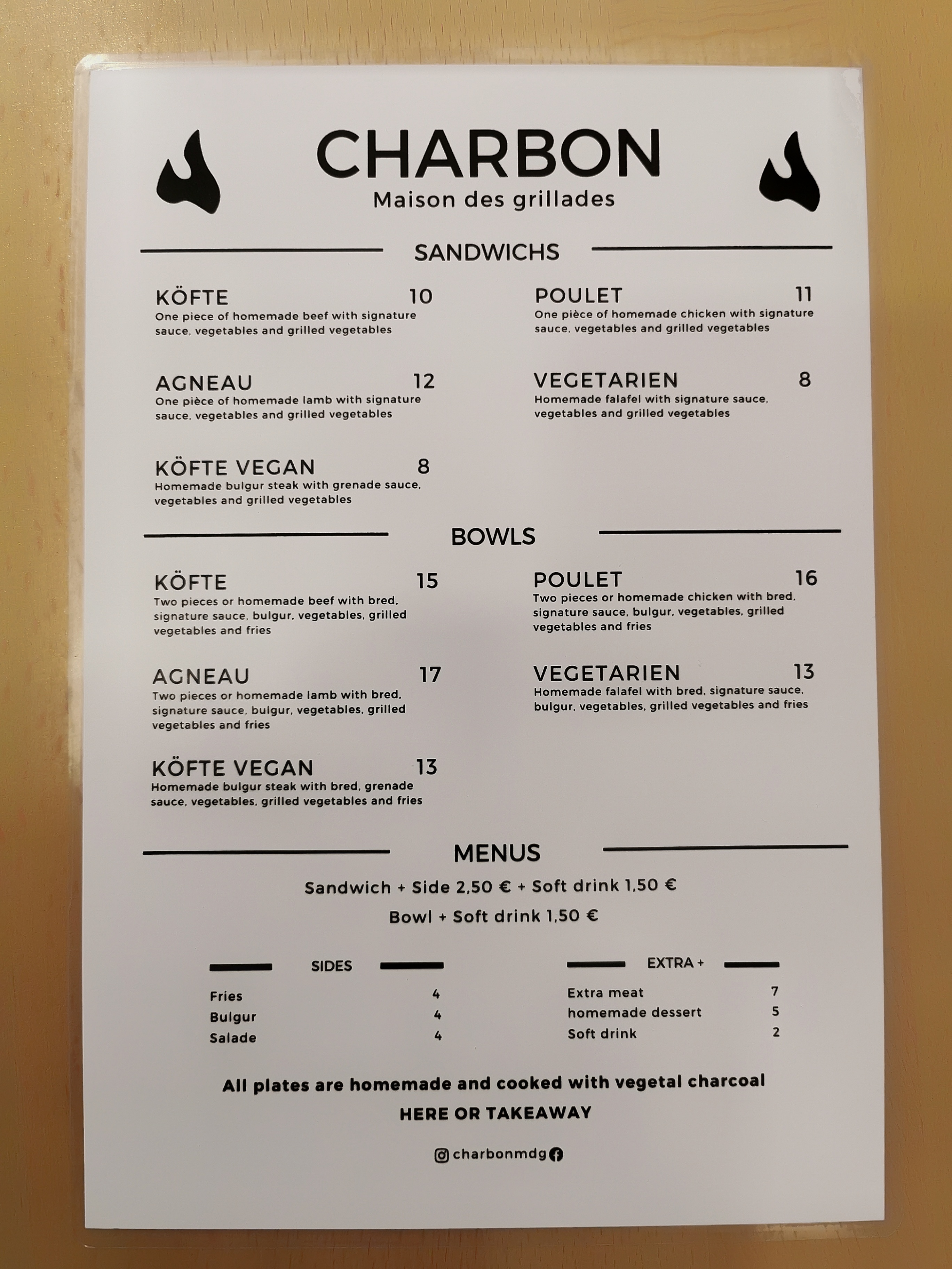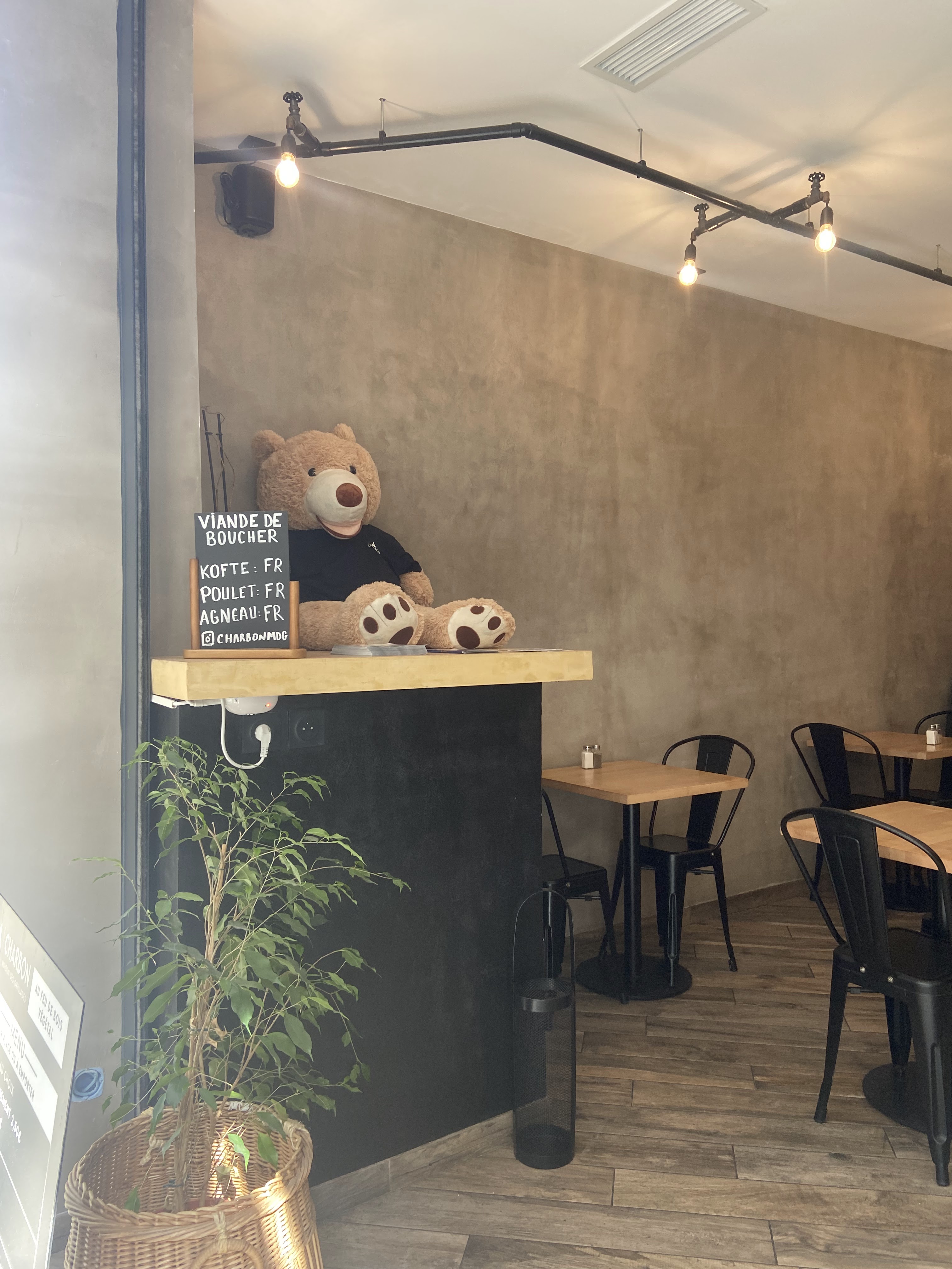 Partant vers ma rôtisserie préférée, je me suis garé à côté de Charbon. Le lieu m'a intrigué et j'ai bien fait de rentrer parler avec le gérant David. Beau restaurant neuf, très propre, les brochettes donnent envie. J'ai essayé le Kofte (brochette de bœuf) + le boulgour (blé aux tomates). Franchement c'était excellent. Et on a essayé l'Agneau qui était excellent également. Donc je ne peux que vous féliciter, vous inciter à conserver ce niveau/ qualité et surtout votre bonne humeur. J'ajoute des photos du lieu, du menu et de ma commande en espérant vous aider.