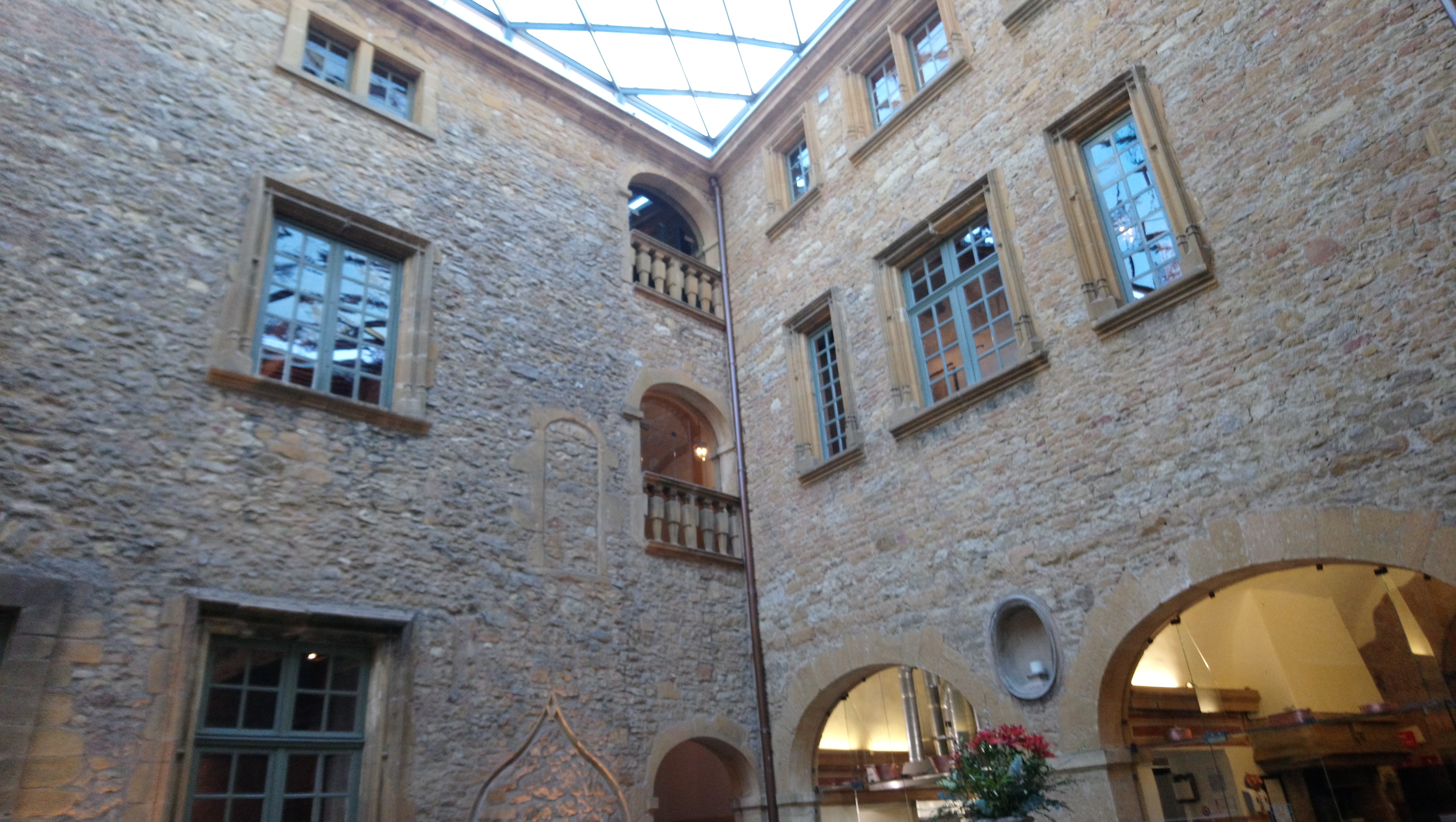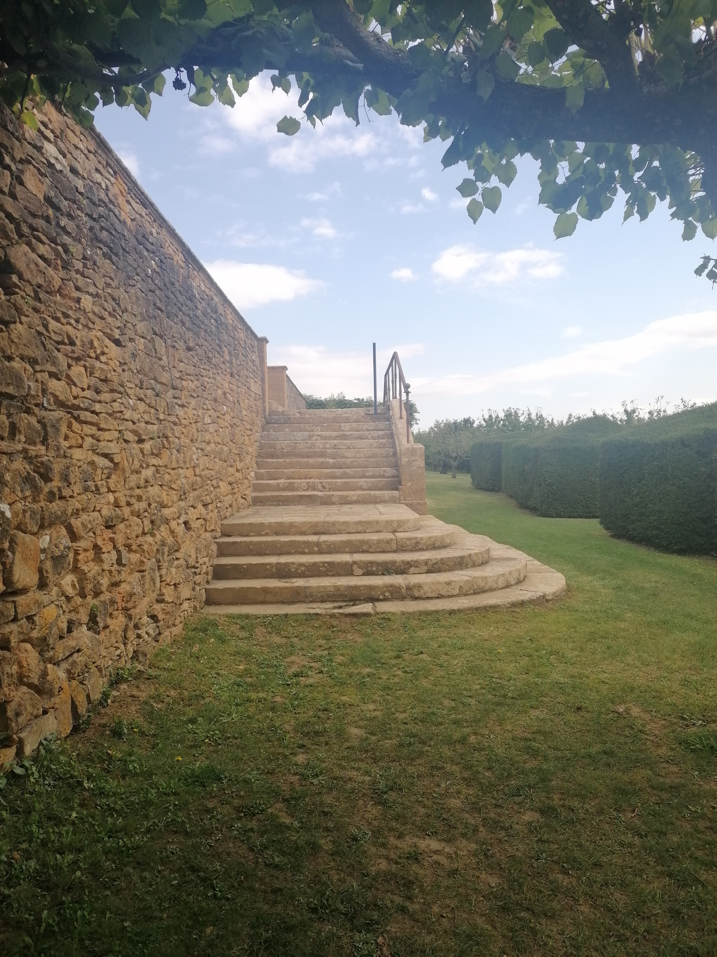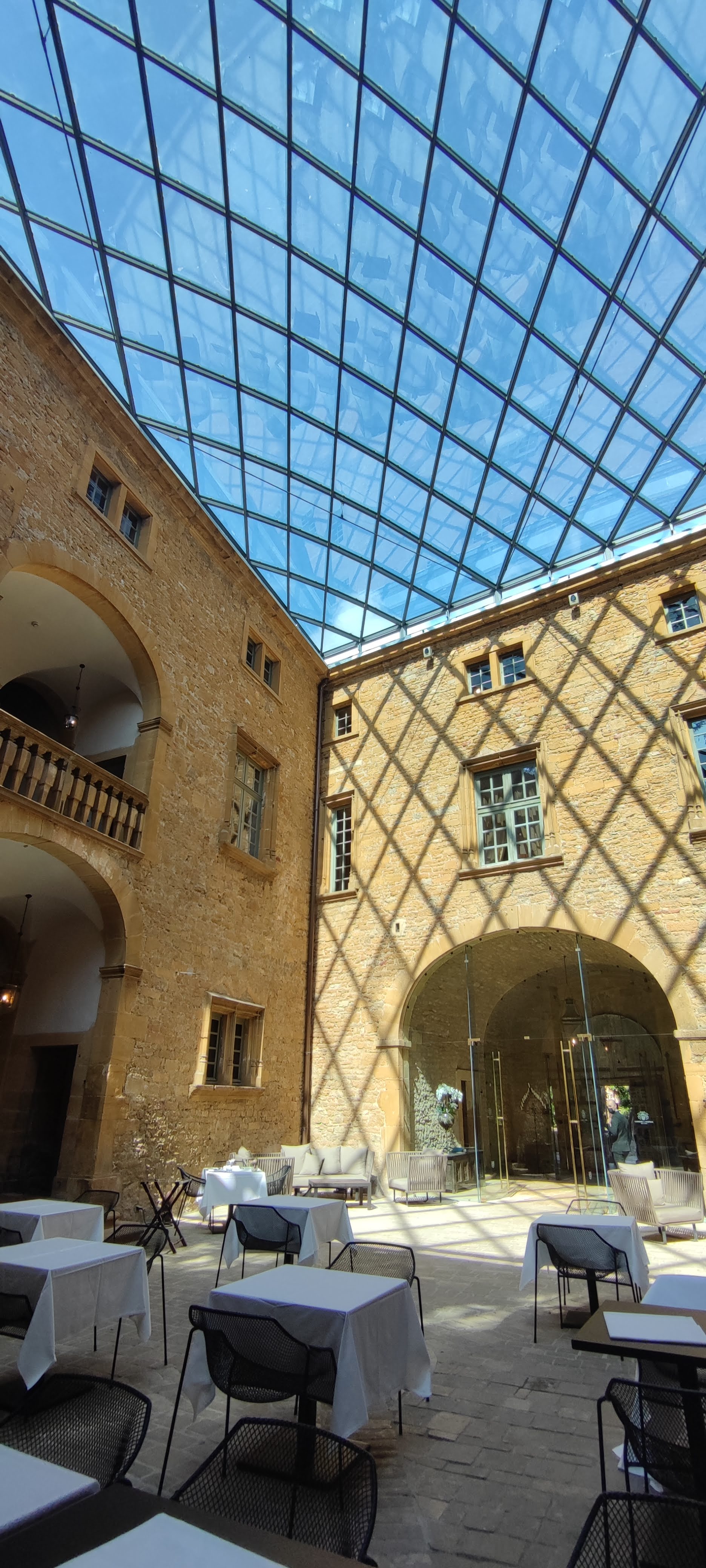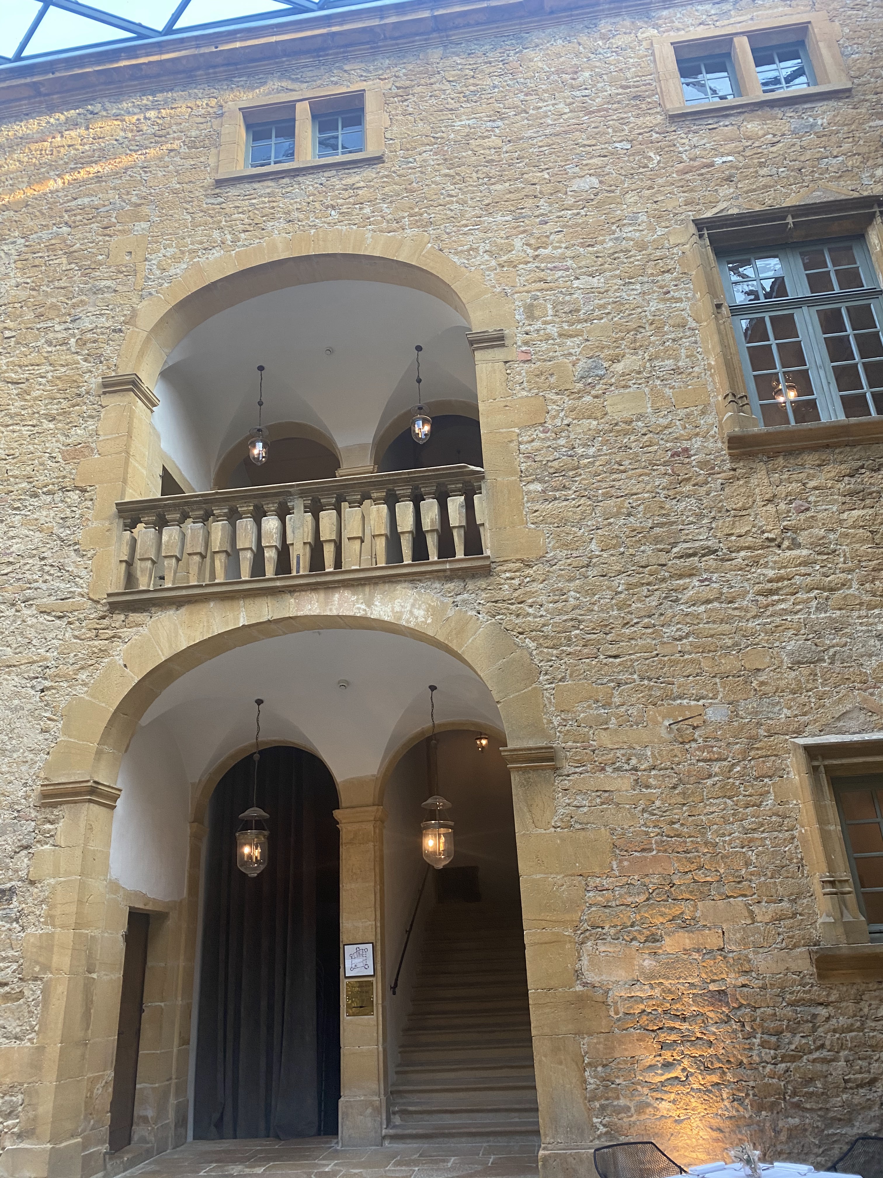 Une adresse prestigieuse pour des repas incroyables. A l intérieur ou à l extérieur tout est conçu pour vous mettre dans un cocon. Je conseille la cour extérieure qui donne sur les vignes beaujolaise. Une vue incroyable. La photo est prise au premier étage. Lieu dédié au digestif.