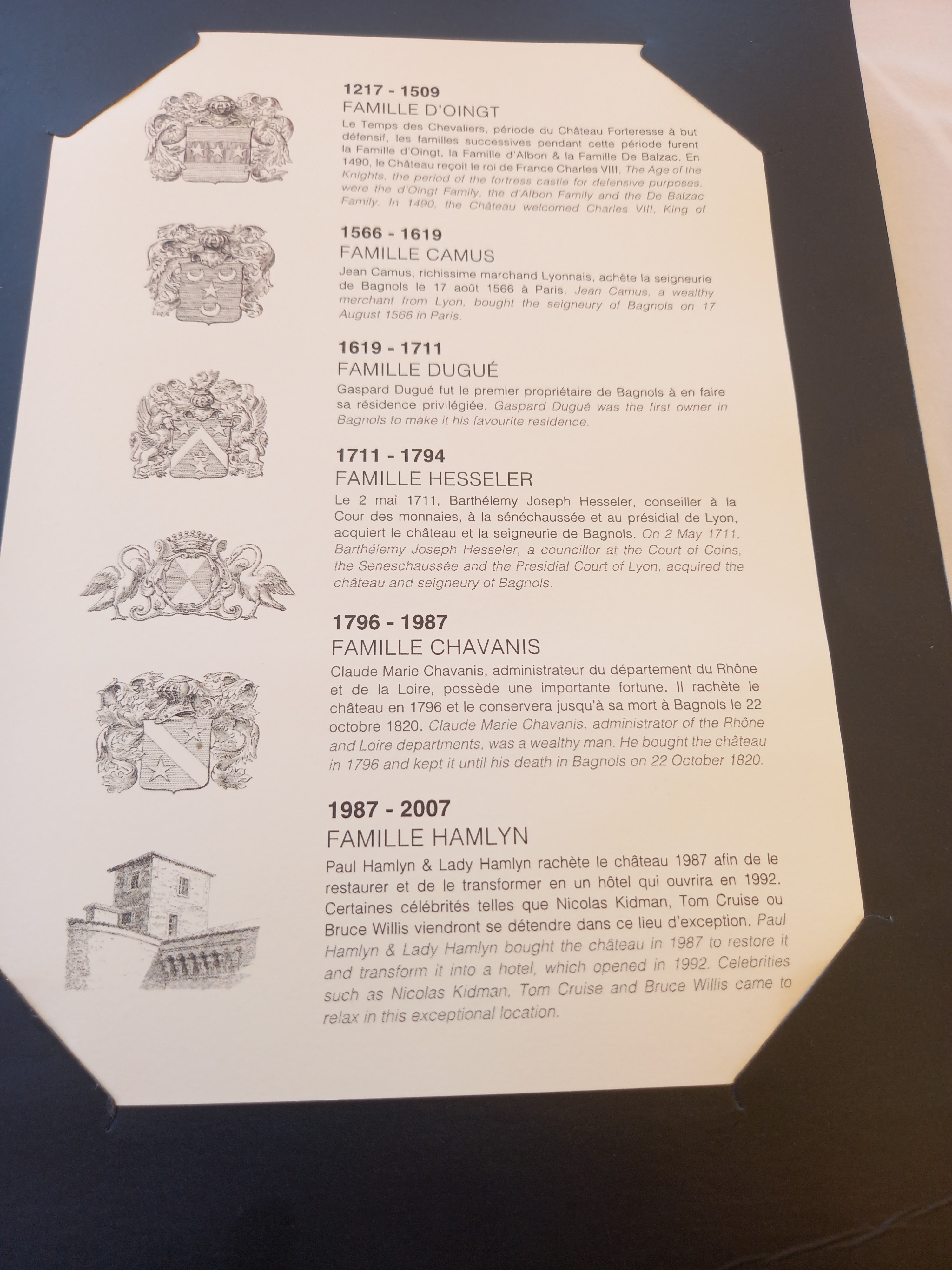 Cher Messieurs, Au sujet de notre visite au Château de Bagnols du 7 au 9 Juin le site et le château sont magnifiques et le dîner Mercredi soir était exquis le service jeune mais fort aimable. MAIS la chambre « Fleurie » que l’on nous avez donné n’avait rien en commun avec les photos de vos avertissements. Elle a évoqué un caveau de prison avec sa seule petite fenêtre au niveau du plafond donnant vue sur un coin de ciel et une branche d’arbre. Les tentures et les meubles en marron, gris foncés, et noir évoquaient un caveau funéraire. Pas de vase de fleurs ou un bol de fruits pour ajouter une note de couleur. Le plateau de petit déjeuner du second matin était incomplet, comme les restes du plateau d’une autre chambre. Ce n’était vraiment pas digne de Relais et Châteaux. J’aurais aimé recommander votre hôtel à mes amis aux États-Unis mais pas avant que ce sois mieux rôdé. Isabelle Toms ————————————————————— Dear Sirs, About our visit to the Château de Bagnols from June 7 to 9, the site and the castle are magnificent and the dinner on Wednesday evening was exquisite, the service young but very friendly. BUT the Flowery room we were given had nothing in common with the photos in your ads. The room evoked a prison vault with its only small window at ceiling level giving a view of a patch of sky and a tree branch. The draperies and furniture in brown, dark gray, and black evoked a burial crypt. No vase of flowers or bowl of fruit to add a splash of color. The second morning's breakfast tray was incomplete, like the leftovers from another room's tray. It was really not worthy of Relais et Châteaux. I would have liked to recommend your hotel to my friends in the United States, but not before things got better. Isabelle Toms