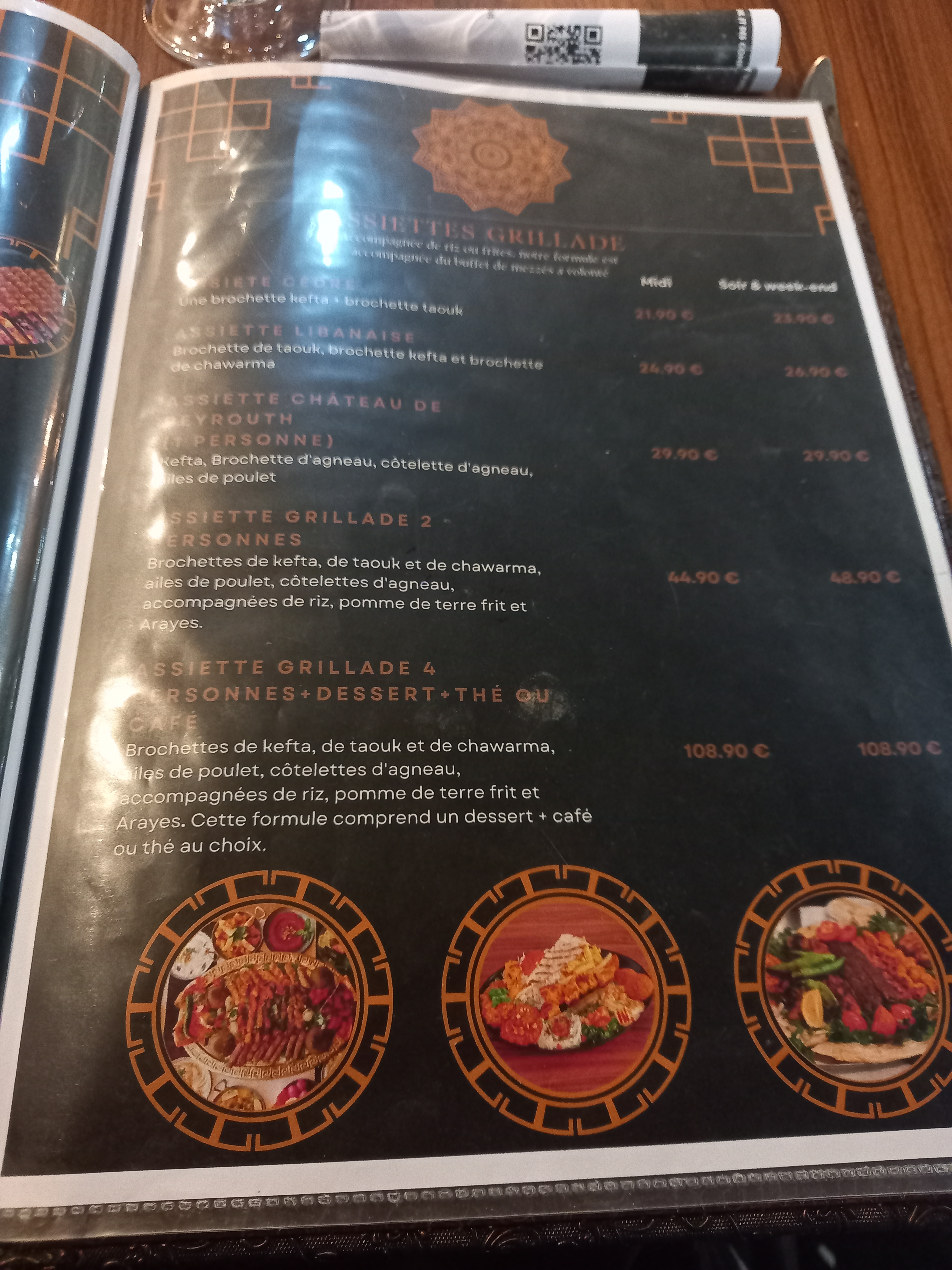 Pour les MENUS RAMADAN attention c’est la plus grande arnaque On a payé 16.9 euro pour une simple entrée sans viande sans rien on a dû quitter car ni la soupe ni le plat principal ni le dessert arrivait après 2h d’attente le personnel est très très désagréable c’est la pire expérience de ma vie j’ai jamais été traité comme ça de ma vie beaucoup de gens ont dû payer la même somme pour manger du houmous qui n’est même pas bon honte a vous