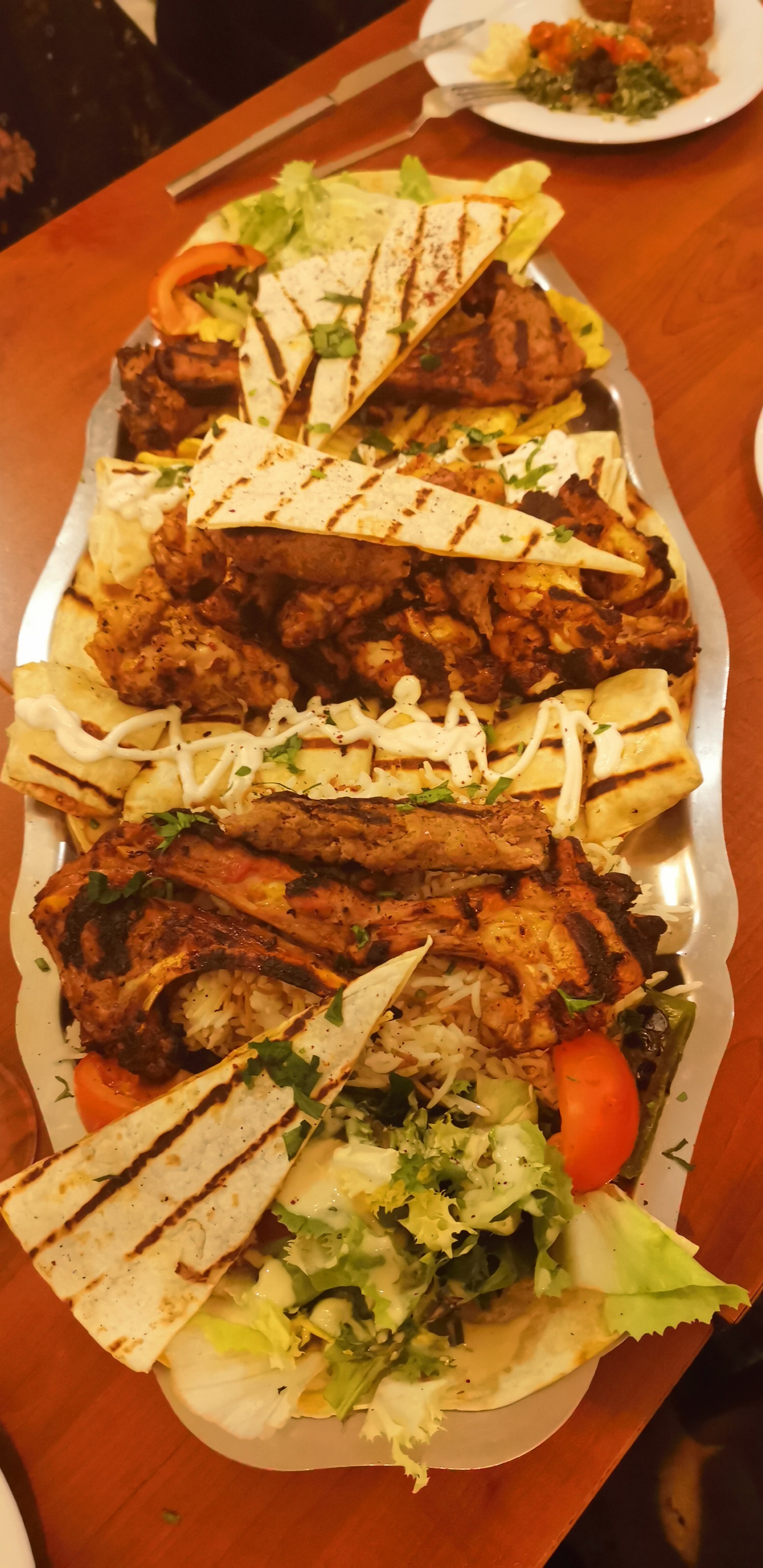 Accueil très sympa et chaleureux. Le service est excellent. Avec mon ami, nous avons pris l'assiette grillades pour 2. Cela inclut également le Buffet des entrées qui était très bon. Faut penser à laisser un peu de place dans l'estomac car lorsque vous voyez arriver le plateau de grillades, un marathon s'engage 😄. Le riz avec les cheveux d'ange, les pommes de terre faites maison, la salade fraîche et les différentes viandes avec le chawarma... On a tout fini!! Trop bon! Et puis bien sûr le dessert (baklavas et flan pistache/fleur d'oranger) avec le thé qui va avec. Un super moment et j'y retournerai très prochainement. A deux ou même en groupe, cet endroit est top pour partager et déguster différents plats. Seul bémol, si vous venez en voiture, prenez de l'avance pour trouver une place.
