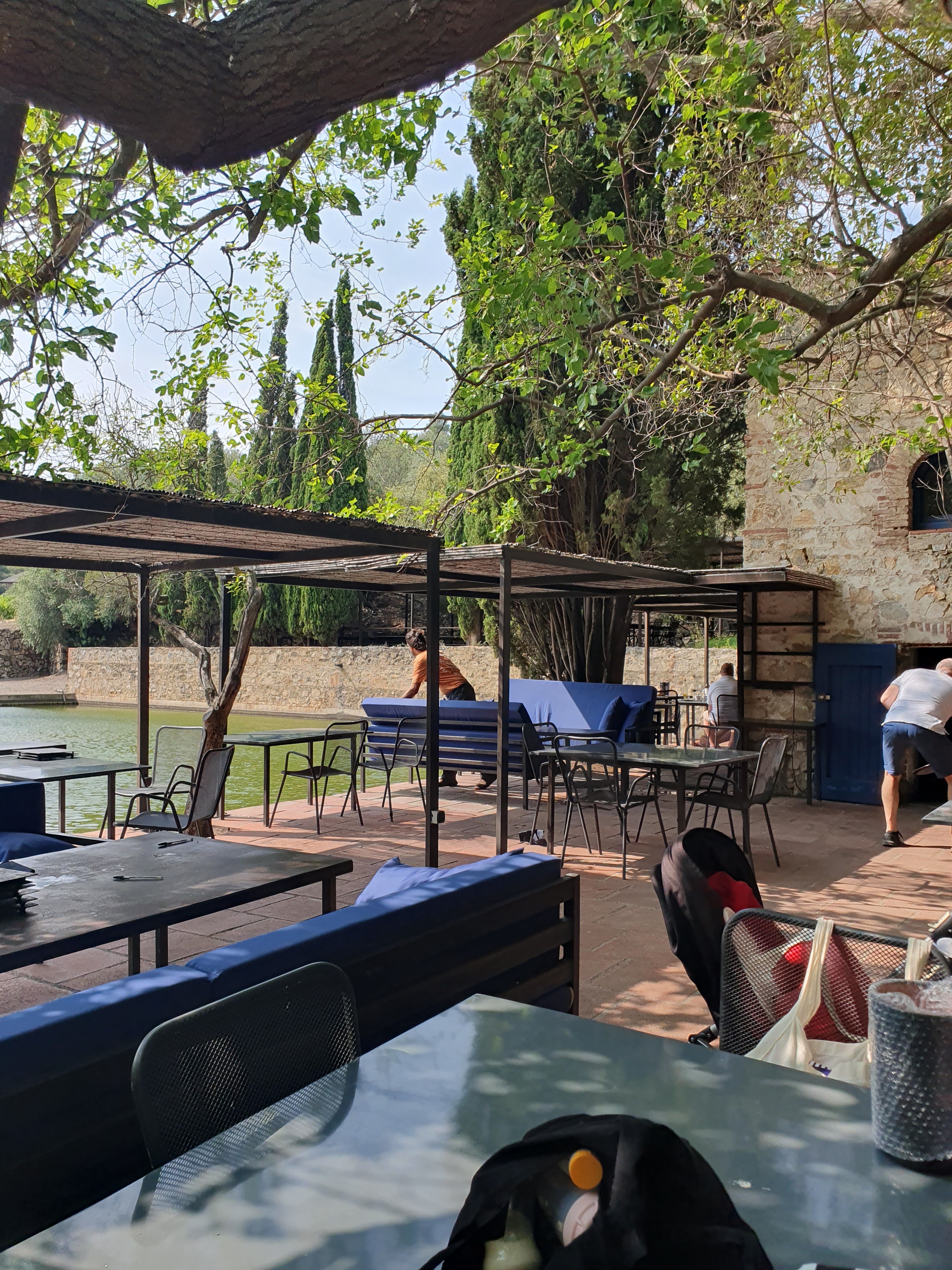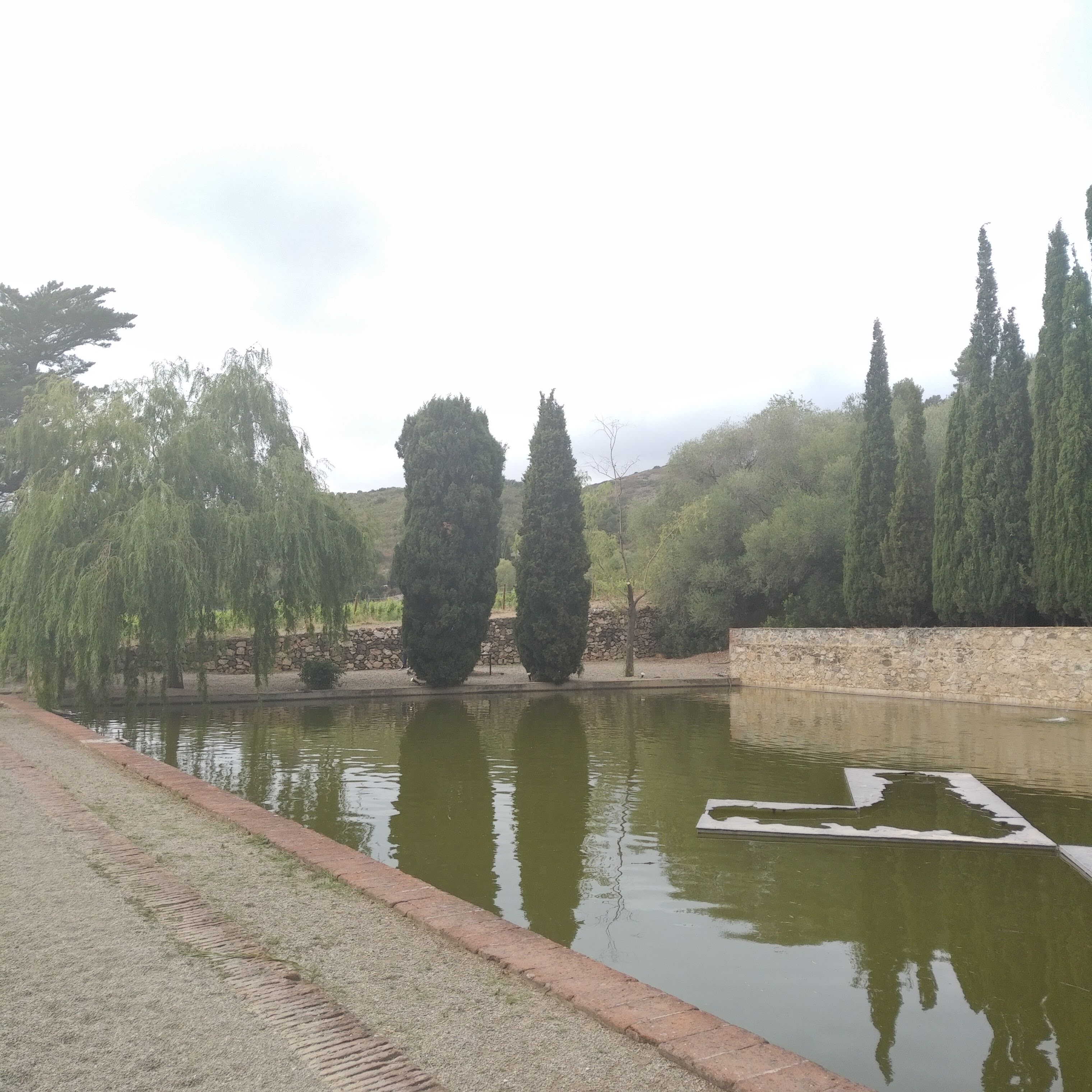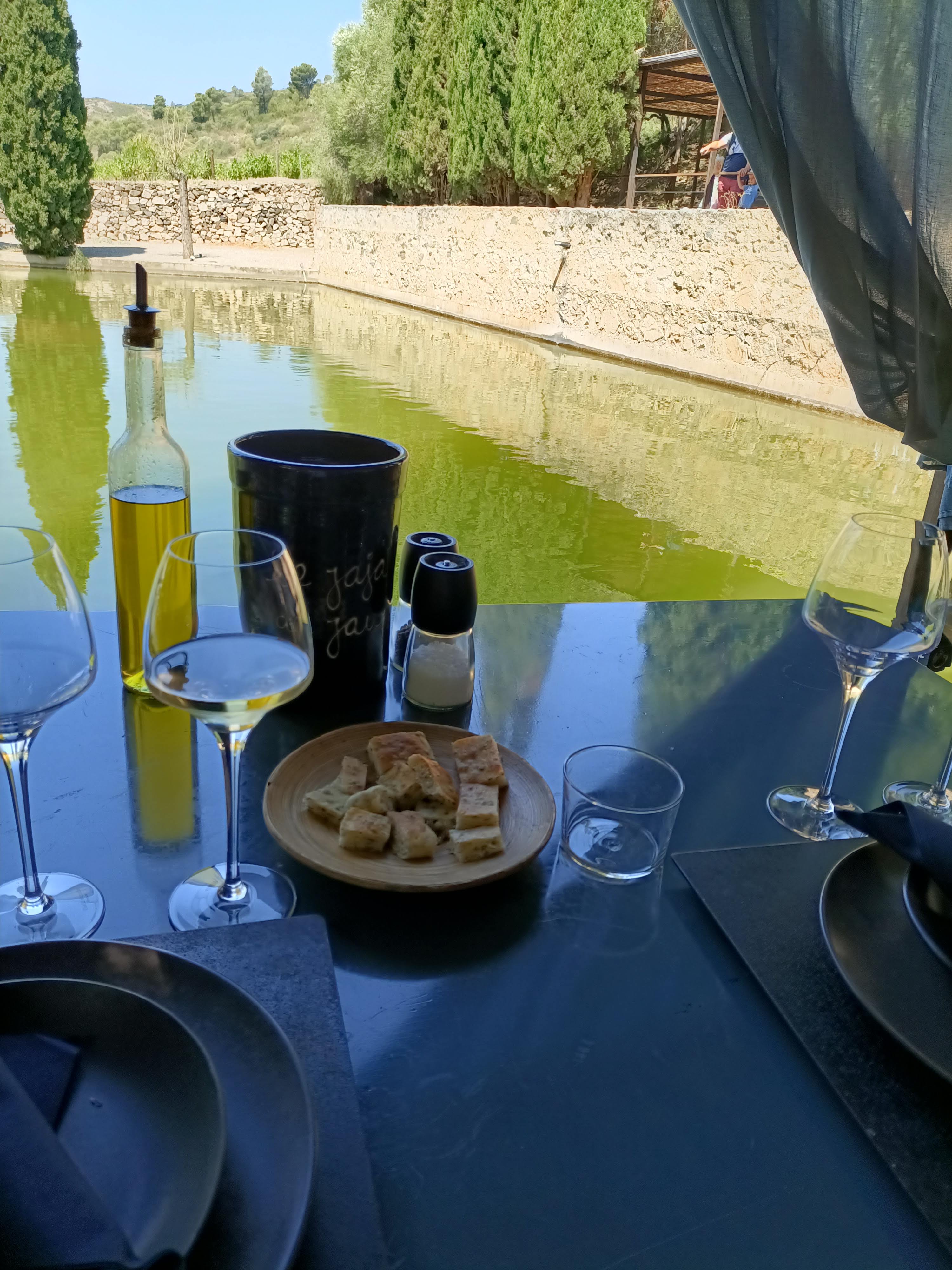 Restaurant Grill du domaine viticole château de Jau. Repas simple mais bon, le midi Pan Con Tomates & Jambon, Grillades et Tomates grappes, Fromage & Glace. Un vrai accompagnement serait bienvenu le midi :) Accords mets & vins coordonnés. Un ou deux vins à chaque plat. Cadre ombragé très agréable au milieu de la propriété, bassin, entouré de vignes. Attention au retour…