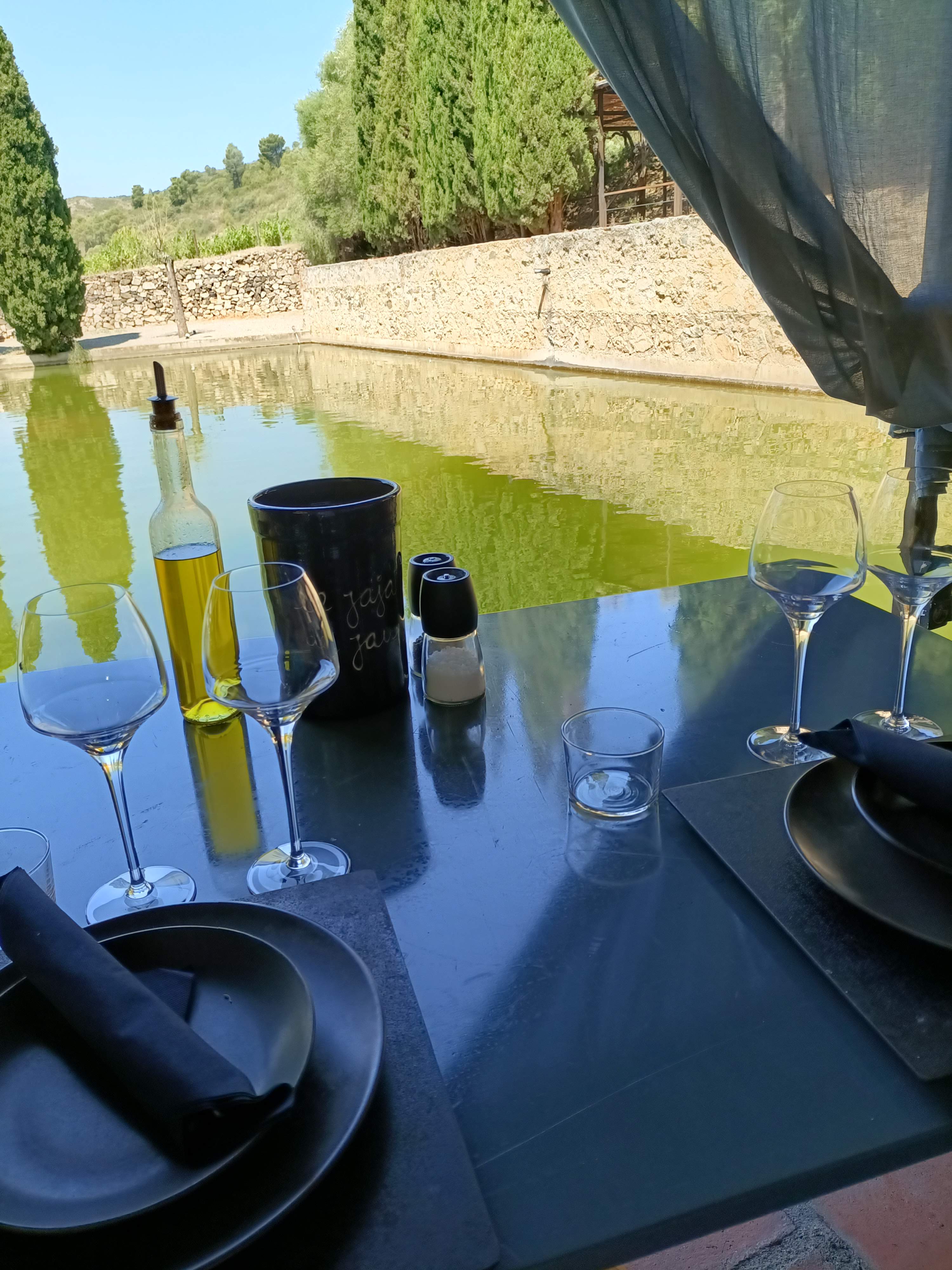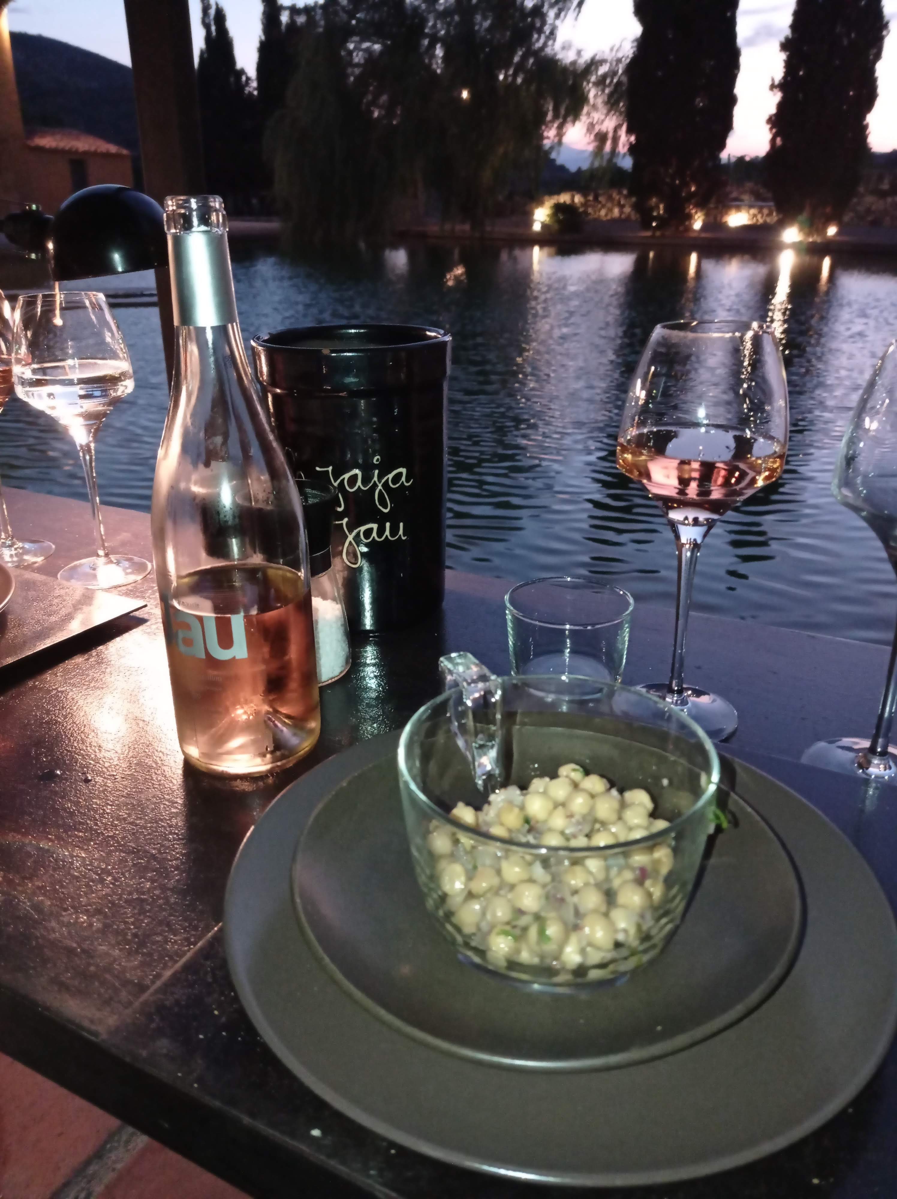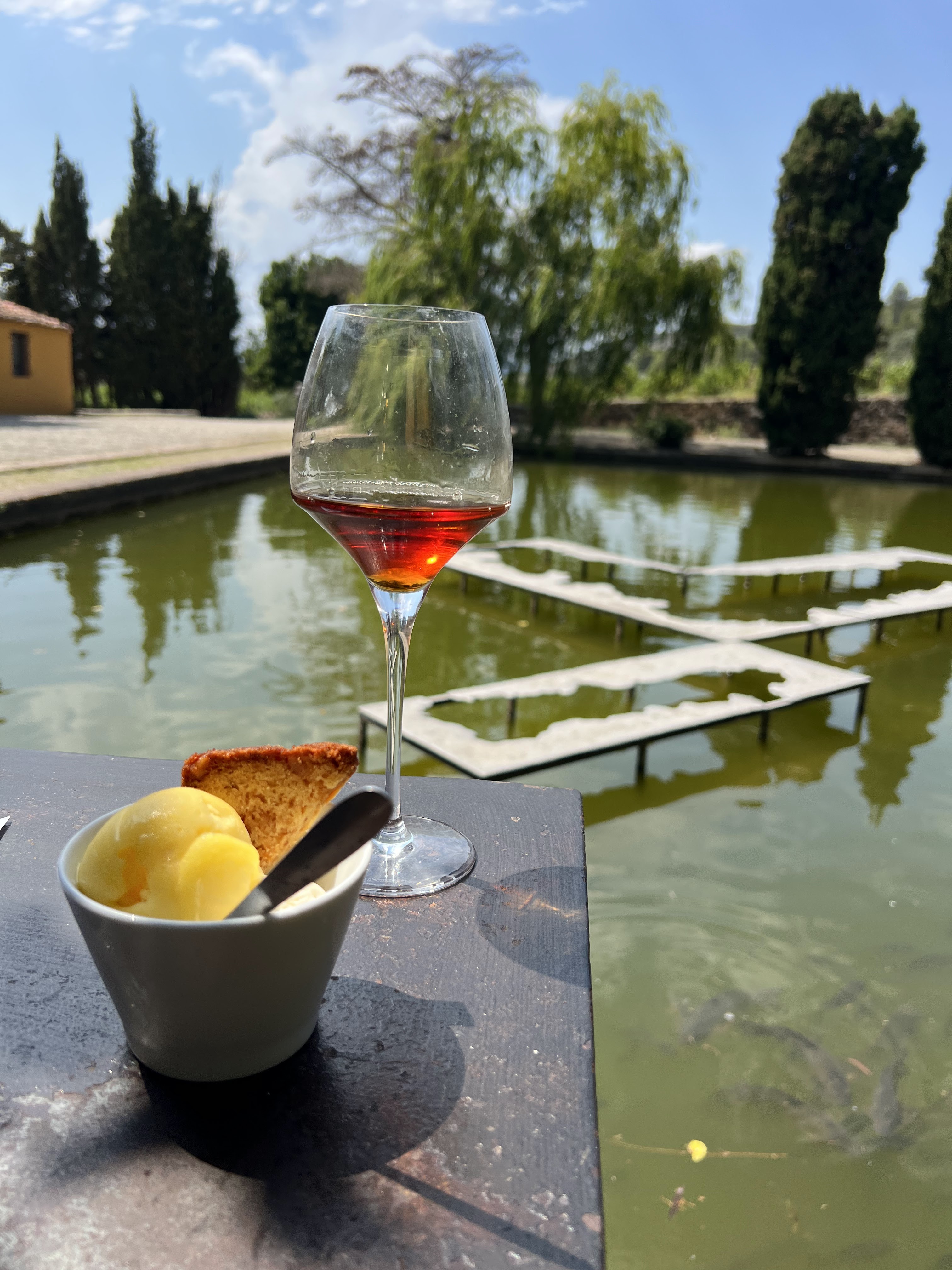 Très joli moment à cette table près du bassin, sous le murier multi centenaire, pour apprécier un repas de grillades typique catalan avec du temps pour découvrir et apprécier 8 des vins du chateau.