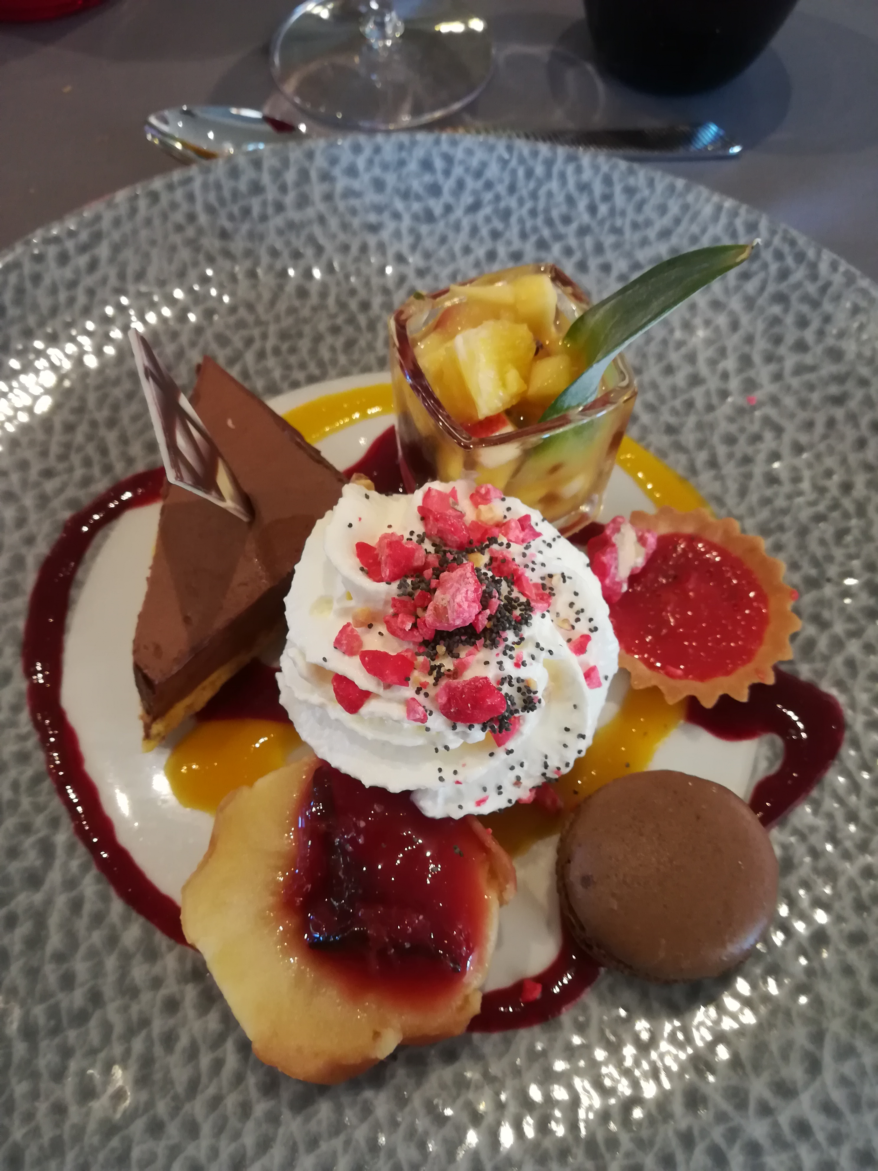 Une ambiance sympathique et un menu excellent. Certes il s'agissait d'un menu de fête : Cocotte de queue d'écrevisse et petits légumes en croûte, sorbet citron vert/vodka (le trou normand en quelque sorte), petites cailles farcie aux champignons des bois, foie gras et son flan de courge (moi qui n'aime pas la courge j'ai trouvé cela délicieux)-cabosse de chocolat noir au cœur de caramel et noisette sur son coulis de poire au miel...Nous avons accompagné le tout d'un petit chablis agréablement minéral et d'un rouge étonnant (très fruité, boisé aussi, assez puissant) dommage que je ne me souvienne pas du nom. Un très bon moment entre amis.