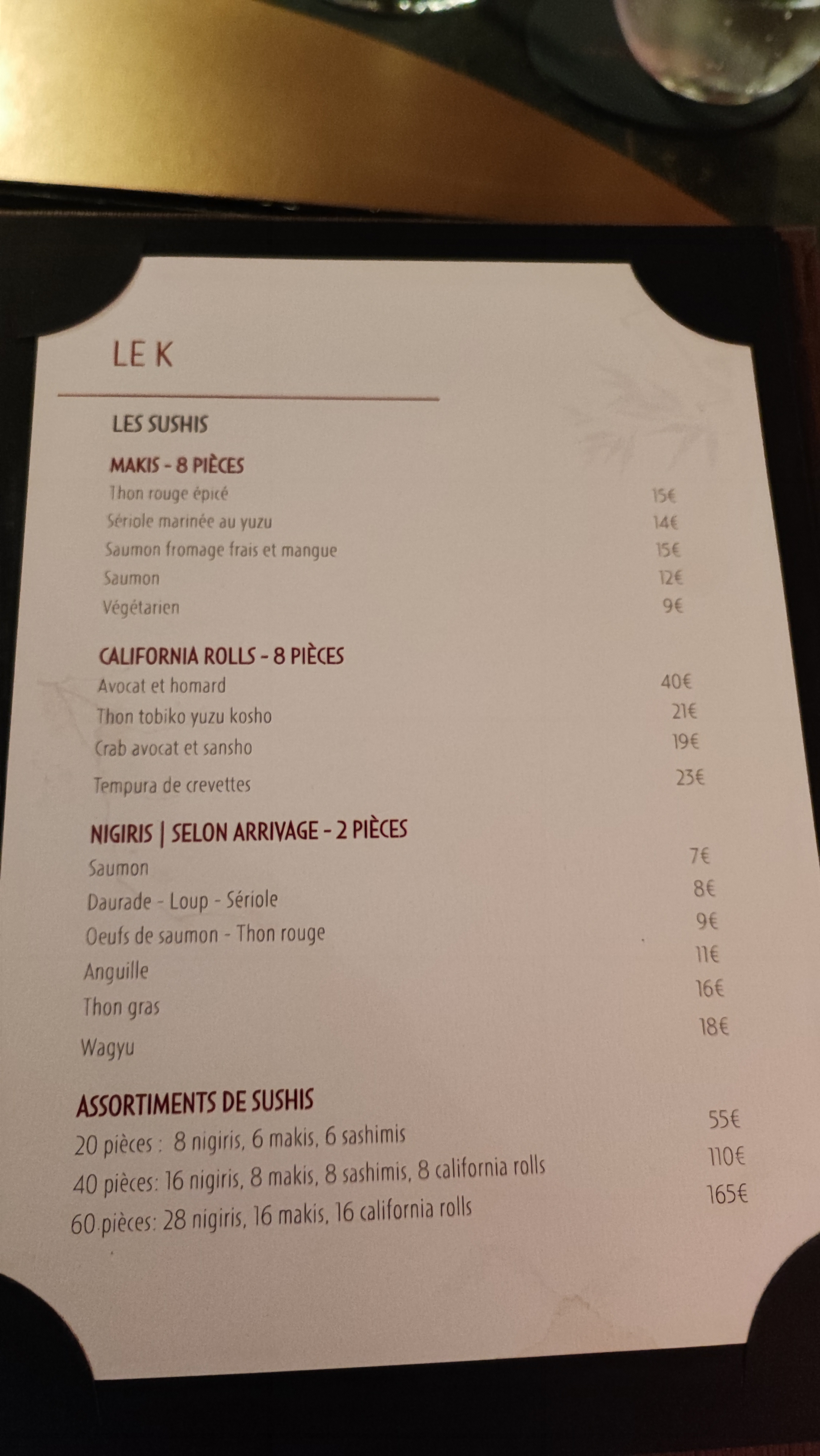 Bonjour, mon épouse et moi-même avons fait la brasserie du K cuisine japonaise au château de la Gaude. Nous sommes fan de cette cuisine que ce soit maki sushi California... Déjà le cadre exceptionnel le service remarquable et la cuisine comme une signature sur une œuvre d'art. Je n'ai jamais mangé d'aussi bon makis, le riz premium exceptionnel le gingembre je pense que c'est la première fois que j'en goûte on va dire aussi bon le wasabi on aurait dit de la poudre que je mettais dans ma sauce soja. Deux très bon cocktails. L'émietter de crabe était bien garni. Pour moi il manquait du craquant sur le caviar seule fausse note du repas. Prochaine étape le gastro japonais Delphine et Pascal.