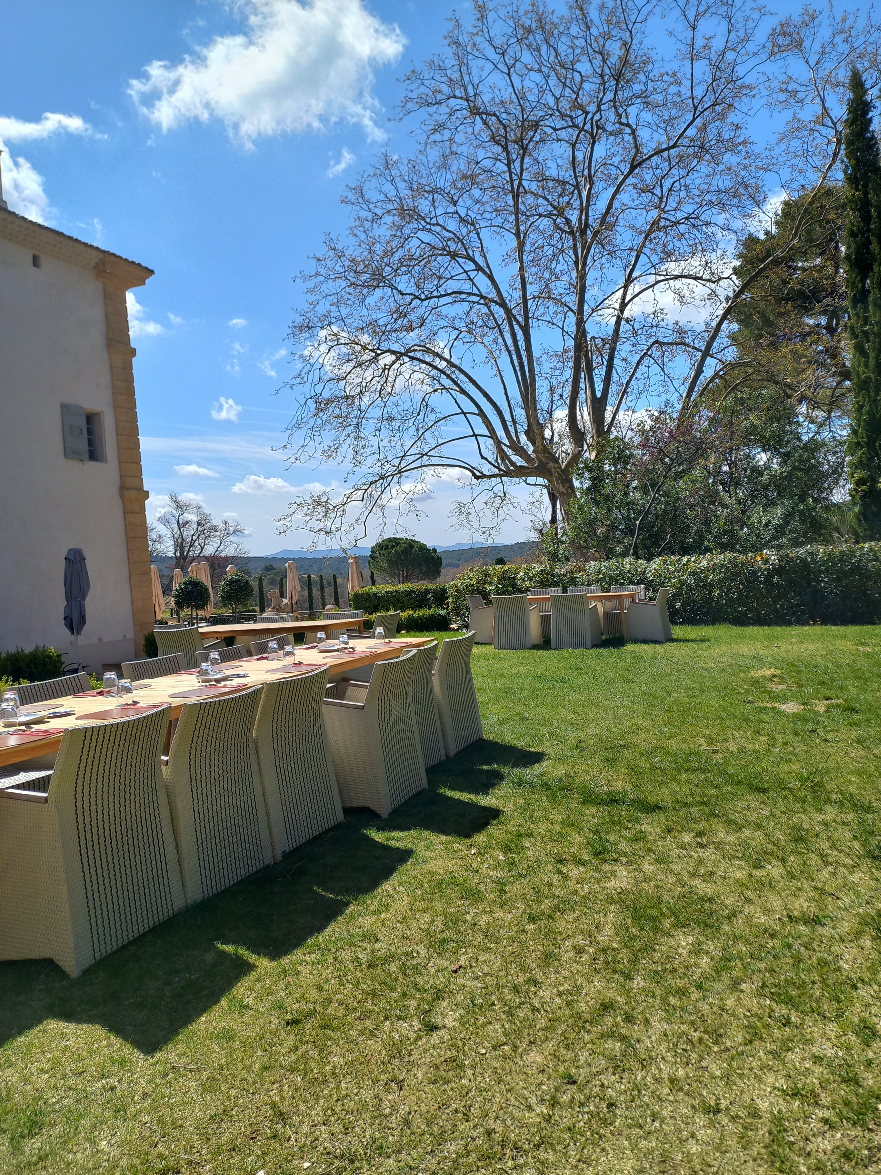 Nous sommes allés déjeuner au restaurant gastronomique. Ouvert depuis peu de temps c'est une devenu une étape gastronomique indispensable. Un cadre naturel dans la campagne aixoise exceptionnel, une décoration luxueuse de haute volée, des plats très raffinés, du vin du domaine, un service impeccable et un personnel sympathique. Le premier menu a un bon rapport qualité prix à 95 Euros . Un des menus monte à 250 Euros...à réserver aux très grandes occasions !