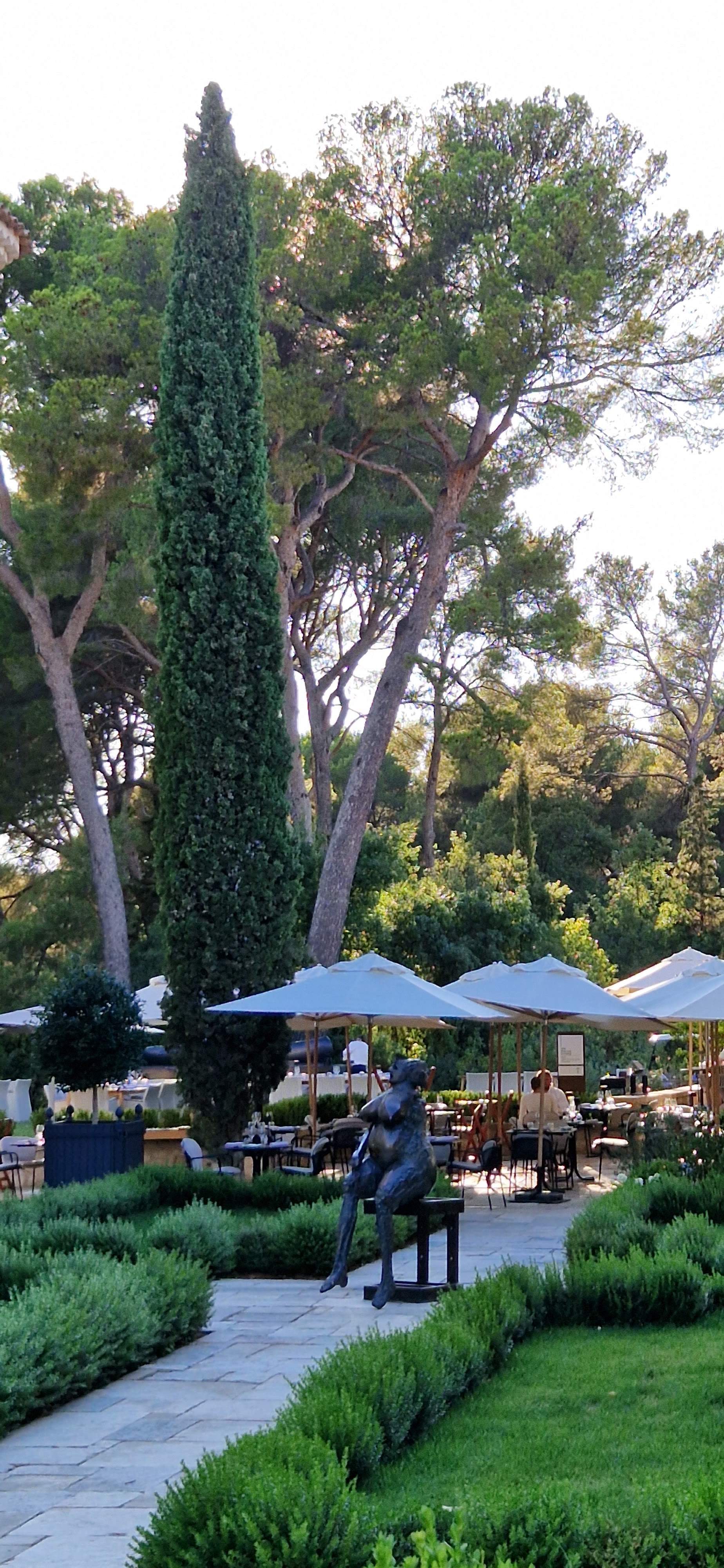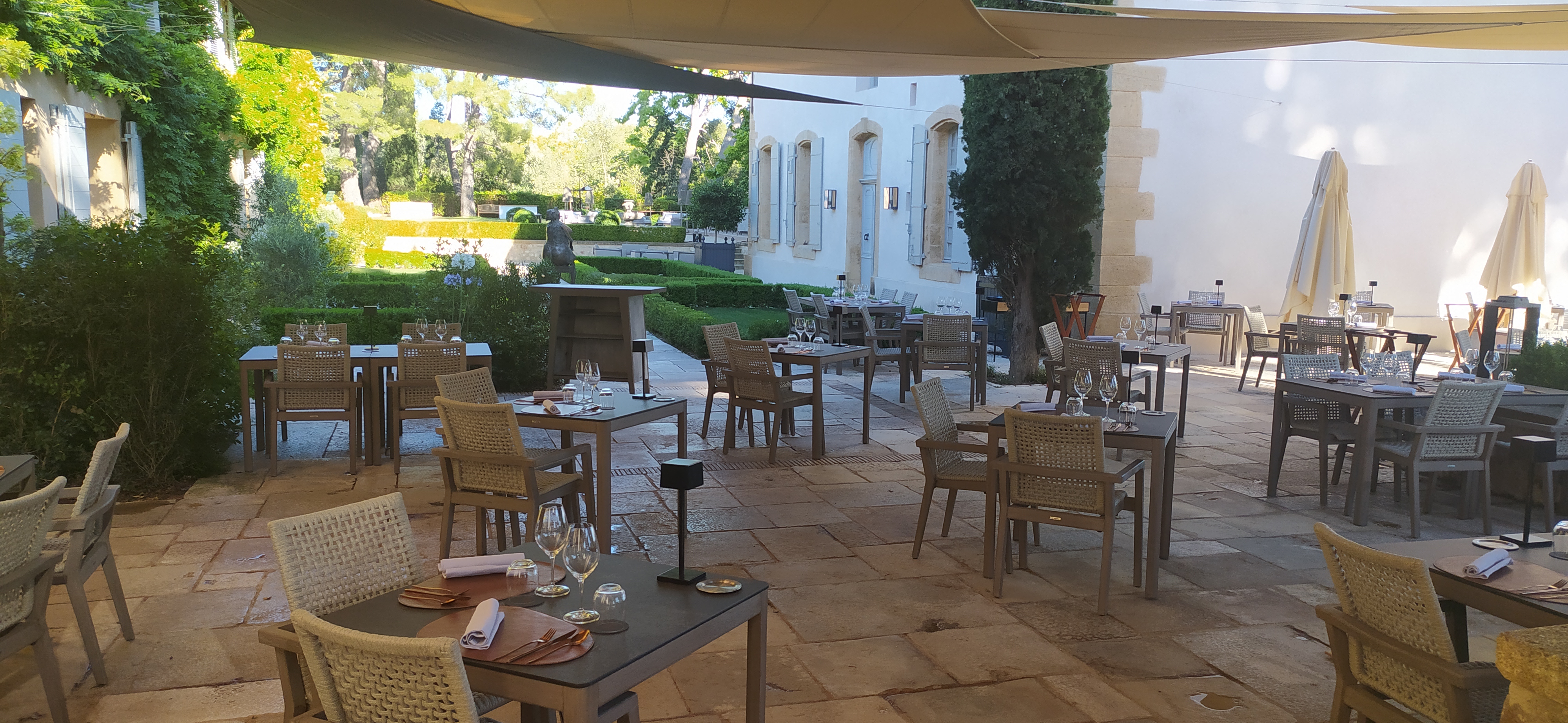 Dîner au restaurant La Source. Très beau restaurant, lumière tamisée, ambiance classe et repas sous une toile aménagée. Les tapas (apéritif) sont bons, cocktails originaux avec les plantes du jardin. Les plats sont de qualités, on y mange très bien. Madeleine en Or à partager pour le dessert (26 euros). Petit bémol, pas possible de visiter les jardins ni de les voir. La vue est accessible uniquement en mangeant au restaurant gastronomique. De plus, seulement certaines chaises sont équipées de coussins... chaise pas très agréable et fait mal aux jambes lorsqu'on porte une robe.