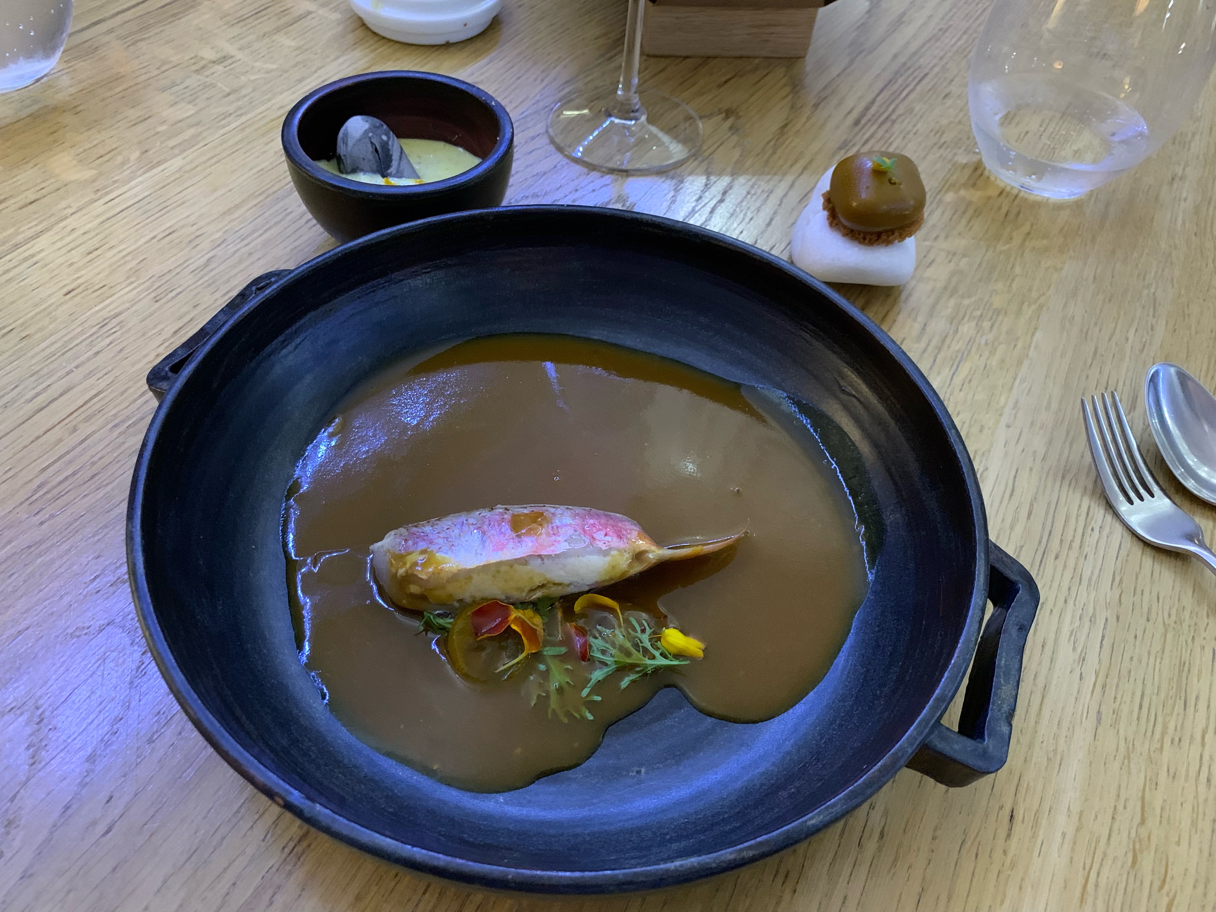 Un feu d’artifice qui explose en bouche et fait briller nos yeux ! La cuisine du chef est une montagne russe gustative. Dans un même plat Il arrive à exaucer les saveurs des produits les plus simples, mais il peut également nous surprendre avec un aliment qui révèle des saveurs totalement inattendues. Tout cela dans un cadre historique et avec un personnel très singulier. Nous avons passé un magnifique moment que nous ne sommes pas prêts d’oublier !