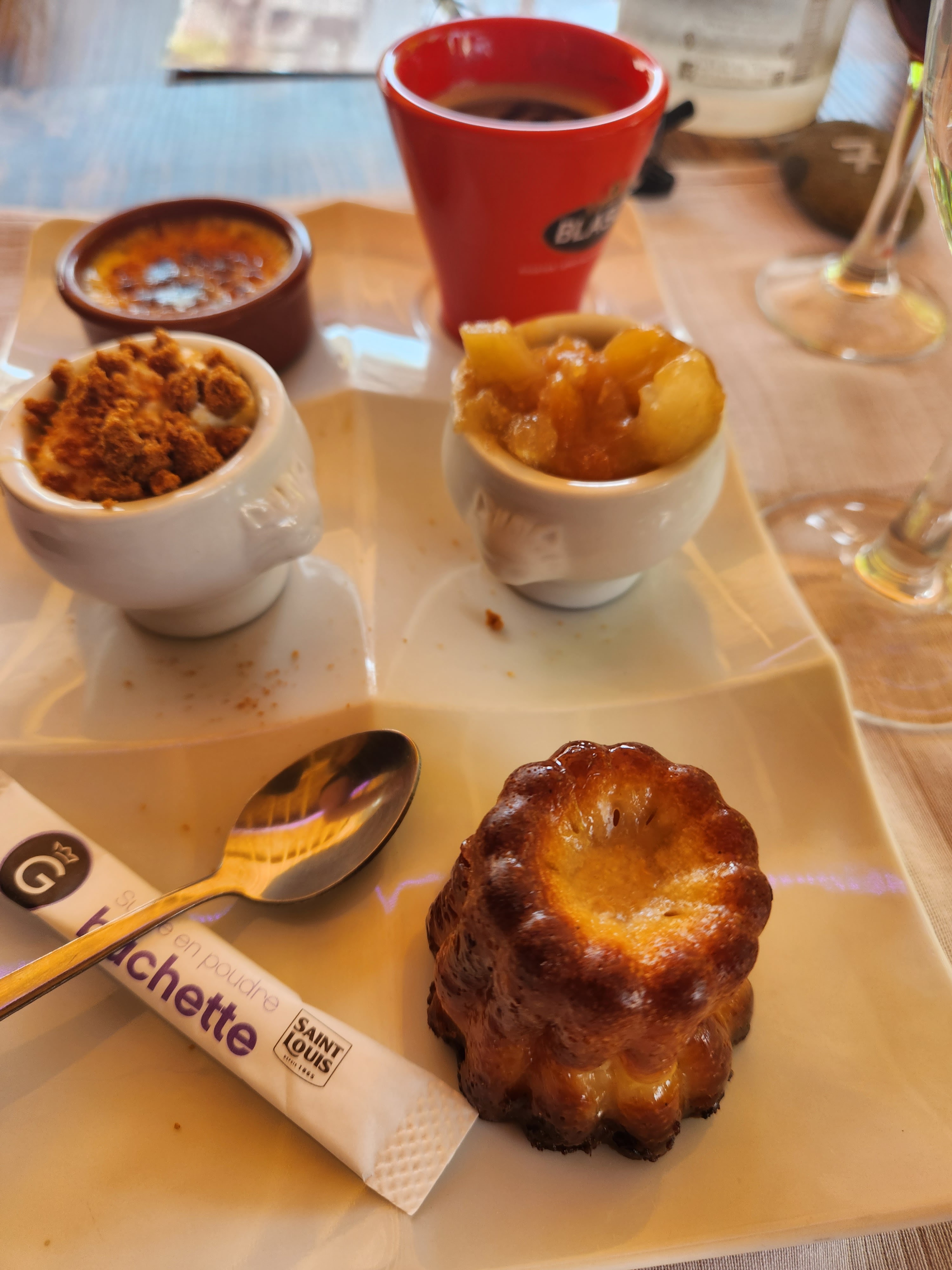 Midi entre amies, première fois, j'ai beaucoup aimé le cadre , les veilles batisses autour , la salle très grande , plus moderne. Apéro quelques olives et un feuilleté, plutôt sympa. J'ai choisi un hachis parmentier de canard ,à mon goût aucun intérêt, fade, sec, pas assez de canard , pas assez copieux . Dessert, des profiteroles, bonnes et généreuses. Le service classique, 4 personnes différentes durant le repas alors que très peu de monde, j'aime moins. Ensemble moyen, peut-être à retester...