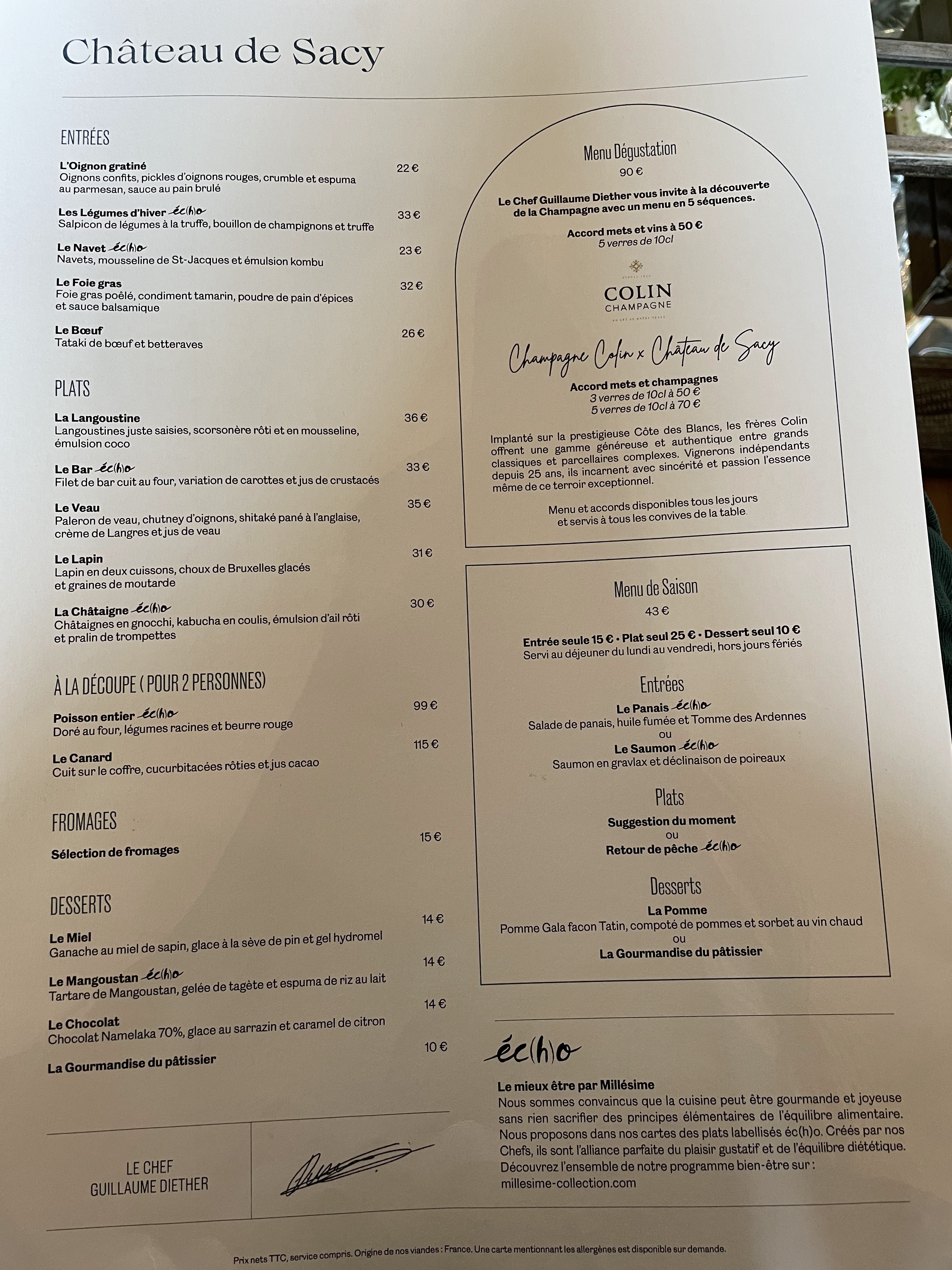 Une situation unique au milieu des vignes prestigieuses d’un coteau de la montagne de Reims. Le château de Sacy est un établissement superbe où l’on se sent chez soi, reçu par Kevin, maître de maison. Le restaurant propose des plats de haute volée, alliances créatives de saveurs fortes (un pithiviers de pigeon inoubliable), et la carte des champagnes est parfaite. Les chambres sont magnifiques. Je recommande fortement cet établissement de la chaîne Millésime.