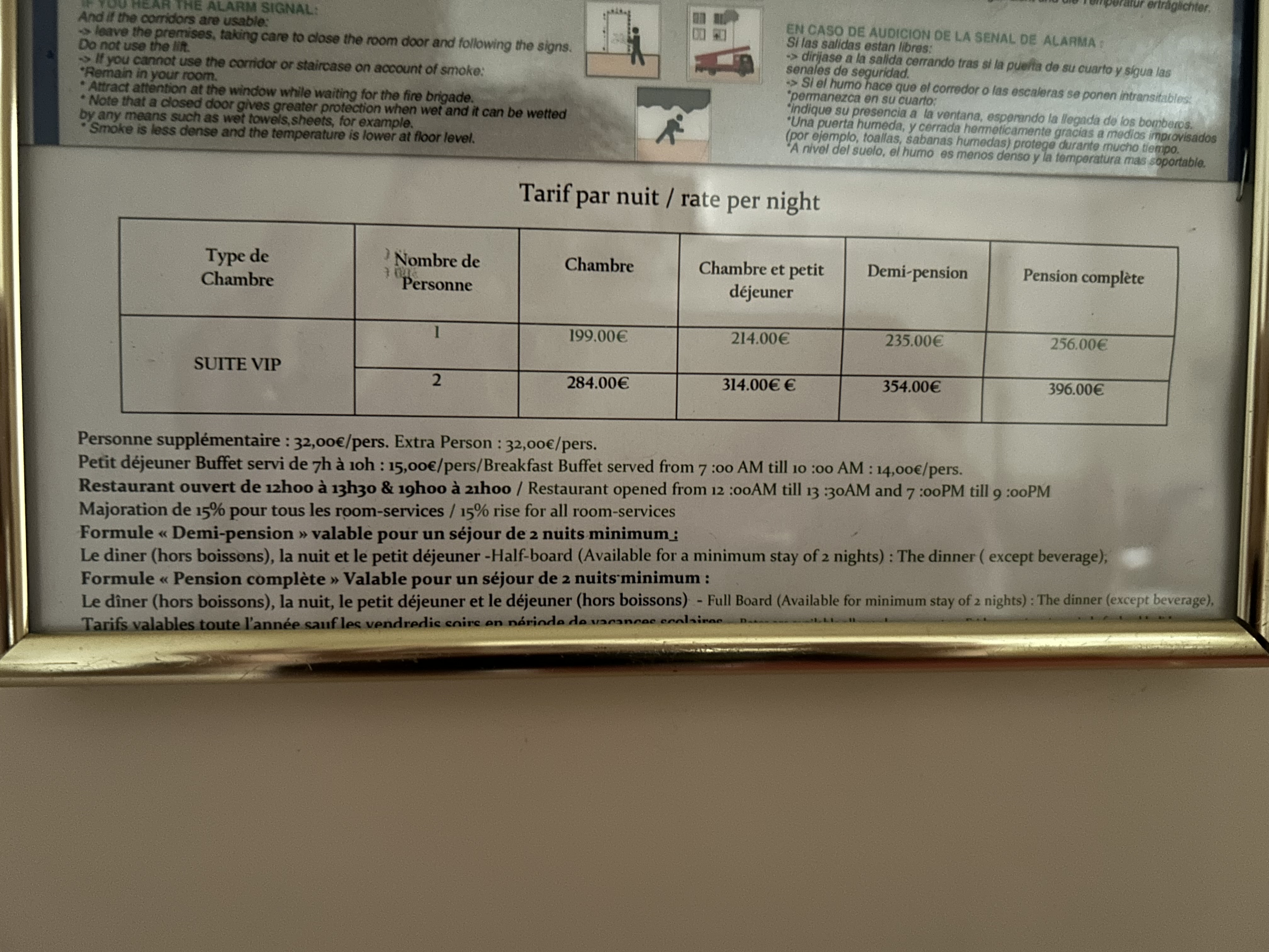 Le rapport qualité prix pour les chambres est injustifié. Certaines chambres sont considérées comme étant des chambres confort alors que les lits sont aussi dur qu'une planche de bois. Pour 128 euros la nuit, on s'attend à un minimum de confort. Rideau de douche dans la salle de bain et matériel très ancien. Quand à nous, infiltration d'eau dans la douche, on recevait toute l'eau du voisin dans la nôtre. En espérant que ce soit la douche... Cette chambre était considérée comme chambre de charme pour 158 euros. Ça ne les vaut pas du tout même si la qualité reste assez correcte. Pour ça, j'aurai mis 70-80 euros gros maximum par nuit. J'ai été vraiment déçue. Néanmoins le cadre reste superbe mais le prix est décevant...