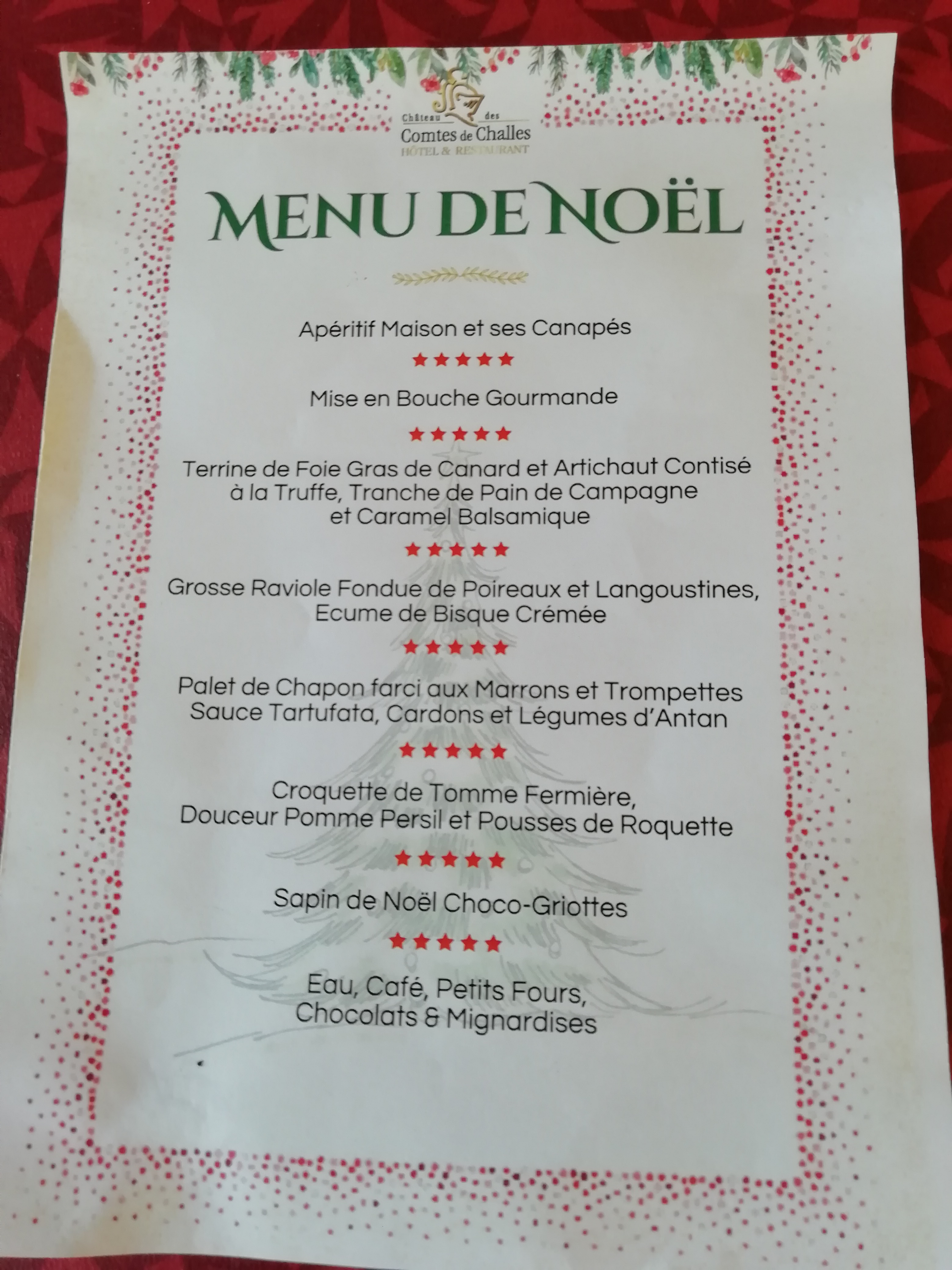 Nous avons participé au menu du réveillon. L'heure du repas était donné à 19h00. Comme la plupart des convives nous sommes arrivés à l'heure. Mais visiblement nous n'étions pas attendu à cette heure ci. Nous avons donc du patienter 1h00 dans le petit salon... Ce dernier n'était pas assez grand pour que tout le monde s'asseoit. Et nous n'avons eu droit a aucun rafraîchissement pour l'attente . Ceci dit le reste de la soirée était formidable. Le service était de qualité tout comme les mets et la bouteille de champagne. L'animation aussi était appréciable, présente mais pas trop. Merci au château des comtes pour cette agréable soirée de saint sylvestre