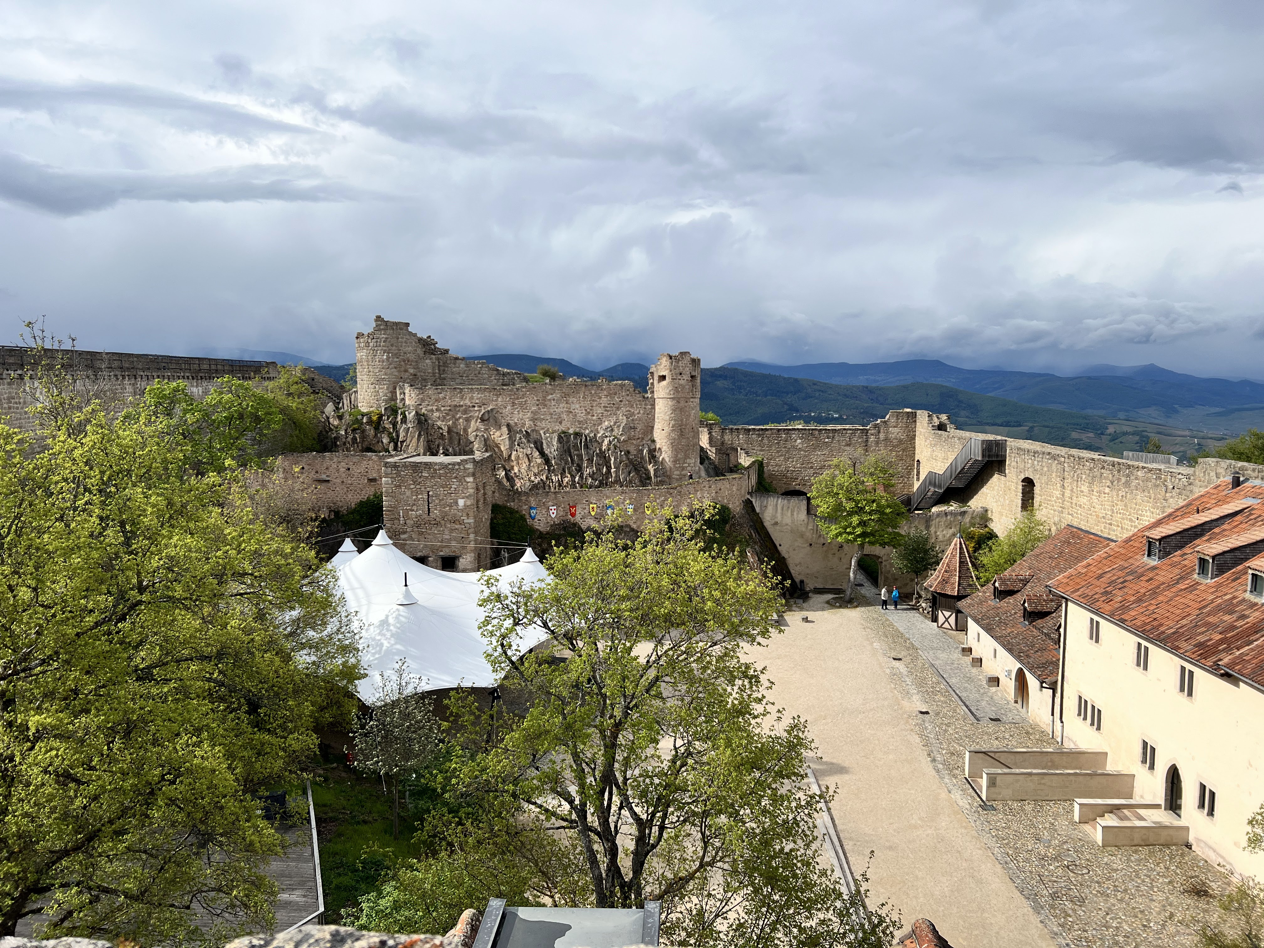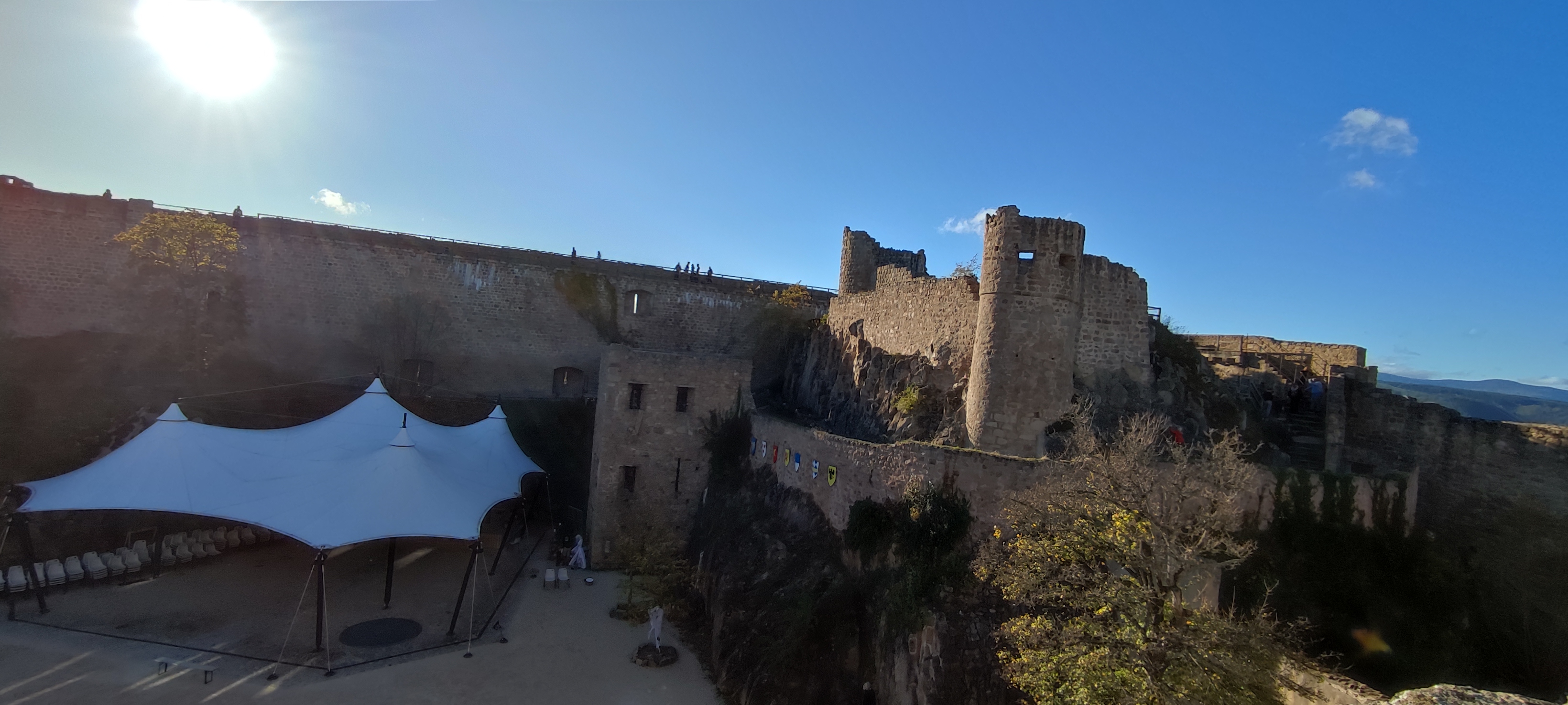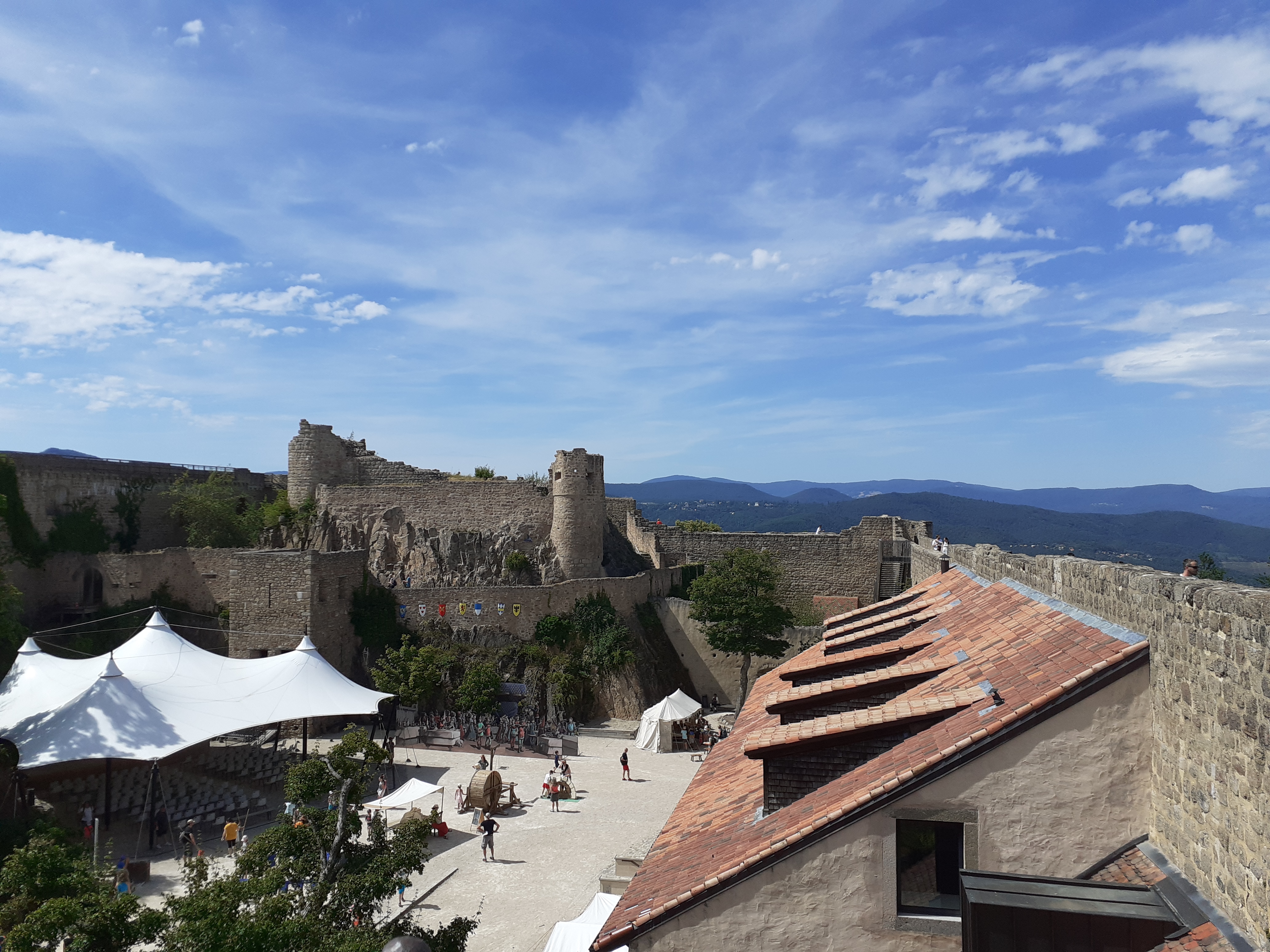 Joli panorama à 360 degrés depuis le château. Un bon moment grâce aux amis qui nous ont fait découvrir ce lieu . Il y a possibilité de se restaurer sur place dans la cour du château en saison. Ils ont un très beau chapiteau pour les spectacles.