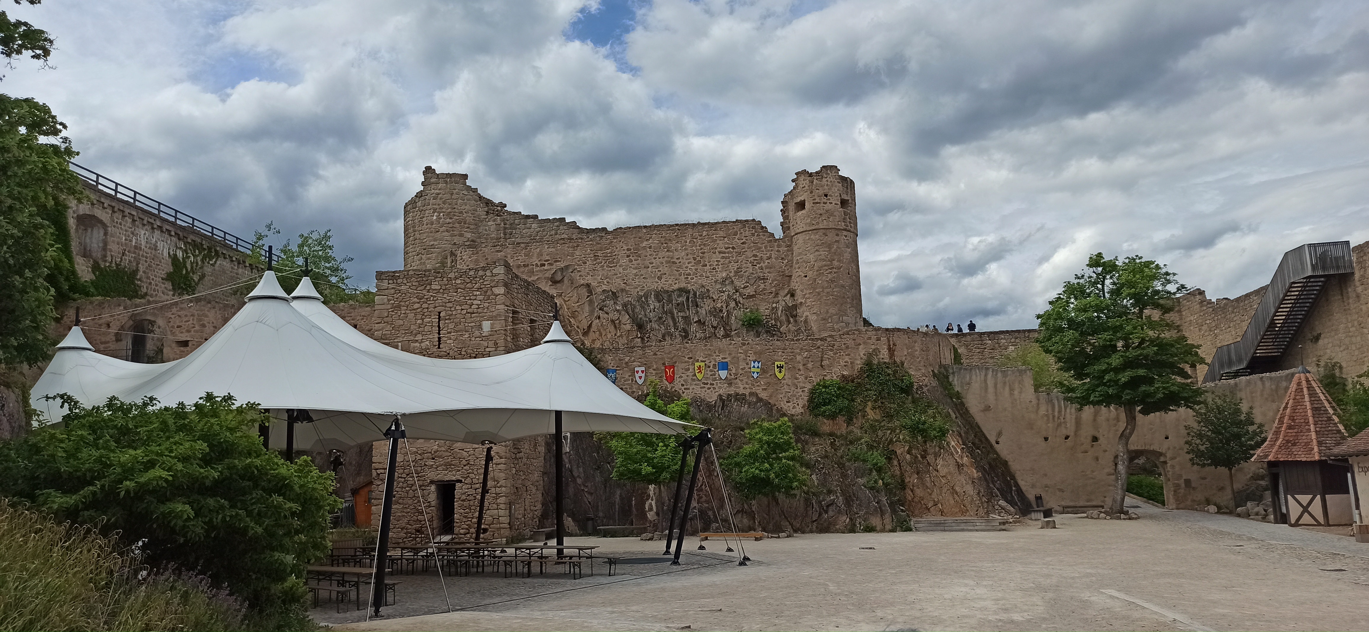 Je mets 3 étoiles pour le lieu en lui même, les ruines sont très bien entretenue , le cadre est magnifique et la vue splendide. Cependant ça ne justifie pas les 9,5€ d’entrée par personne. Visite de 2h ? Même en faisant bcp de photos on en est loin. Peut être idéal pour des enfants avec le spectacle … et encore. On nous refuse de boire un verre à la brasserie car c’est juste pour manger … je peux comprendre sauf que c’est canicule, qu’il est 13h30 bcp de table de libre et personne se bouscule pour prendre place ! Amateur de château comme nous passer votre chemin et pour le tarif privilégier le haut koenigsbourg.