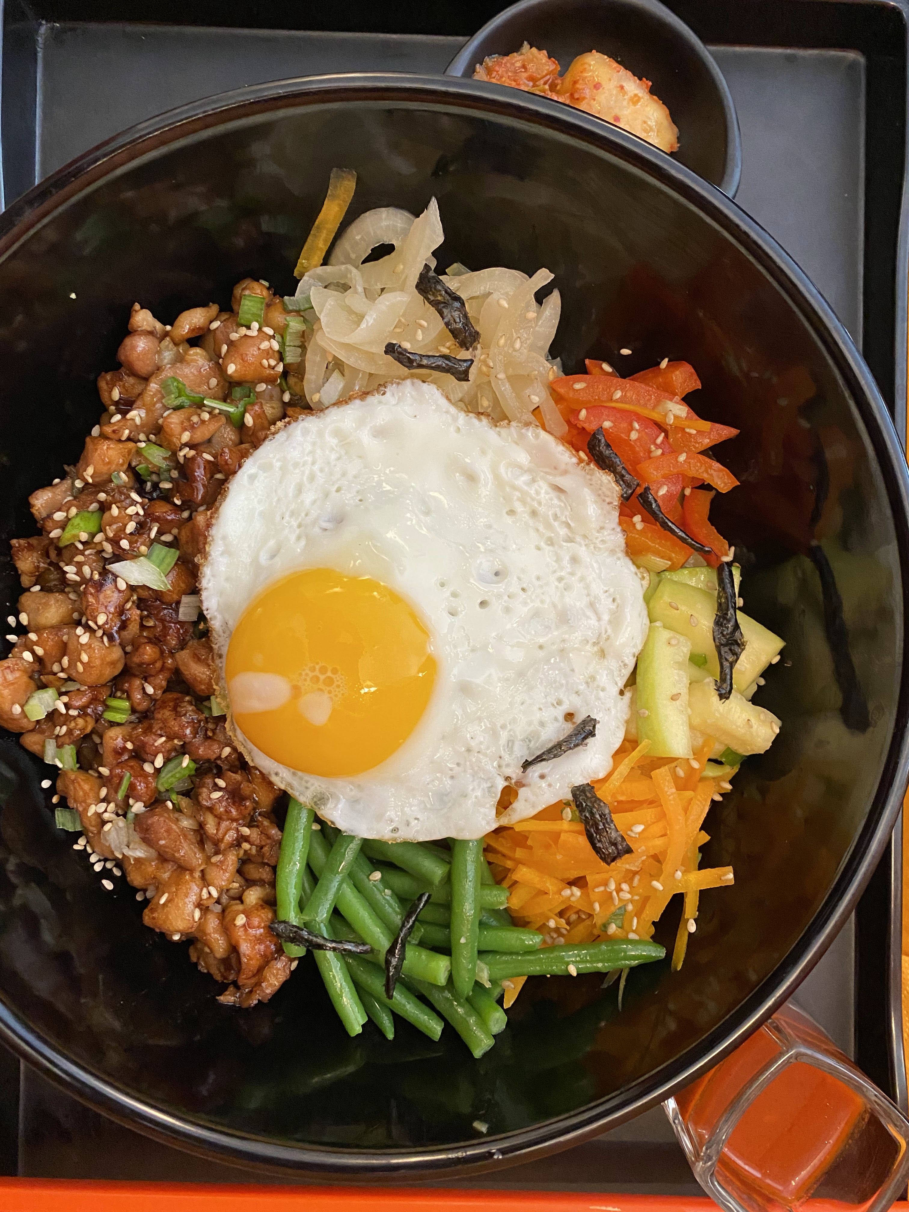 Le bibimbap est vraiment très tres bon. Plein de légumes frais. Servi avec kimchi et piment. Le top!