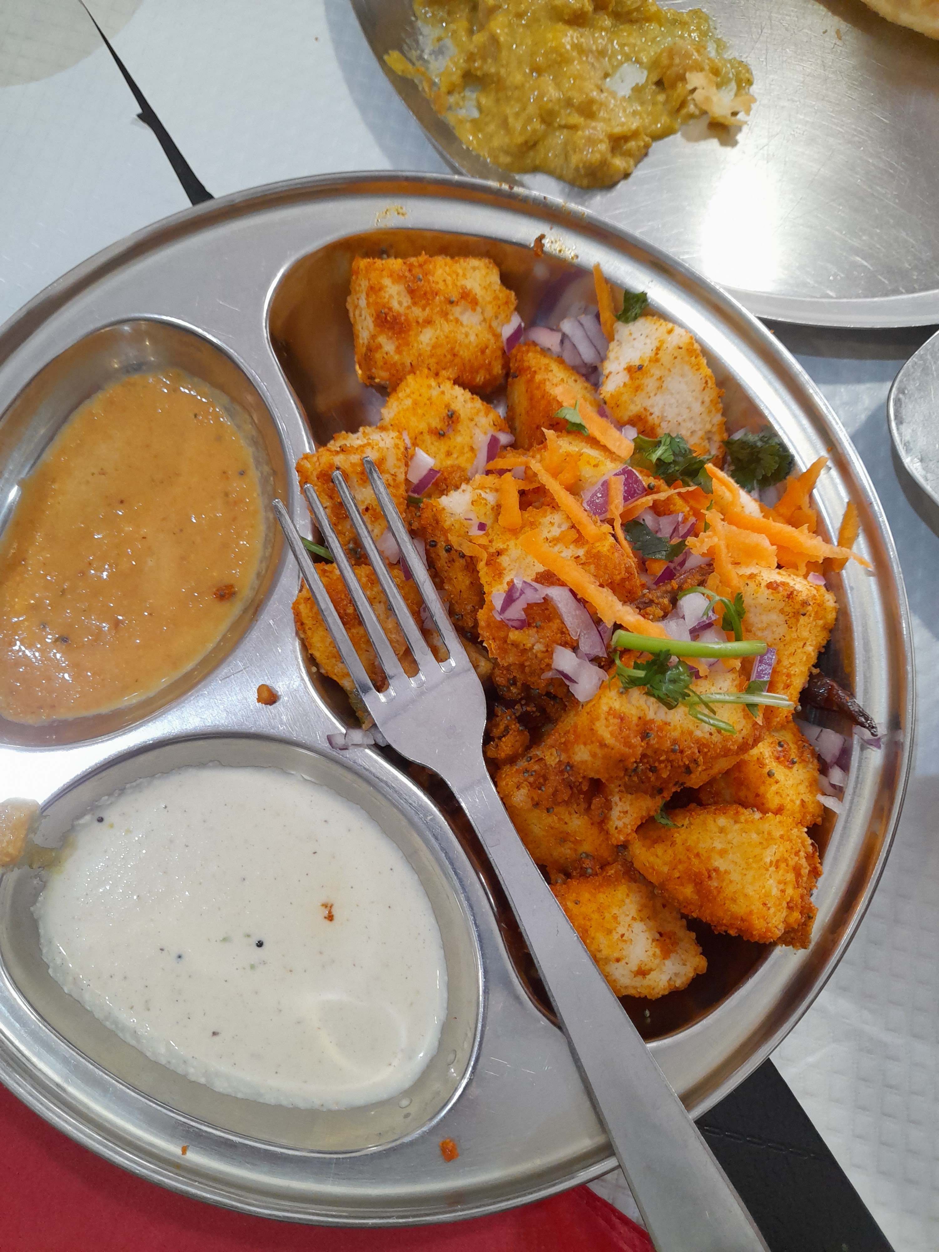 Il y avait Samosa / Vadai - Ils étaient chauds et savoureux. Le service était rapide. Pour emporter, j'avais commandé du Dosa, c'était bon. J'avais commandé du Paneer 65 mais j'ai reçu du Gobi manjuri, il était épicé avec plus de poudre de piment. Cela pourrait être réduit.