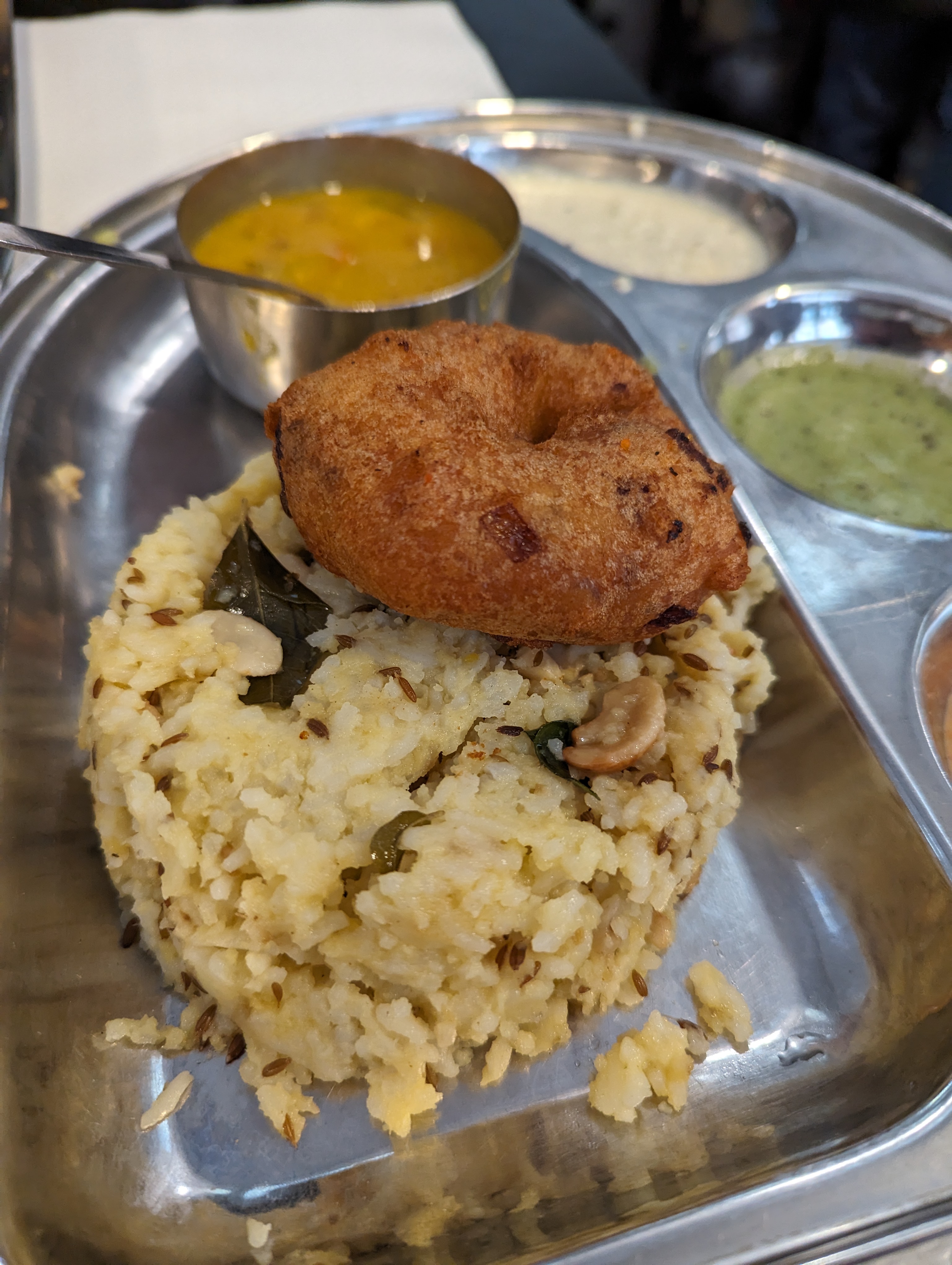 Je suis allé plusieurs fois dans ce joli restaurant du sud de l'Inde à quelques minutes à pied de la gare du Nord lors d'une récente visite à Paris. Les vadas avaient le goût de faire maison en Inde. Dosa et uthappam étaient également très bons. Les chutneys étaient aléatoires (chutney vert), même si le sambar était toujours au rendez-vous. Le service est sympathique. Le prix est bas.