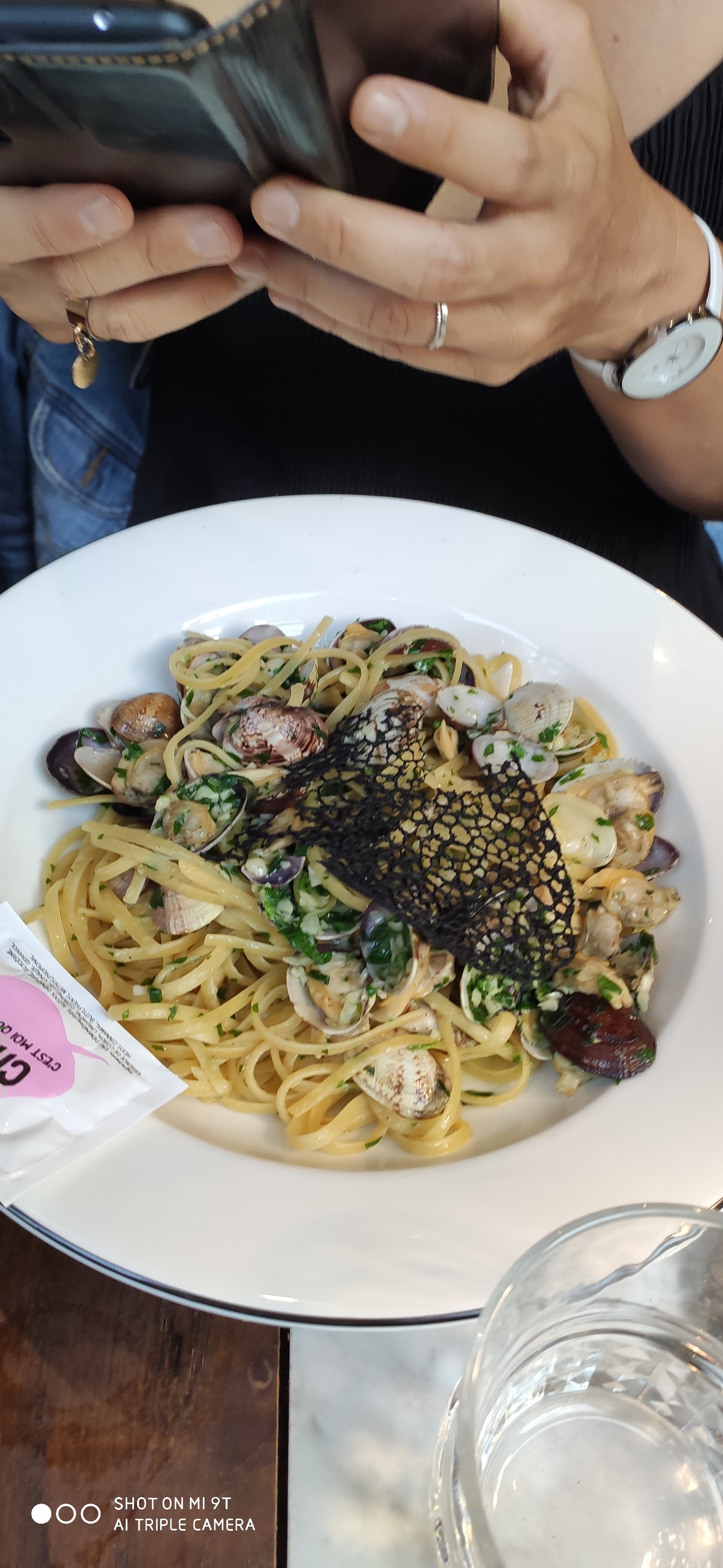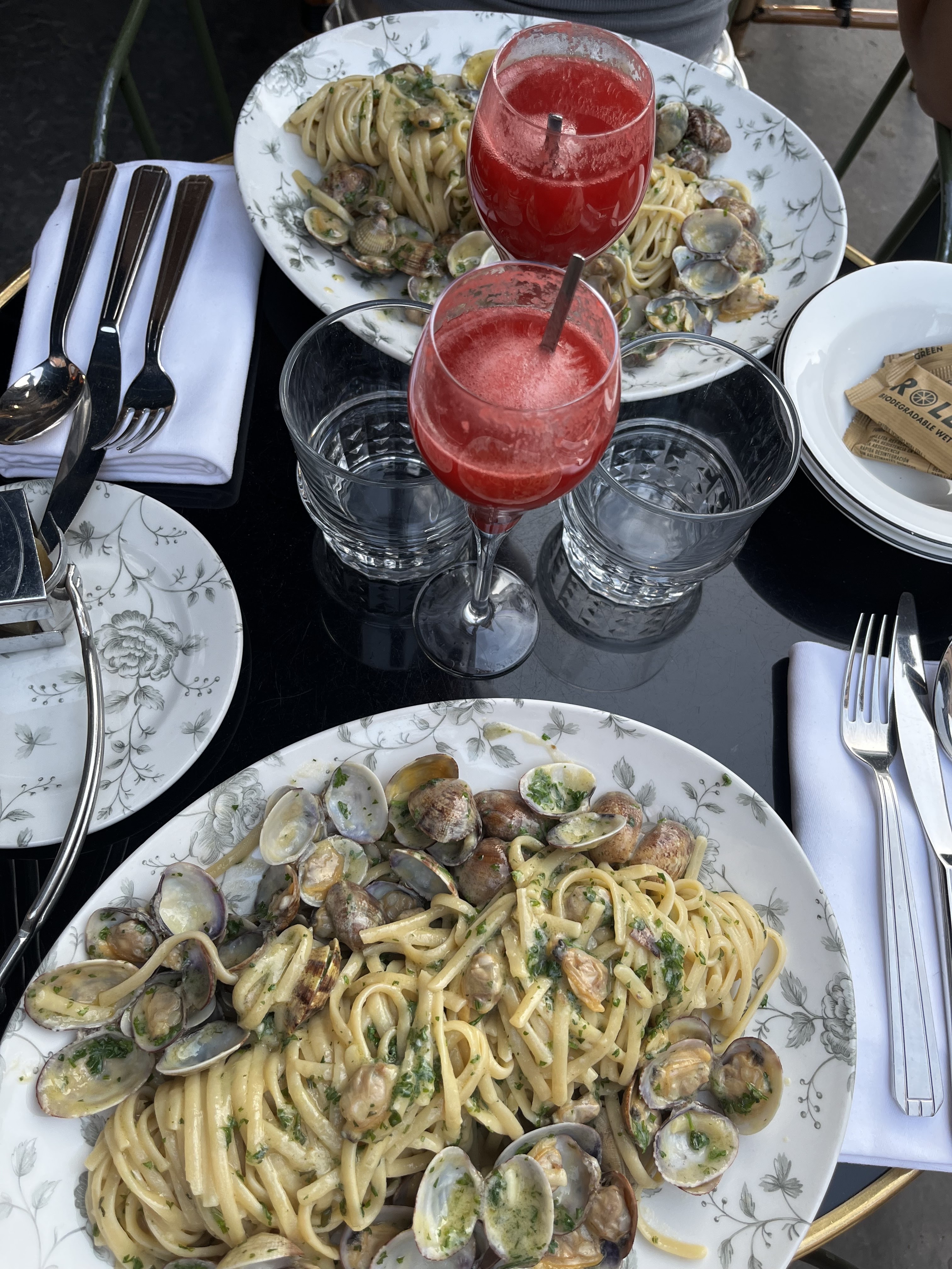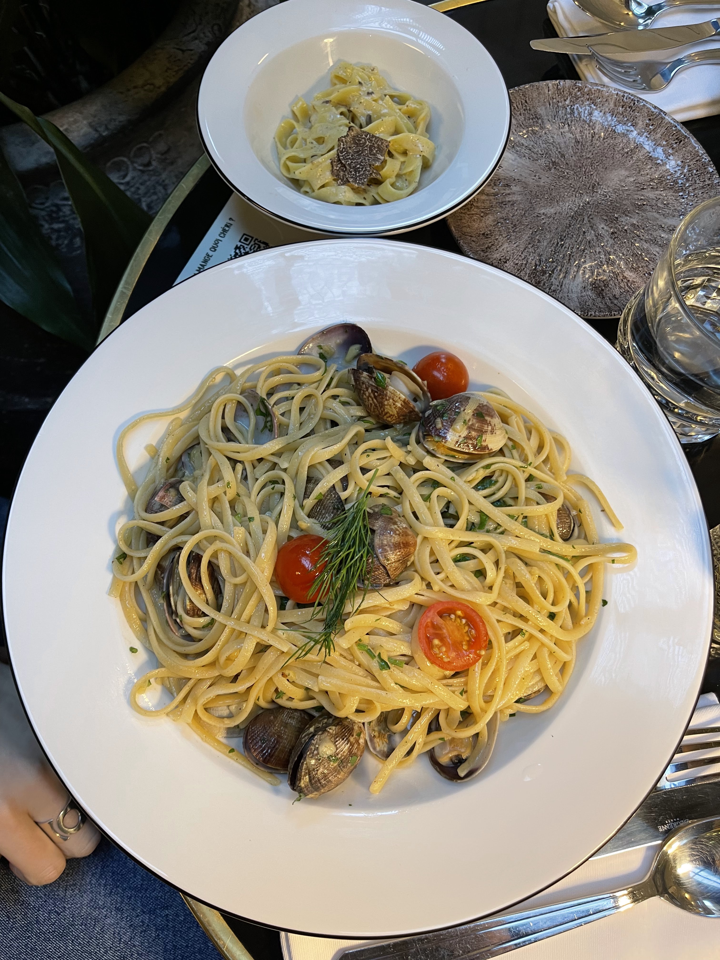Cadre élégant, un brin vintage, j'adore. Service sympathique et efficace (important pour le créneau du déjeuner). Nous avons choisi des Pâtes alla Vongole et des pâtes aux truffes. Et le bonus ??? Un échantillon du plat de l'autre dans un bol pour goûter 😍. J'ai déjà prévu de revenir !