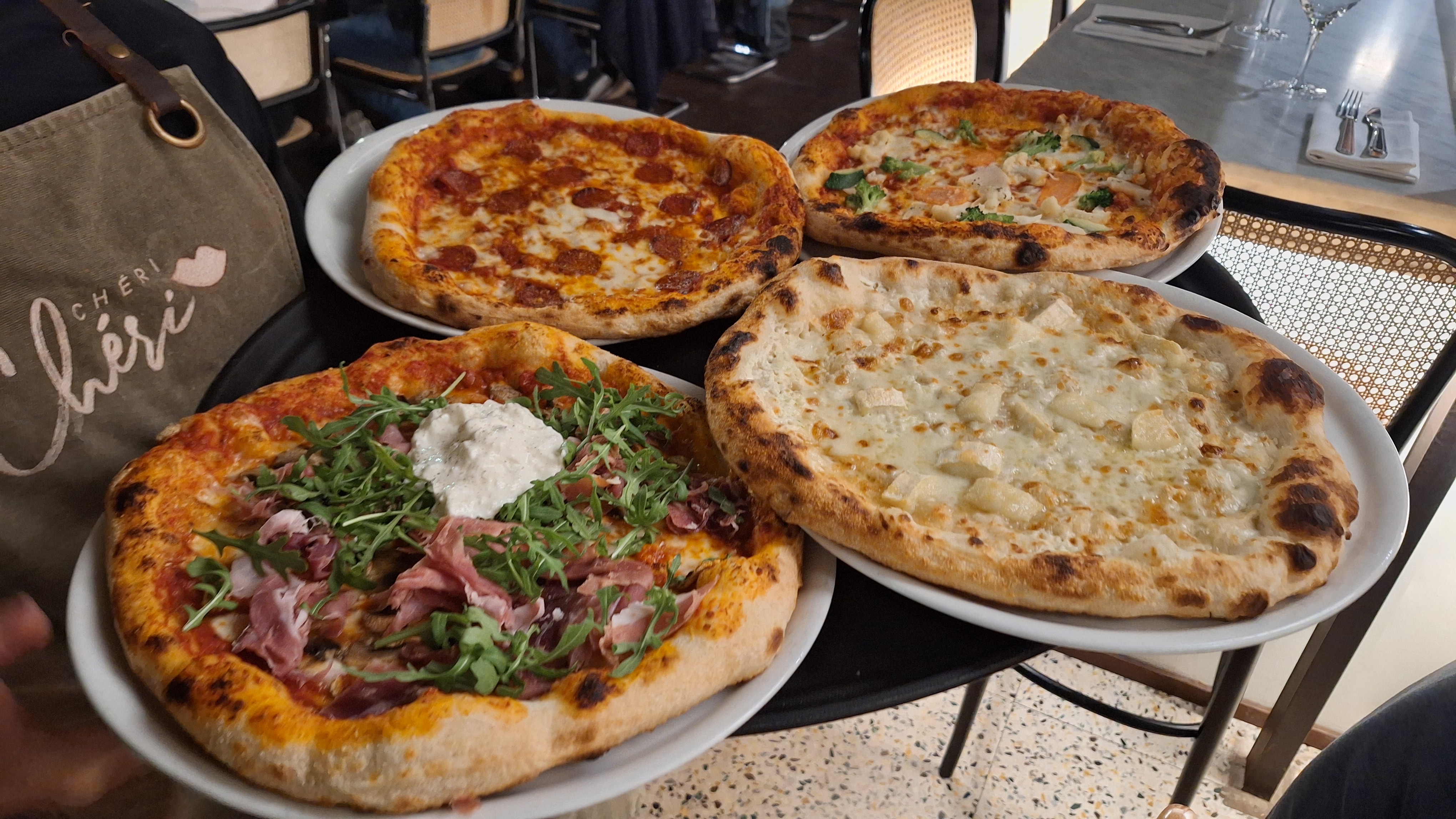 On entre pour la déco et on revient pour les pizzas. La pâte est excellente, les produits sélectionnés. Pour ce soir pizza Mitica avec son pesto rouge, sa mozza moelleuse, son jambon blanc (18€)...accompagné d'un valpocicella avec sa pointe d'amertume (6€) mais j'aurais pu me laissé convaincre par la carte des cocktails. Le PLUS : pour les plats, une petite assiette du même plat accompagne la vôtre pour faire goûter à Chéri Chéri . Dans la salle succès pour le big Chéri burger et son bœuf haché maison et pommes allumettes. Enfin et pas des moindre, accueil tres pro.