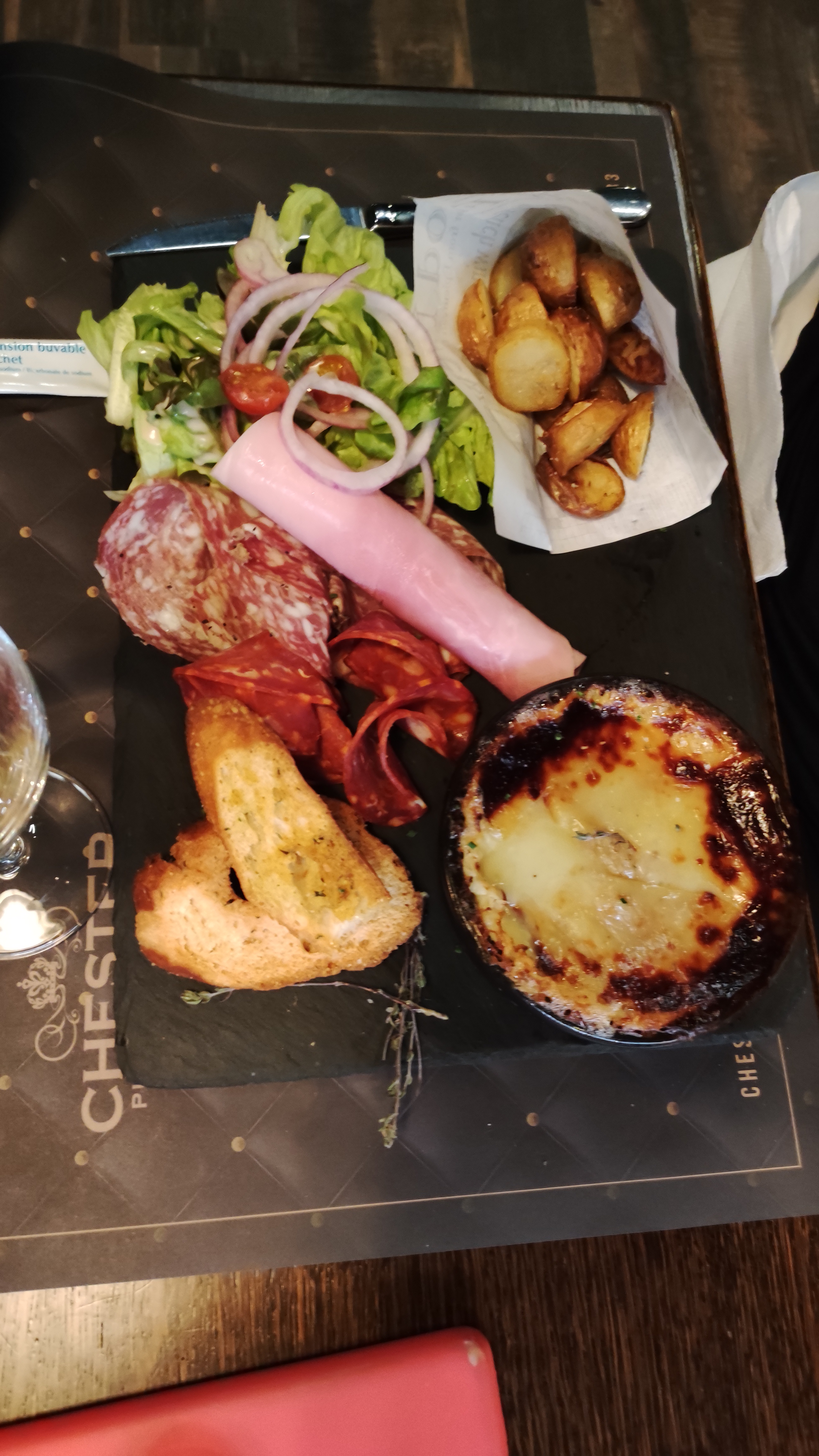 Planche de charcuterie/fromage accompagnée d'un verre de vin ou d'une bière. Parfait pour passer un moment agréable entre amis. Endroit accueillant, service agréable et rapide.