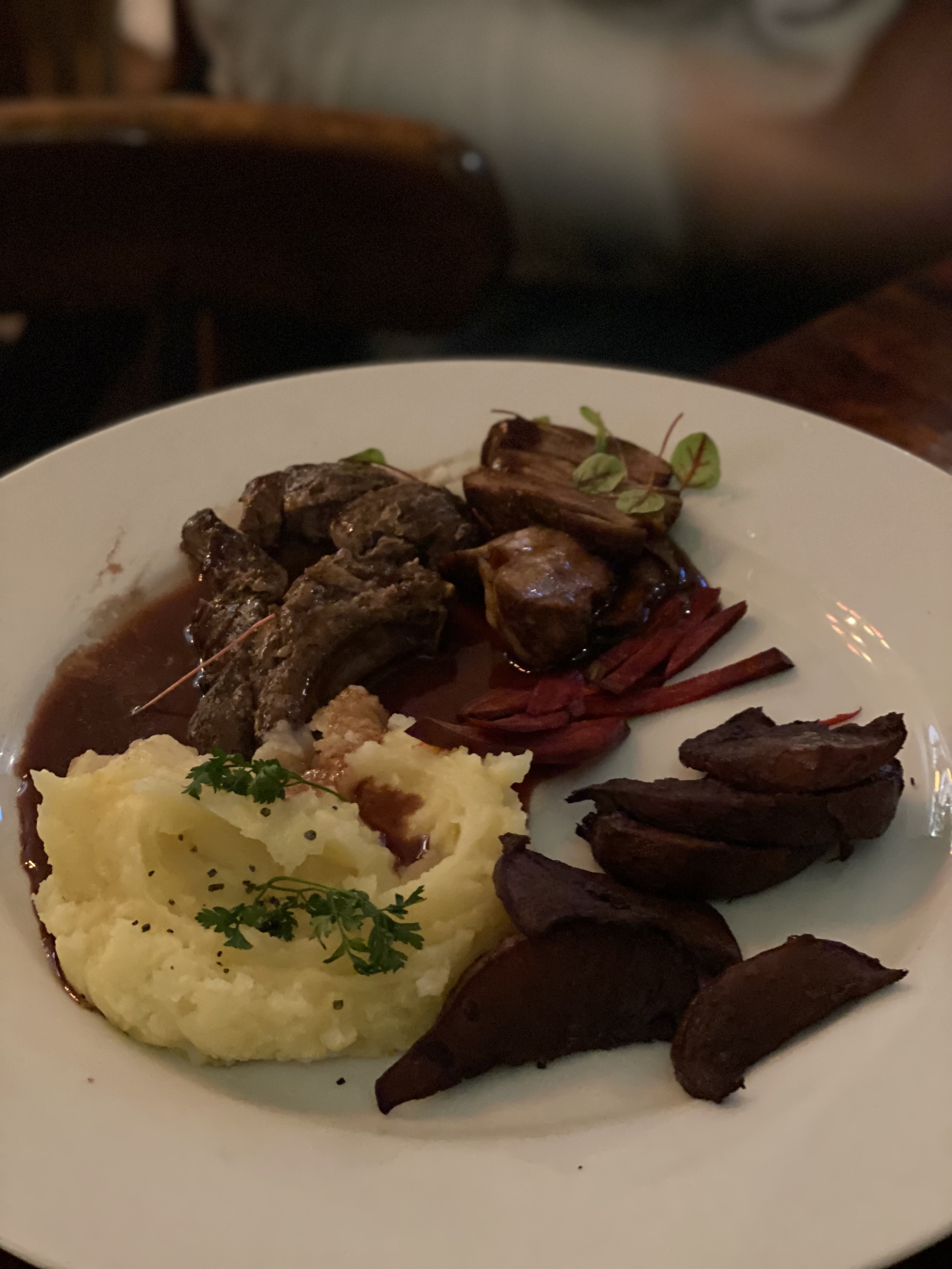 La nourriture a mis beaucoup de temps à arriver. Il n'y avait qu'un seul serveur et un chef, donc c'était en sous-effectif. Je ne sais pas si c'est habituel ou si c'était une chose ponctuelle. J'ai commandé le poisson et j'ai été un peu déçu. C'était un plat très simple, un morceau de poisson Cabillaud et 2 carottes, très simple, mais coûtait 20 €. Du côté positif, l'entrée était très bonne (quelque chose avec du fromage et des épinards), le vin était excellent et le personnel était super sympa !