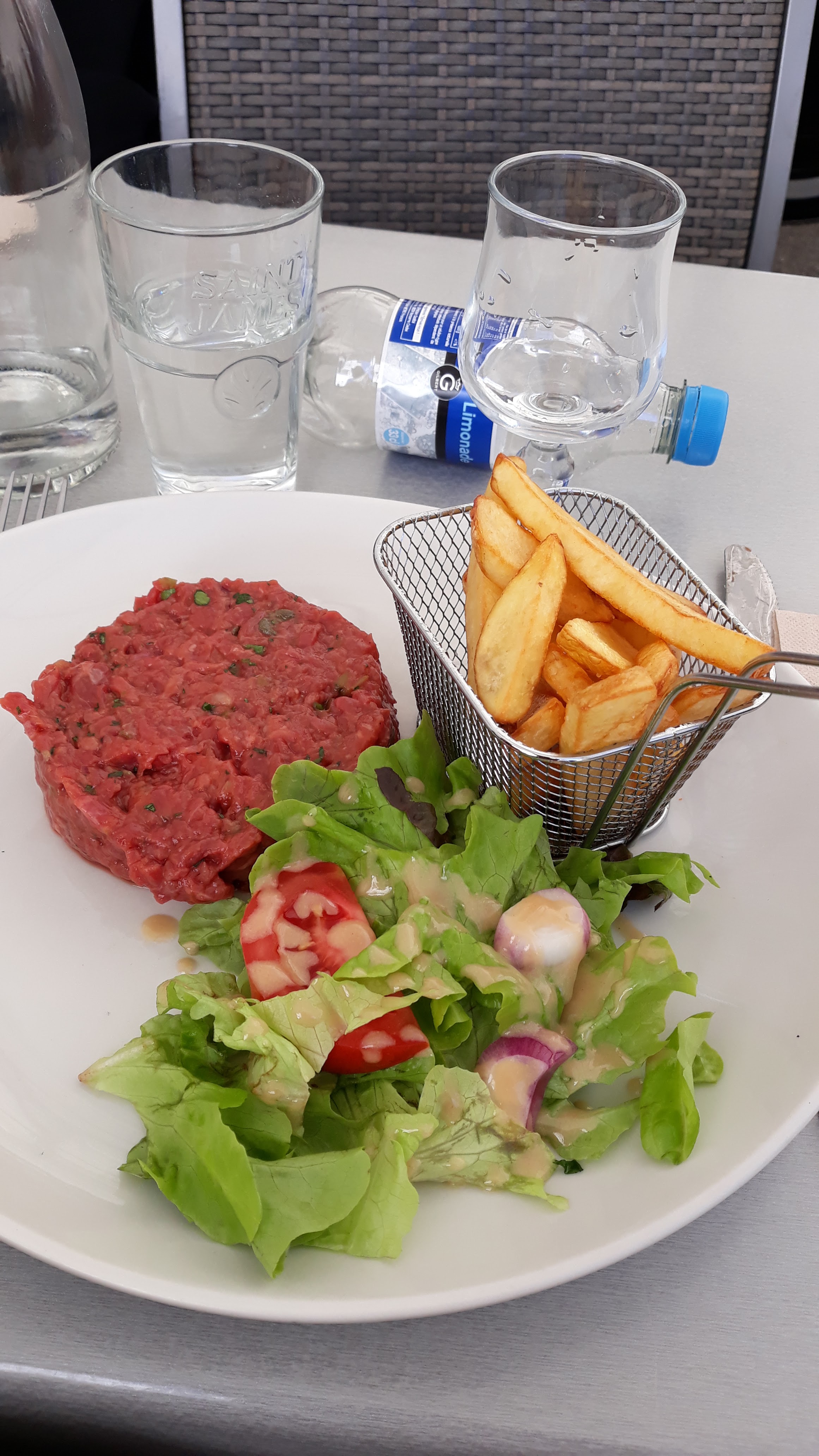 Bonne ambiance,le responsable est agréable et présent pour ses clients.sur un groupe de 9, tous ont apprécié (canard confits , pièce du boucher, poisson cuit a point mais manque légèrement un assaisonnement au 🍋..),correct..