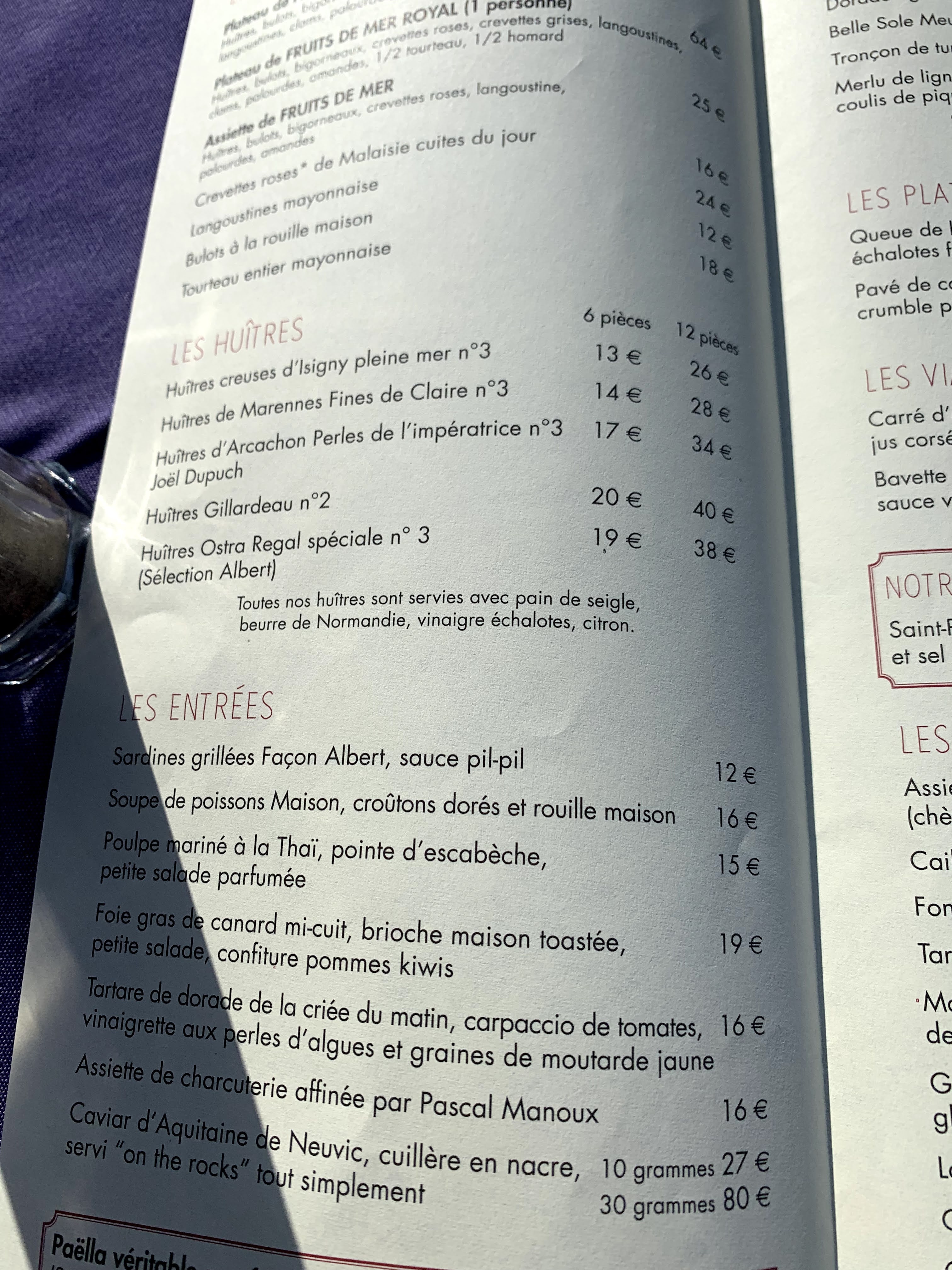 Quand vous arrivez à biarritz et que vous recherchez un restaurant de poissons, Chez Albert arrive dans le top 3. Ok , on décide d’y manger et coup de chance on arrive à avoir une table en terrasse !! Au menu, huîtres, turbo et thon mi-cuit, vraiment excellent !! Les desserts sont fait maison et les parts sont généreuses !!! Si vous aimez les fraises, vous aimerez sa tarte!! La profiterole est généreuse aussi ! Nous avons passé un bon moment !! Allez-y !!