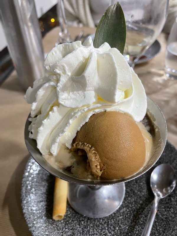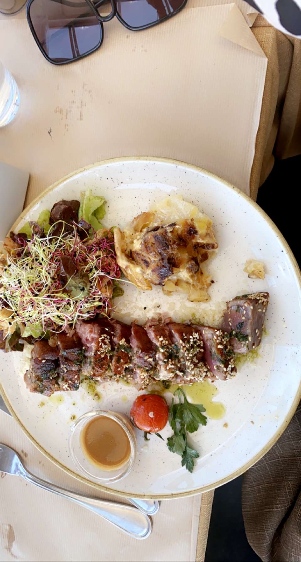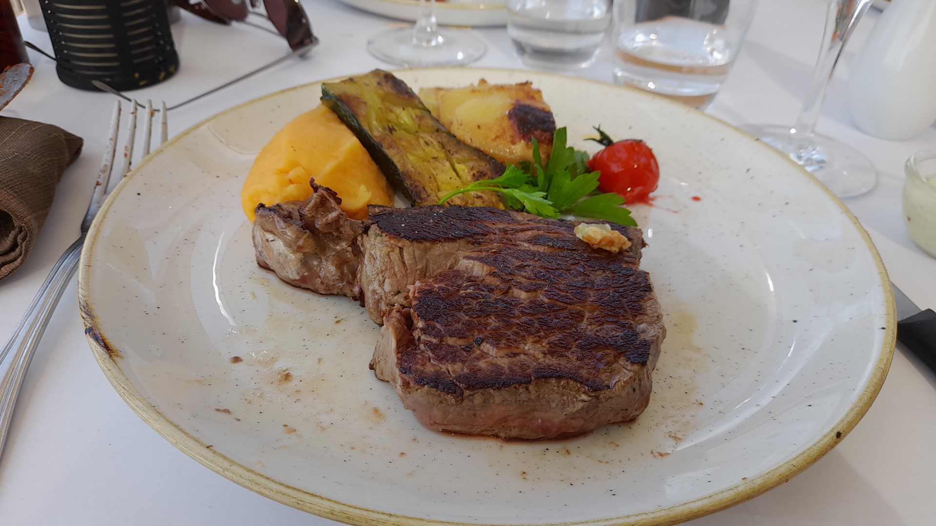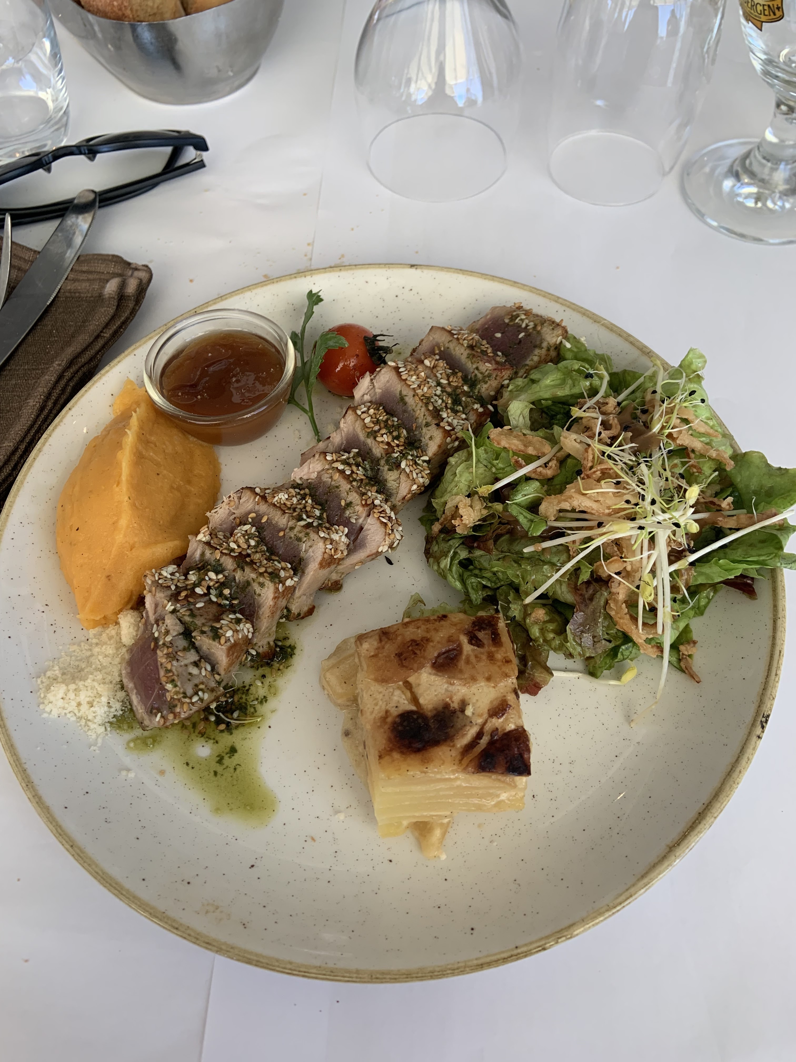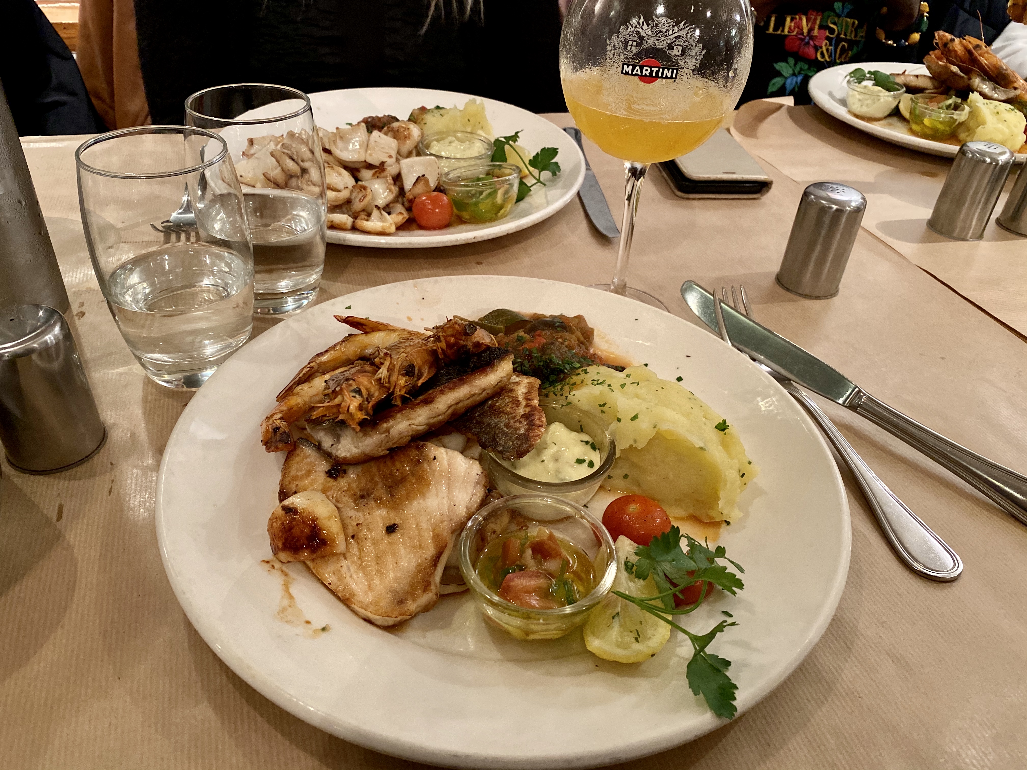 Poisson du jour grillé au feu de bois avec une vue mer ! Cuisiné simplement et frais (ça n’a pas l’air d’être autant le cas pour tous les plats poissons, d’où le choix « poisson du jour »). Seul bémol : l’intérieur du restaurant a besoin d’un rafraîchissement, les plafonds et les climatisations font sales. Vu le prix du restaurant c’est dommage.