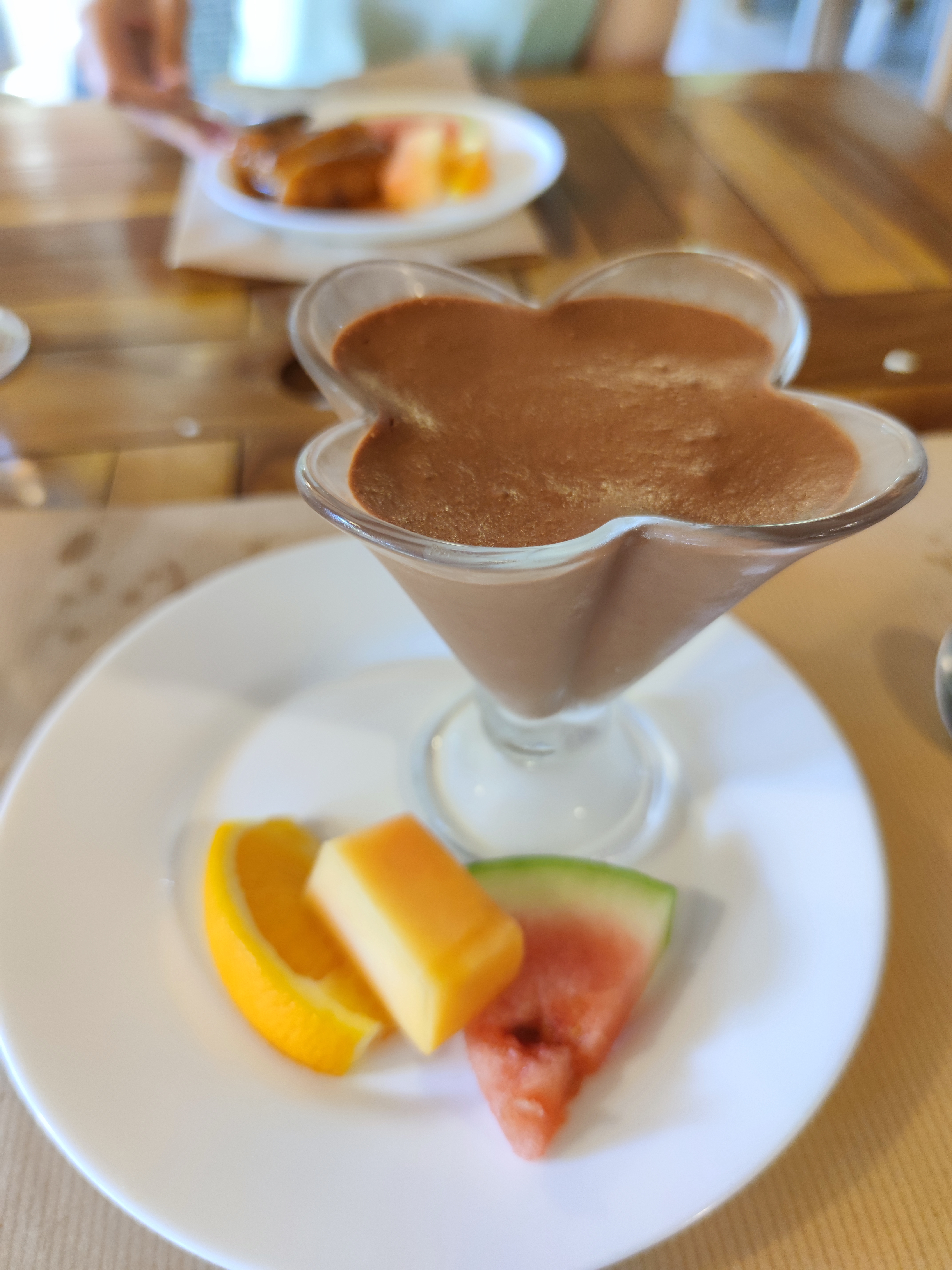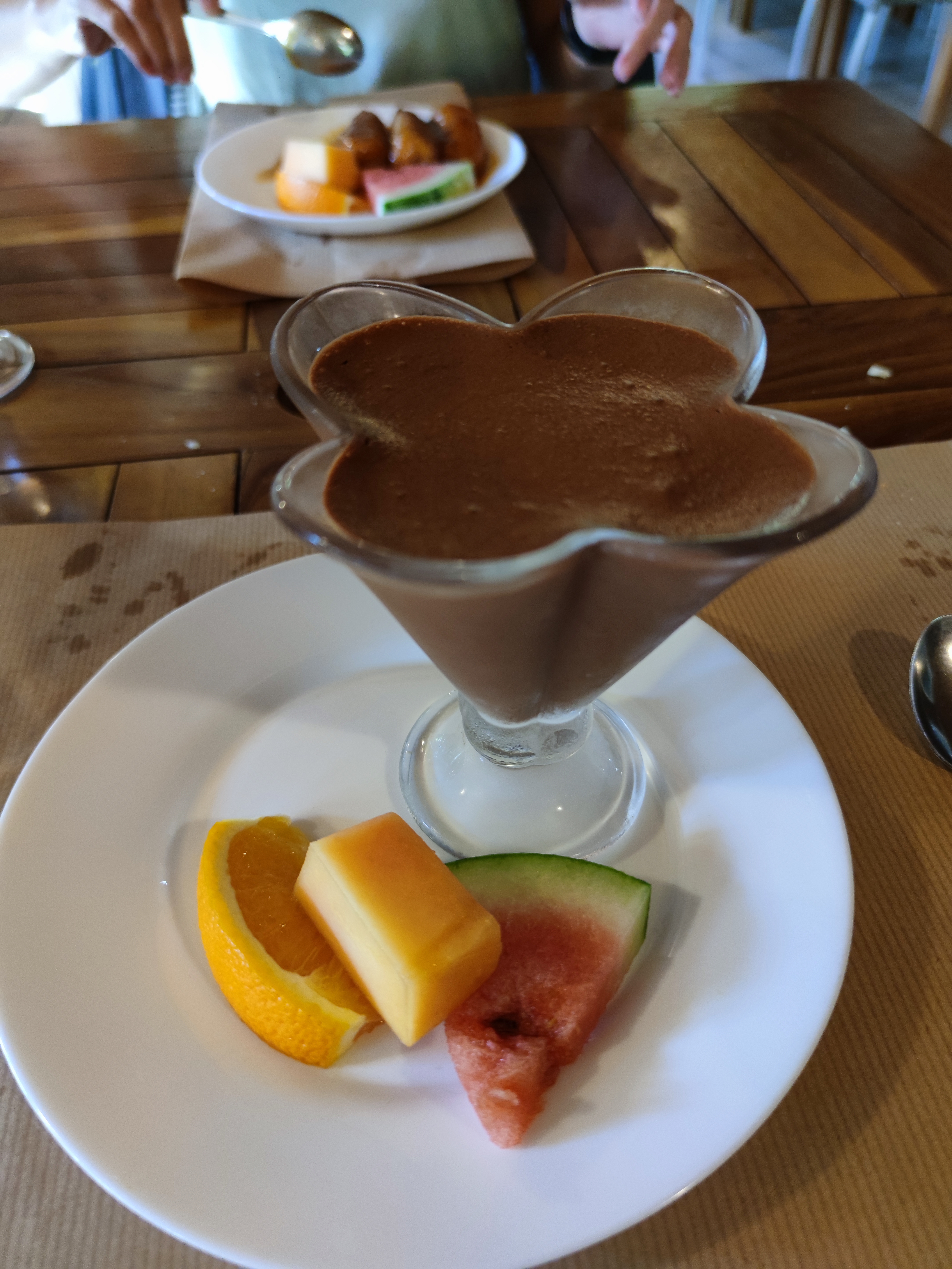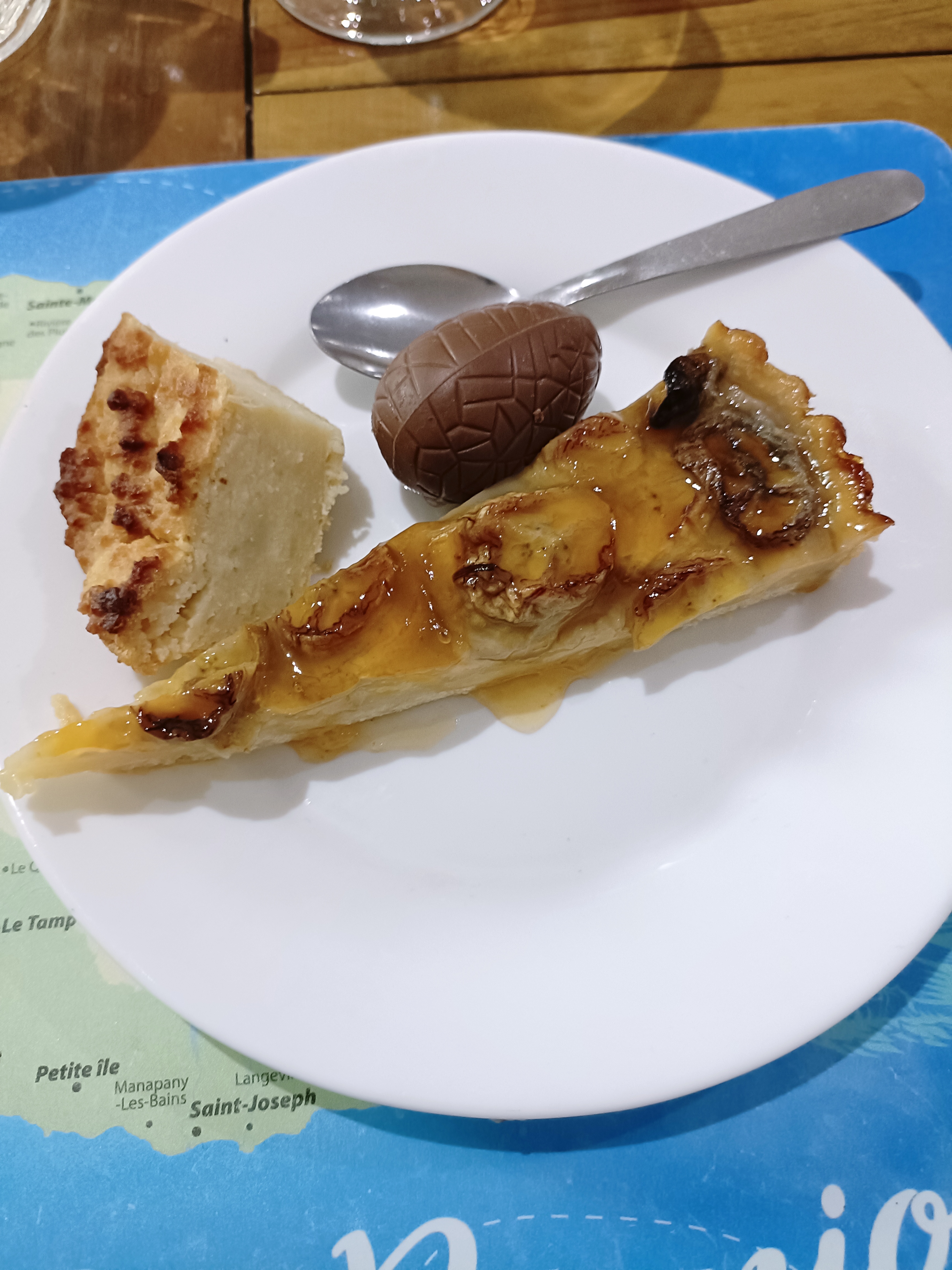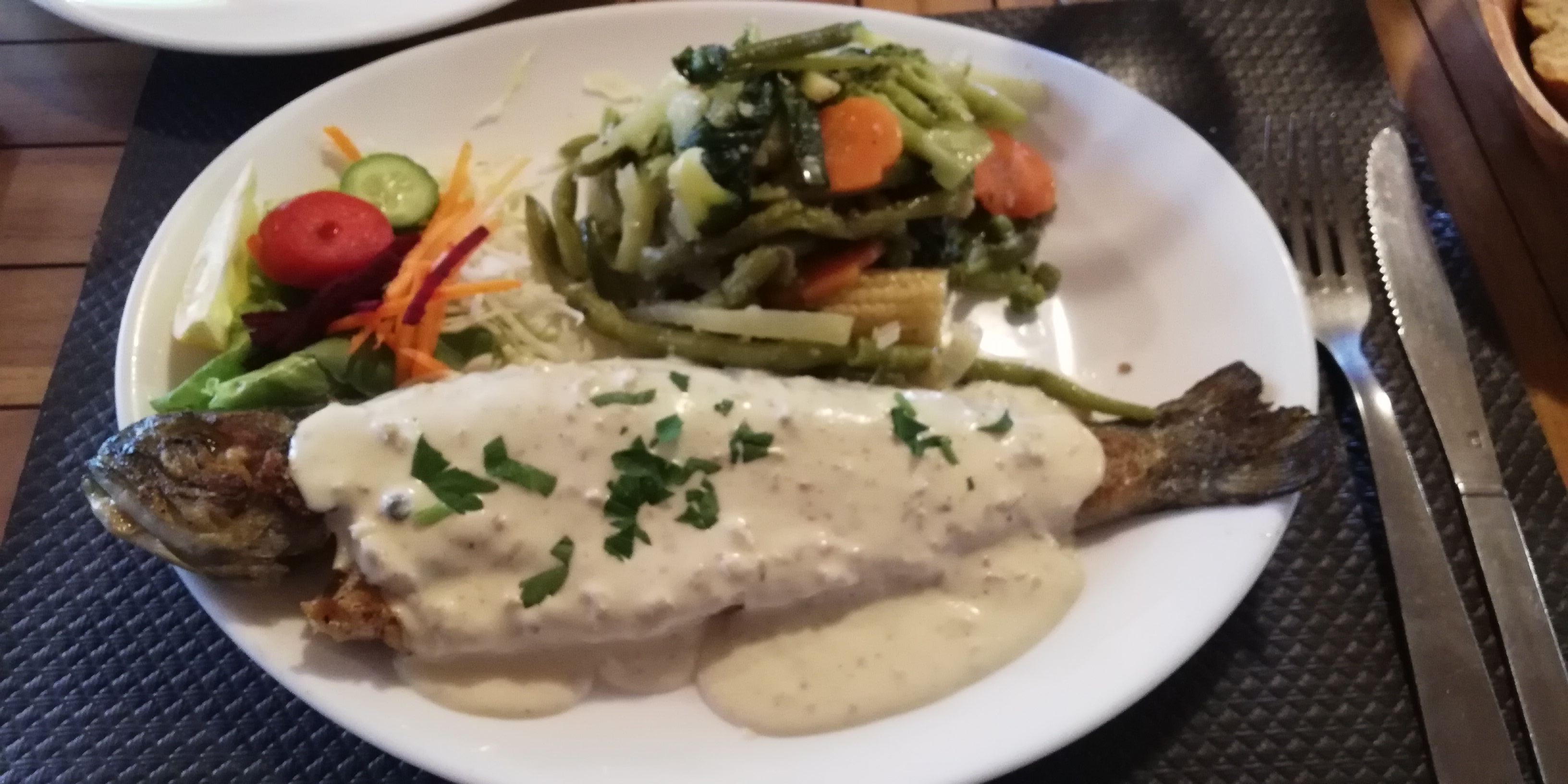 Bon repas avec des truites locales mais pour le dessert des pommes de métropole alors que nous étions en pleine saison des fruits (et ce n'était pas de la faute du cyclone!). Une serveuse charmante et une autre de très mauvaise humeur