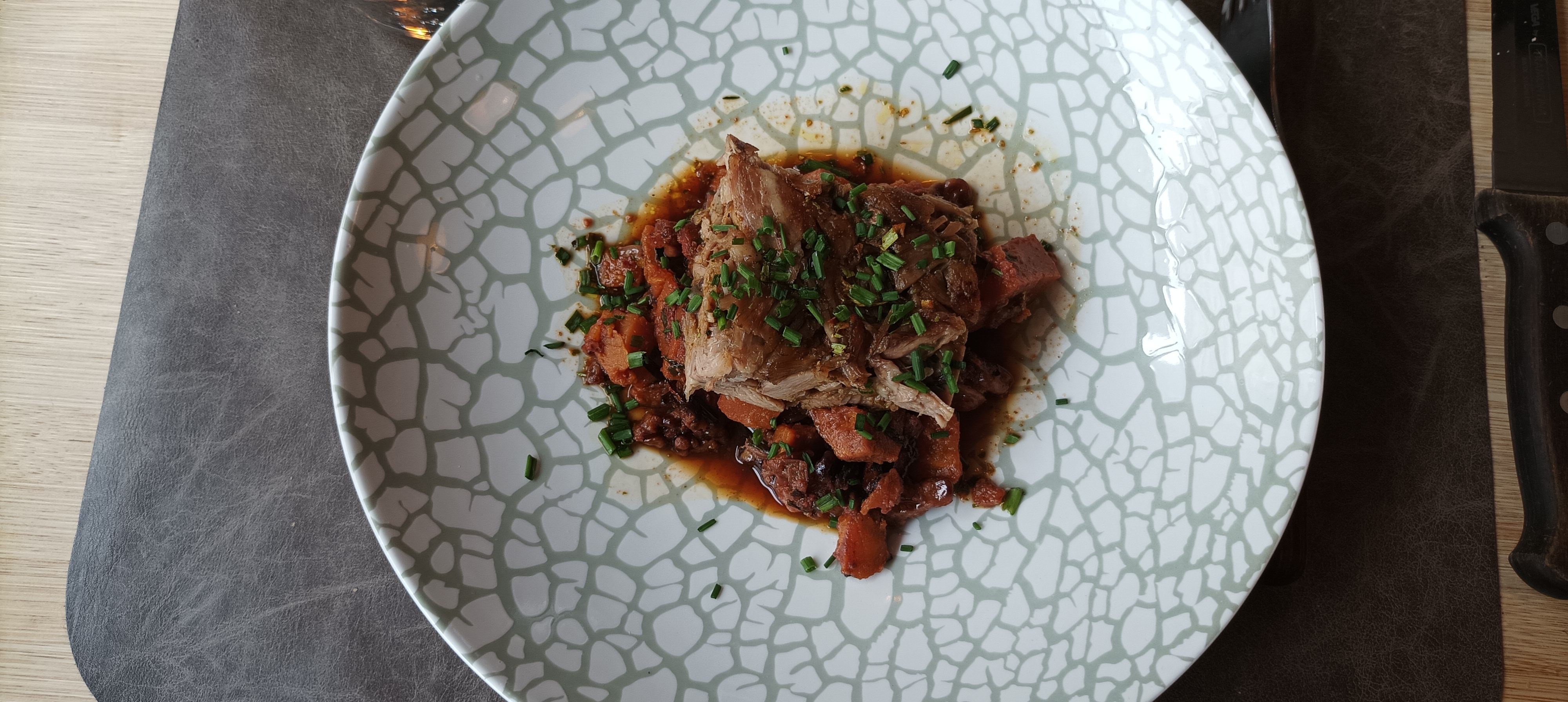 Restaurant, simple un peu dessus. L’entrée de raviole était correct La côte de bœuf en cocote était de très bonne qualité Le dessert, un dôme recouvert d’un chocolat blanc sans saveur avec un glace à la bergamote qui était de la vanille!!! La présentation des mets ne sont pas mis en valeur En espérant que mes remarques vous fasse avancer