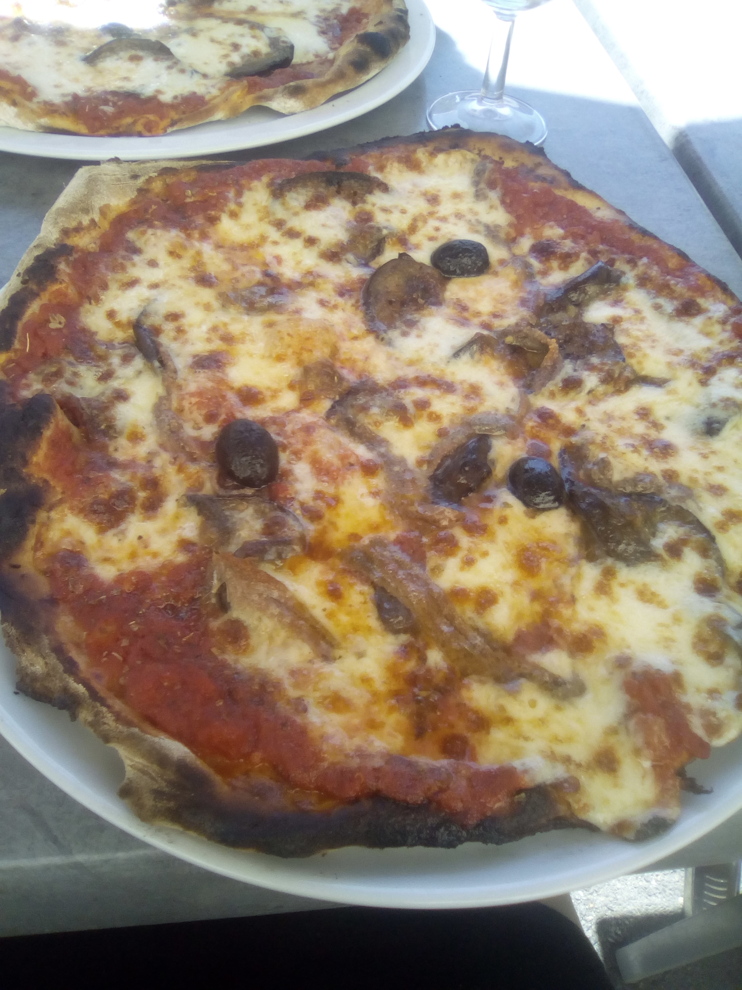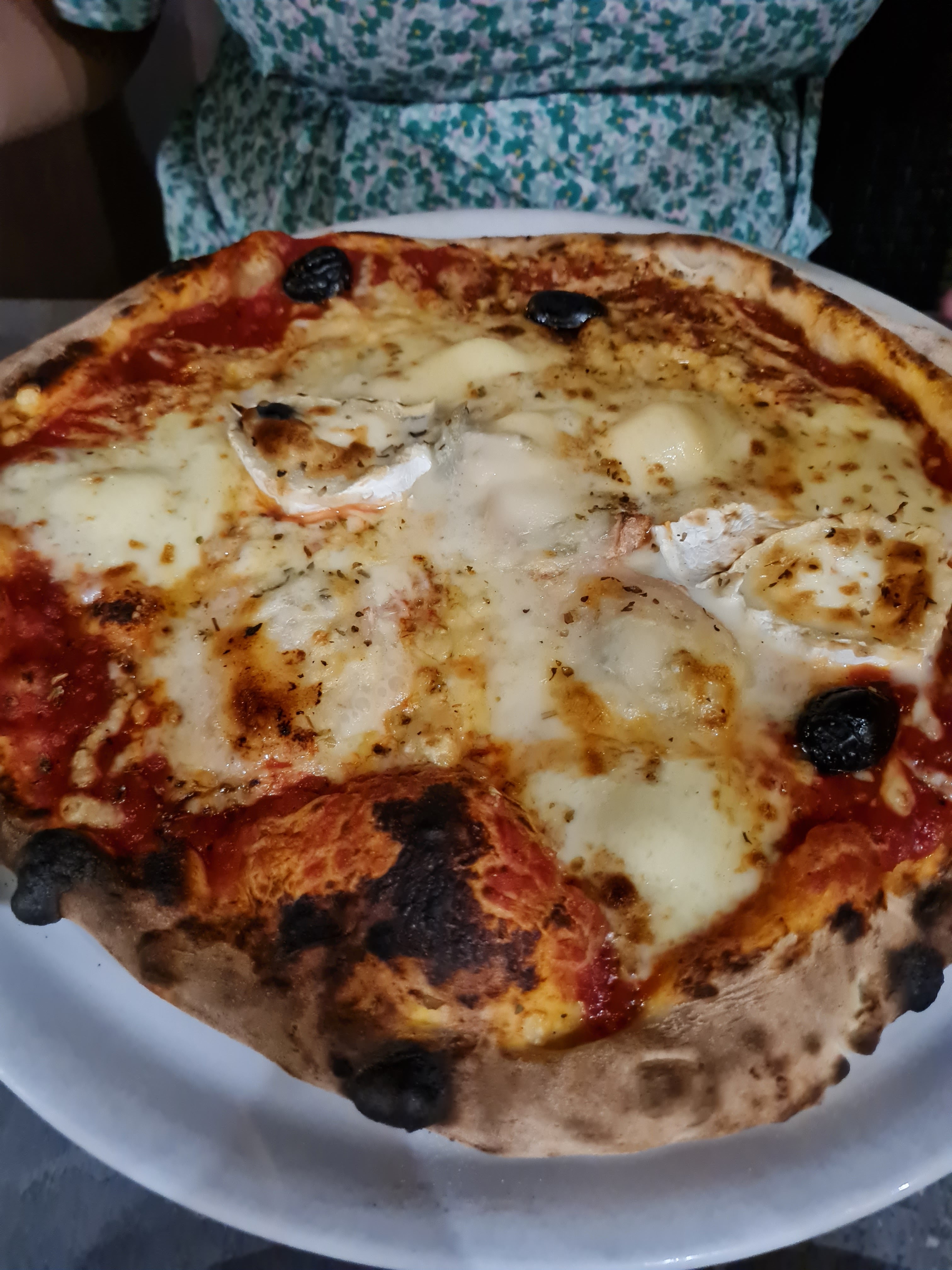 pizza avec une pâte divine, étalée et finie en virevoltant en l'air. cuite au feu de bois....sublime, délicieux...bon accueil.