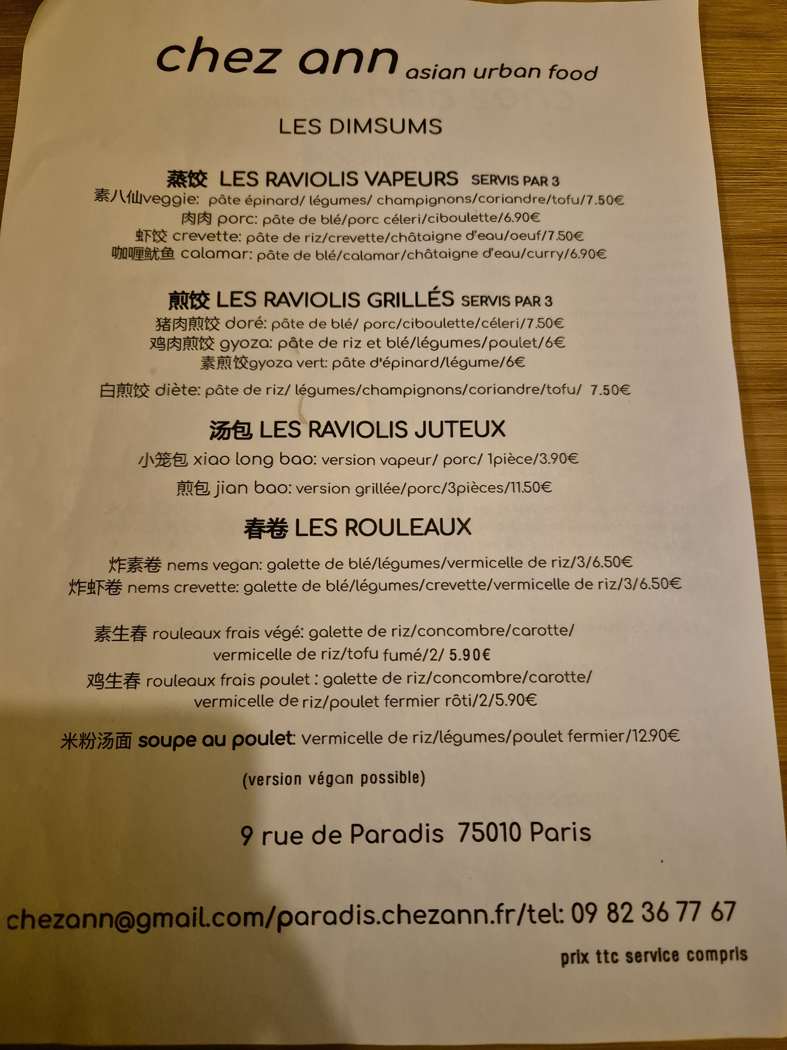 J'ai eu un dîner fantastique chez Ann Paradis! Du personnel très gentil qui vous accueille avec un sourire chaleureux, à certaines des meilleures boulettes que j'ai mangées ces dernières années (les xiao long bao étaient incroyables !), l'expérience a été formidable. L'ambiance est cosy et avec une cuisine ouverte d'où vous pourrez admirer les cuisiniers faire leur magie :) J'ai dîné seul et vous l'avez rendu spécial, merci encore pour tout ! xx d'Italie