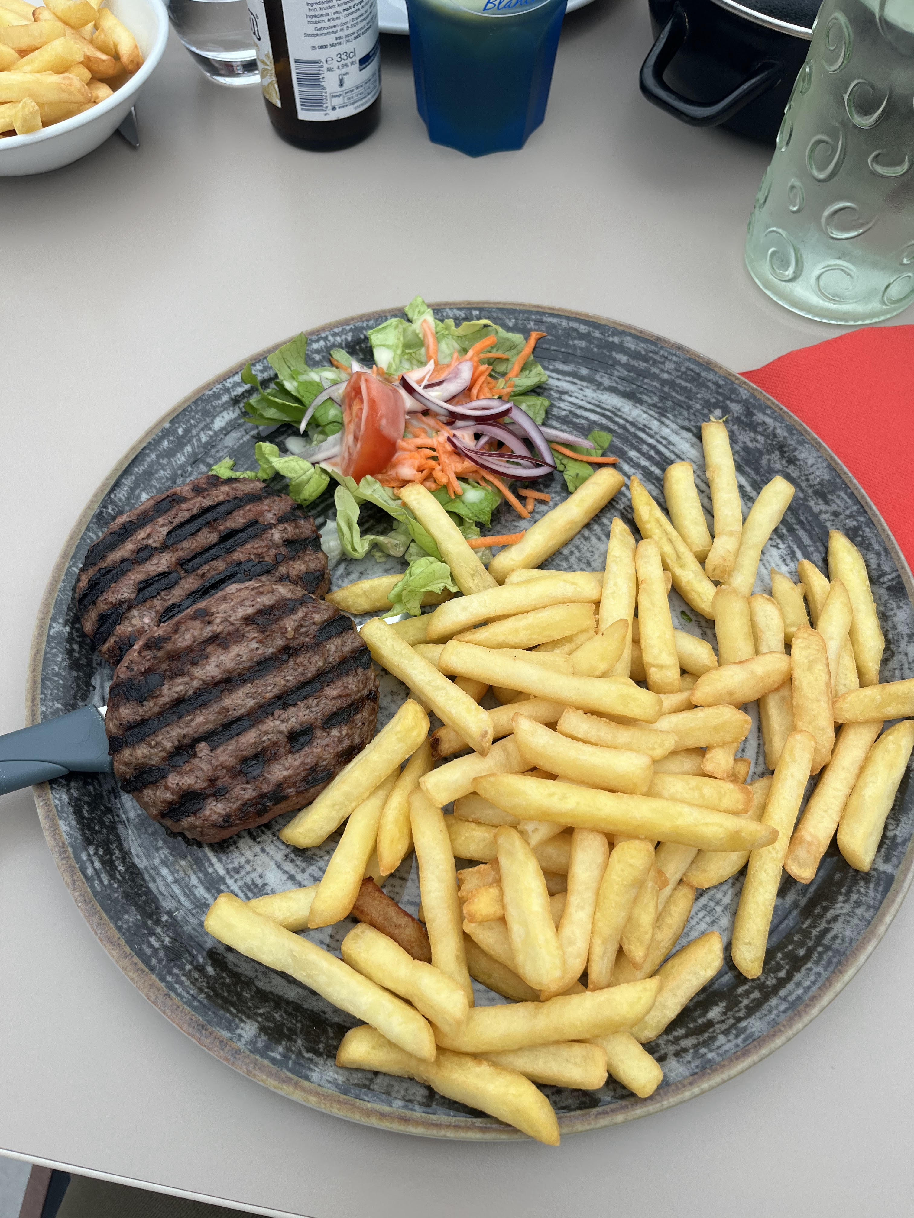 Tout d’abord nous avons dû patienter 10 minutes dehors mais personne n’est venu alors que des serveurs passaient devant nous. Nous sommes rentrés et on nous a placés immédiatement, on nous a pris rapidement la commande et les boissons sont arrivées vite. Malheureusement les plats se sont fait attendre bien plus longtemps. Surtout pour un enfant. Et les frites manquaient de saveur et de cuisson et étaient farineuses. C’est dommage dans le Nord. Bref c’est assez cher au regard de la qualité et de l’attente.