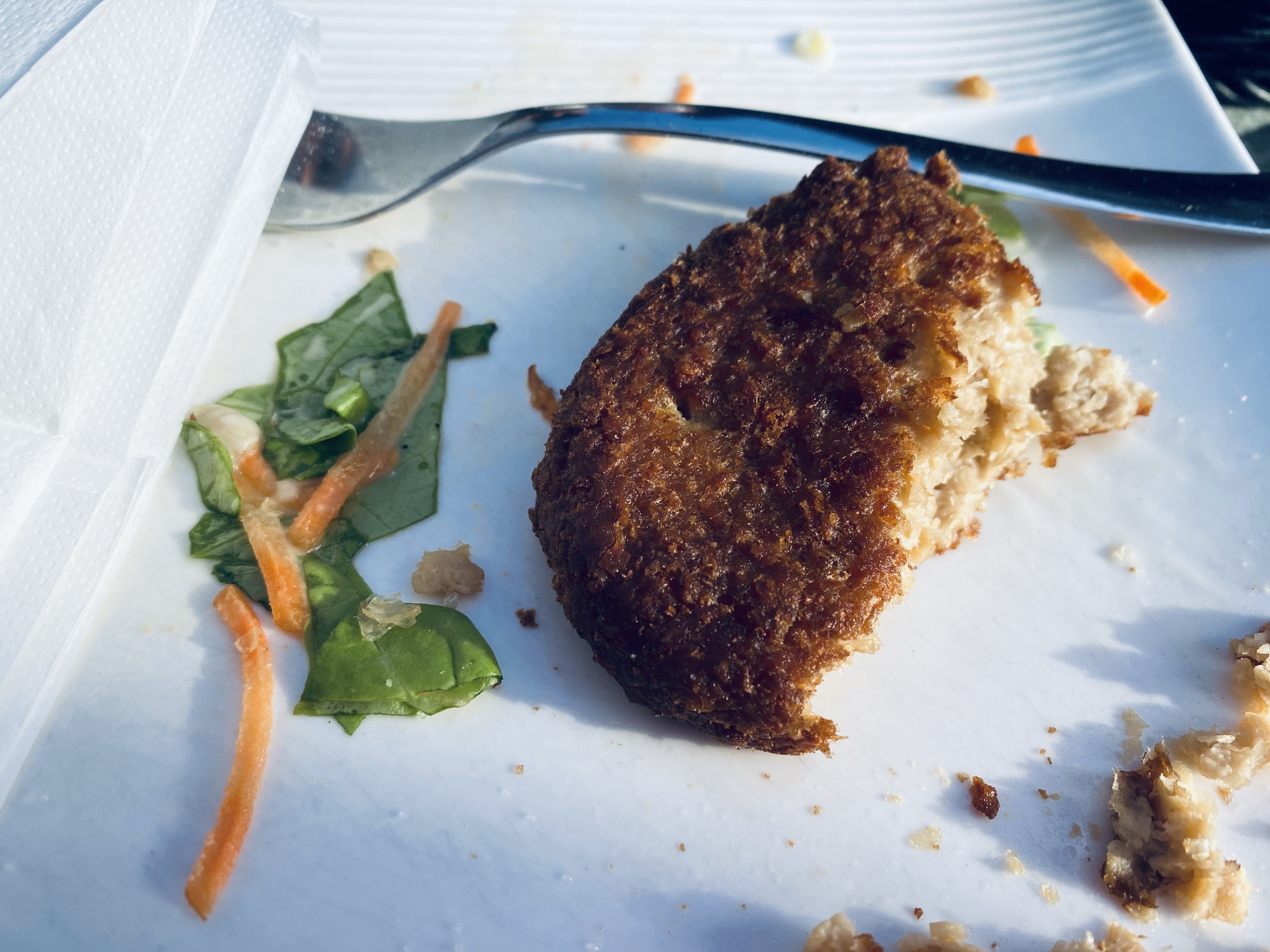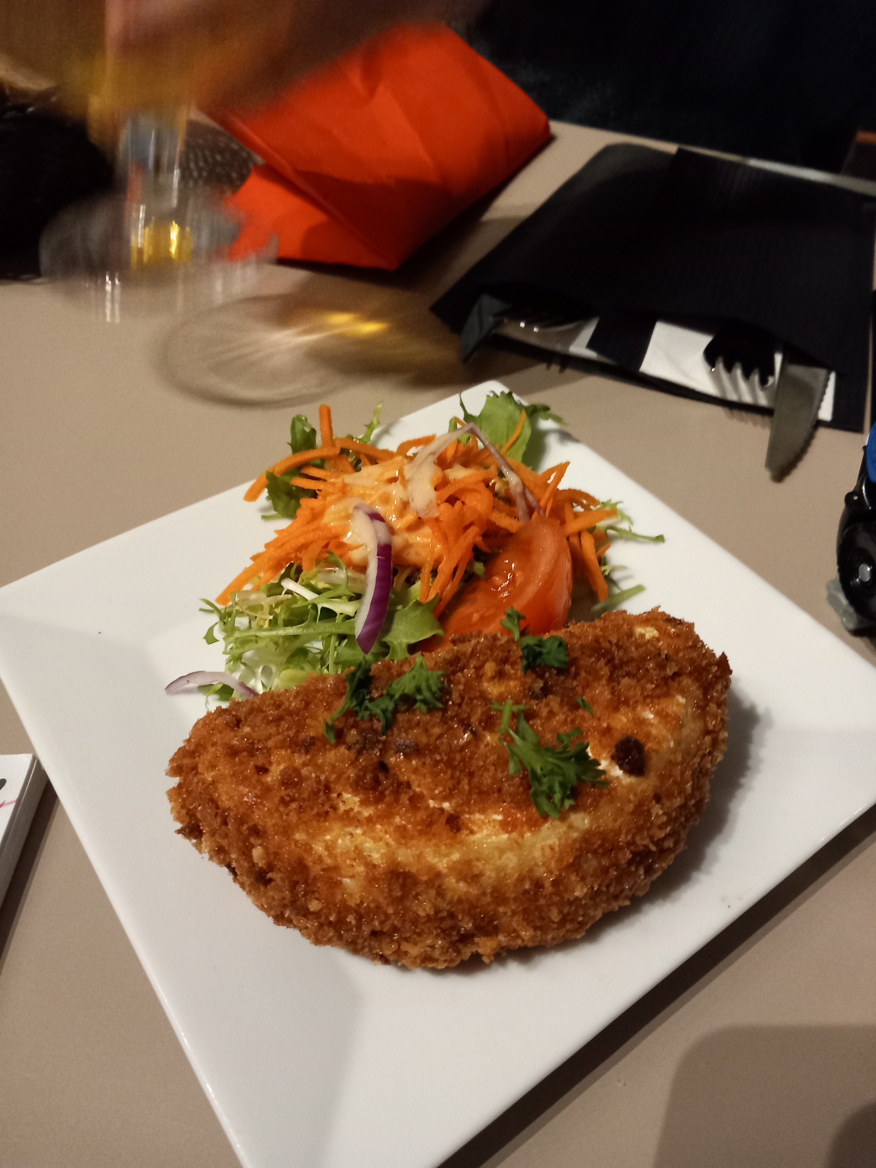 Attente du vin blanc jamais arrivé pour l'apéro Puis Microscopique Camembert frit 16 euros genre plat enfant Un vulgaire cordon bleu pané de fromage avec des frites congelées sèches, carottes râpées salade industrielles et vinaigrette industrielle. Voir photo. Le patron se déplace, aucun geste commercial...par contre encaissement ultra performant. A fuir !!!😭
