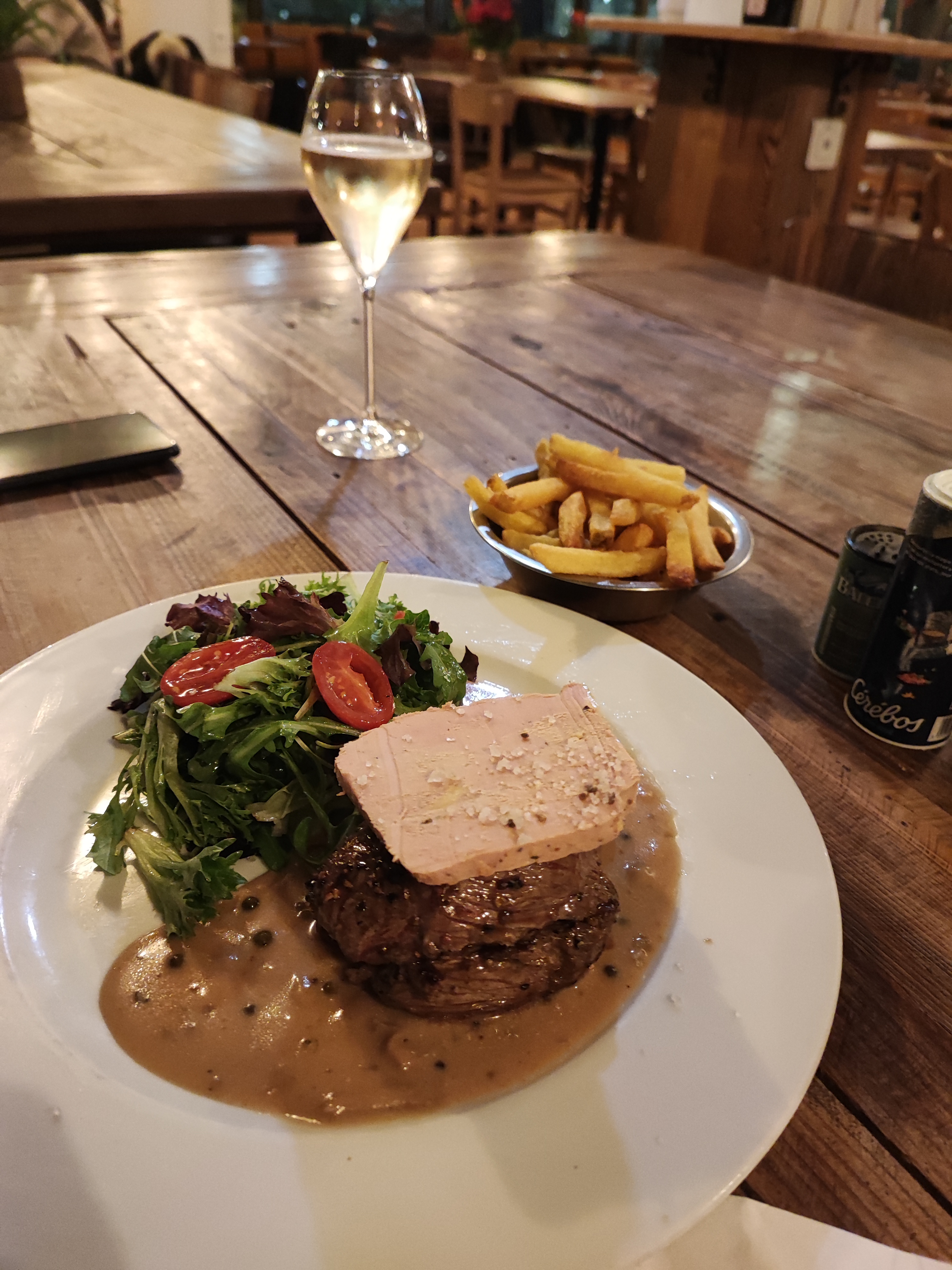 Apéro offert à la maison. Bonne entrée. Mais le plat principal aurait pu être une meilleure viande. Surtout si proche du marché de gros...
