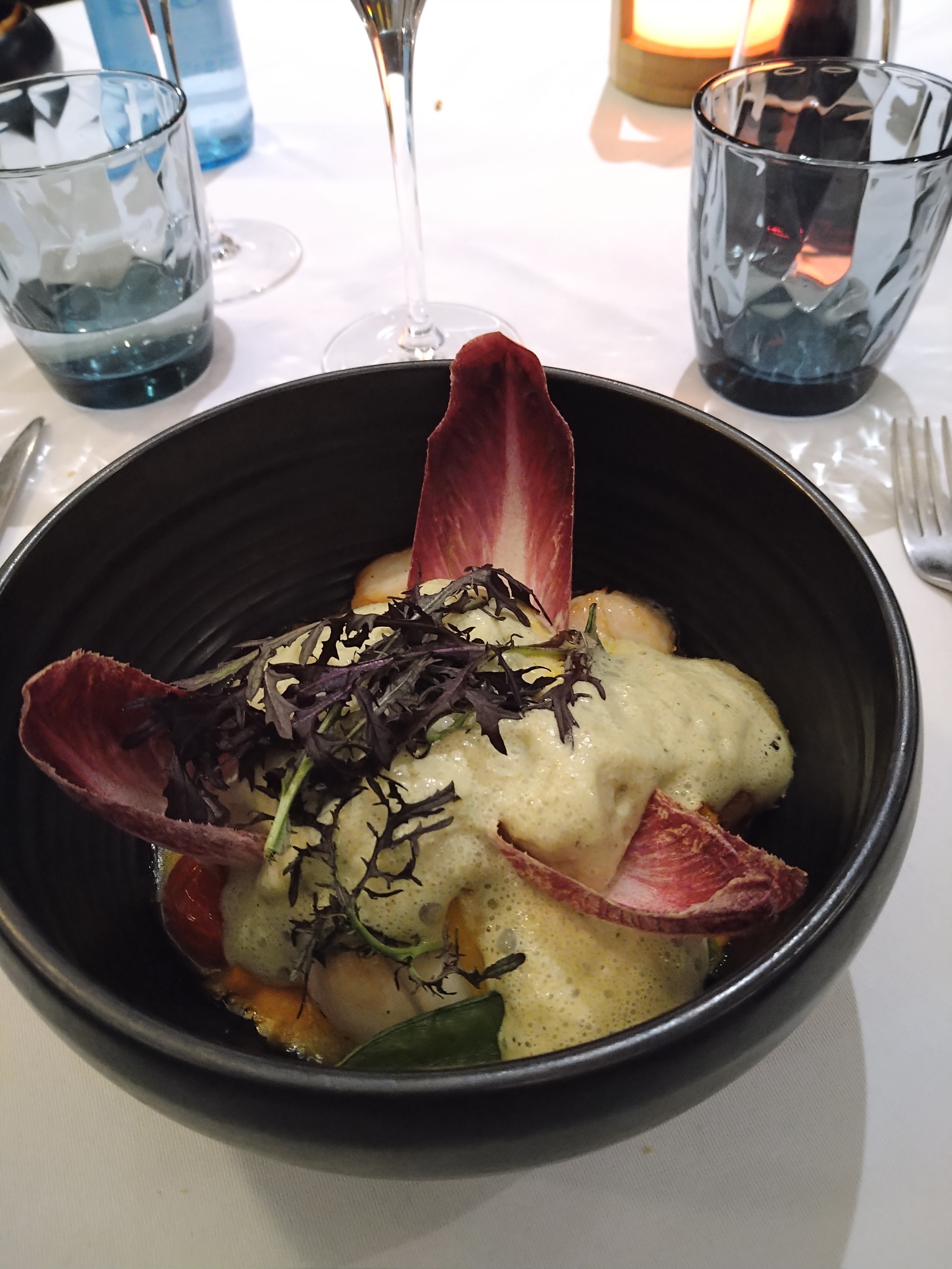 Bon, mais manque de saveur sur la pannacotta au lait de coco ( texture de gélatine forte ) entrée bonne mais je n ai pas senti le curry comme annoncé dans le menu. Serveur très agréable et vin délicieux. Pain fait maison excellent et st Jacques fondantes. Bon rapport qualité prix
