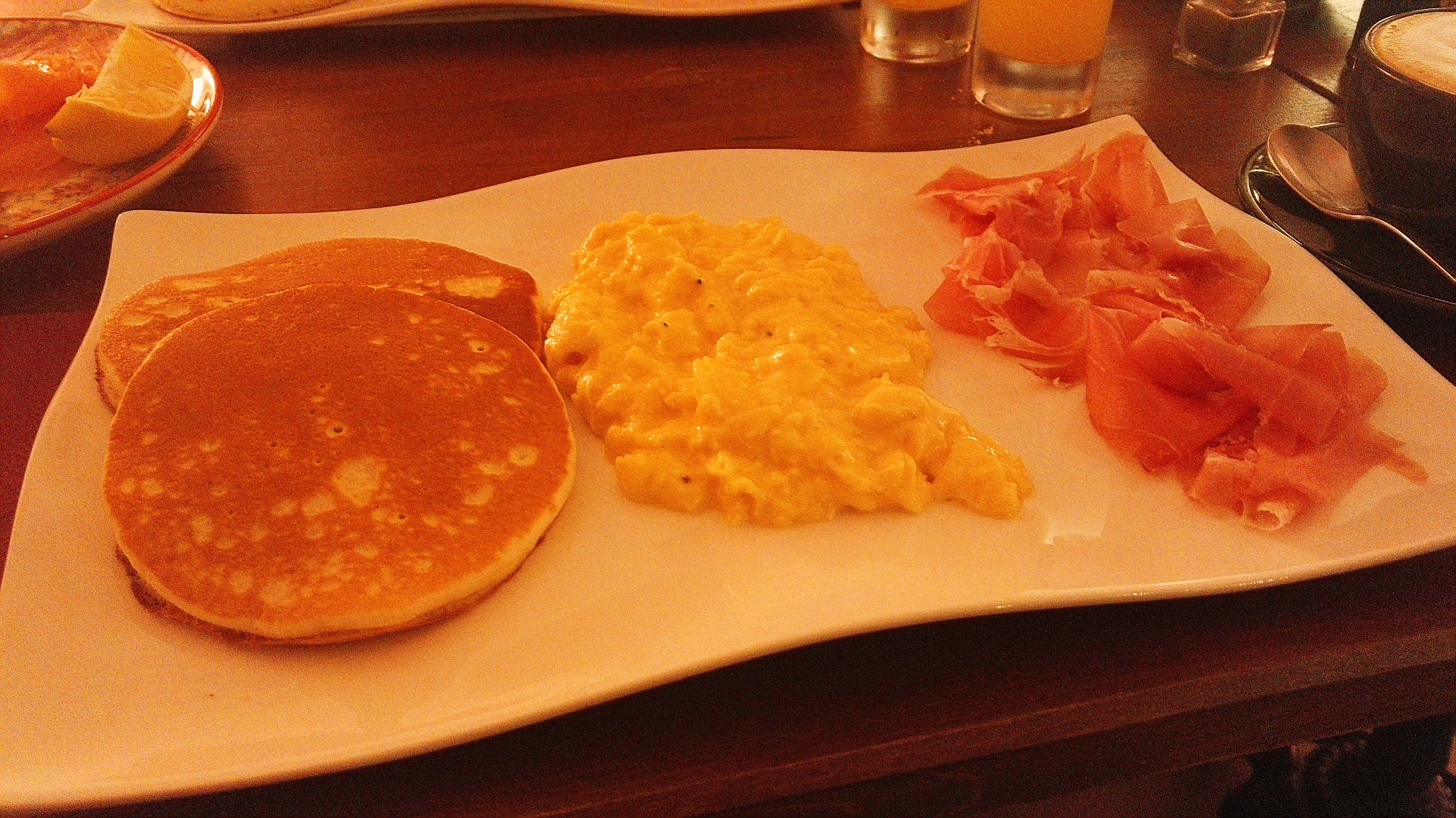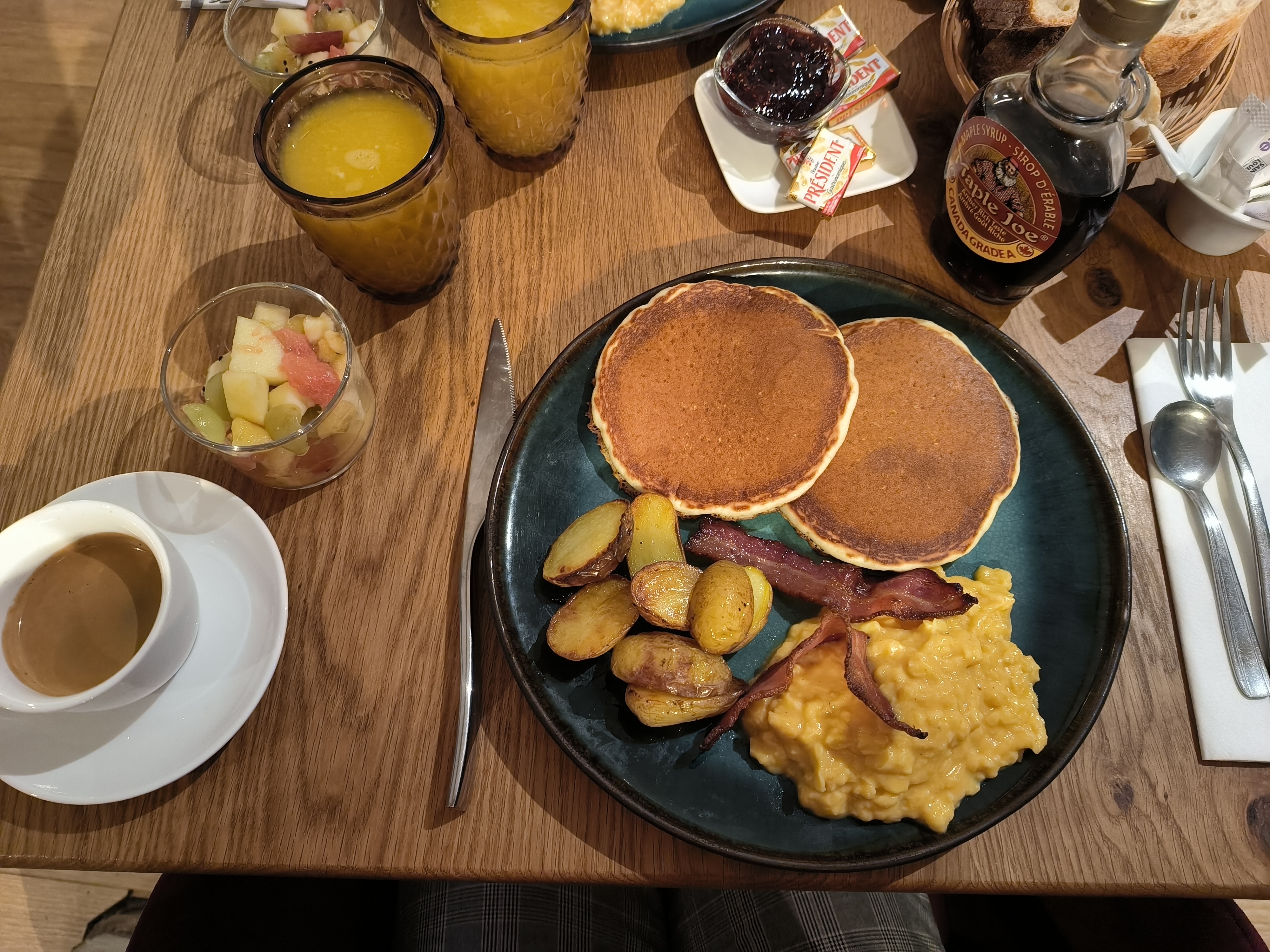 Super brunch à petit prix très complet : œufs brouillés, pancakes, lards, boisson chaude, salade de fruits, jus d'orange pressé et confiture maison. Le lieux est canon et le personnel adorable, j'adore :)