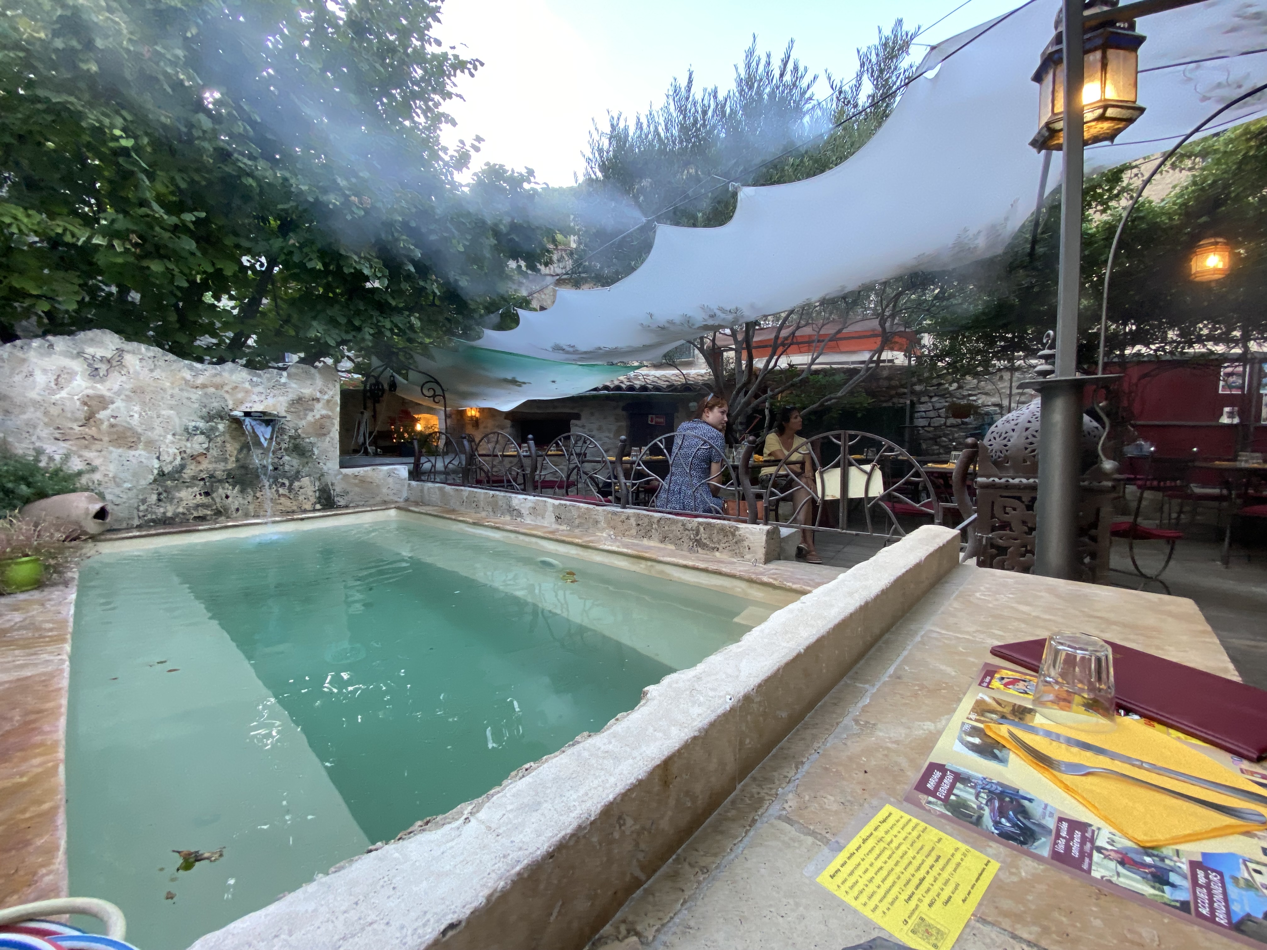 Petite cour bien aménagée mais peu d'air et forte chaleur ... Atténuée par une brumisation bien répartie et un petit plan d'eau ! Et la carafe d'eau etait bonne, apparemment filtrée et cest vrai quelle n'avait pas de gout de chlore. Par contre, le plat du jour était fade ( lapin aux morilles avec des tagliatelles que ma femme a trouvé bon) : on a demandé du poivre et du sel et du fromage pour les pâtes mais pas possible d'avoir du fromage!😕et les cafés étaient chers et pas bons ...