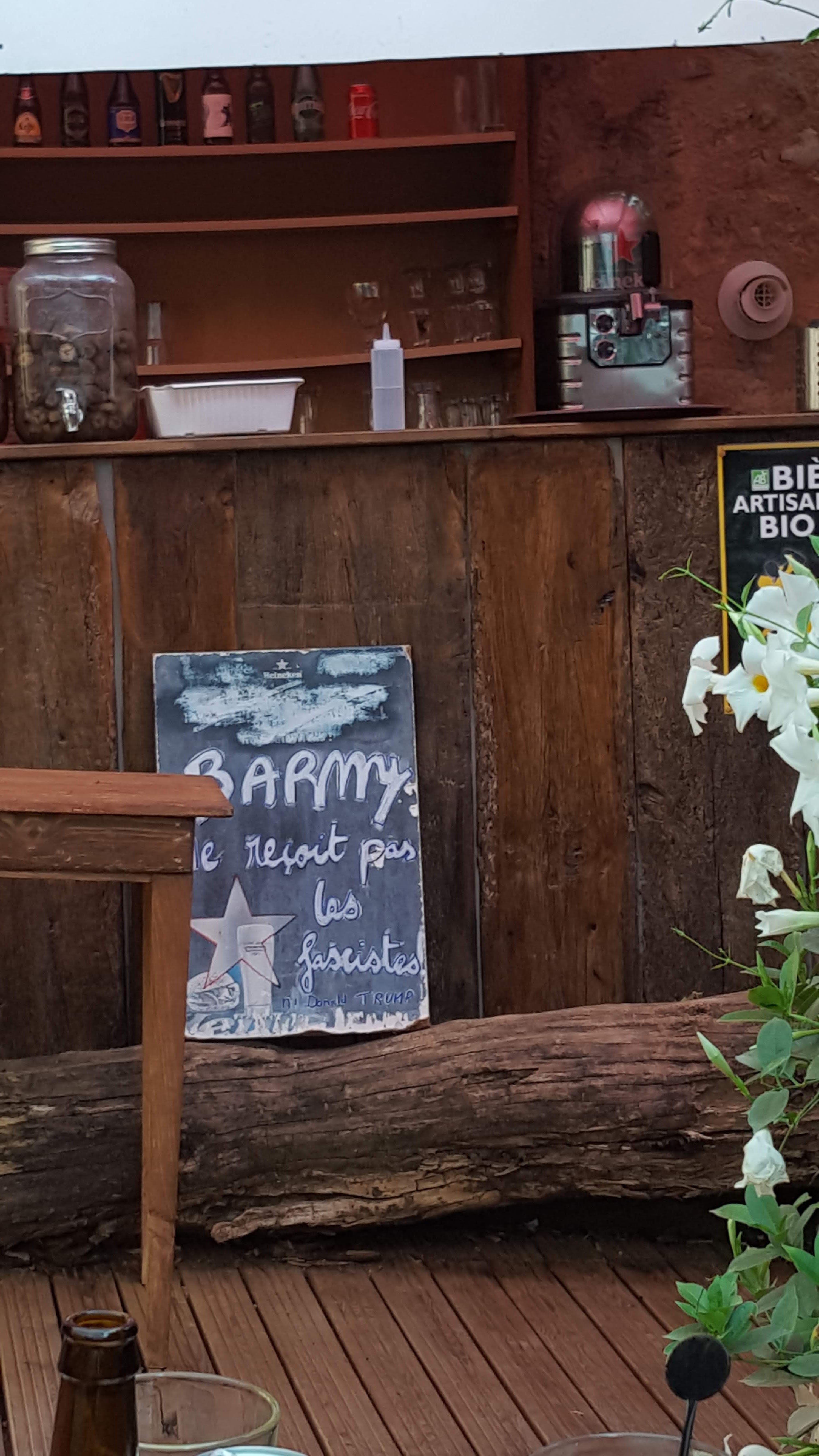 Evitez les sodas (bios faits maison soda stream, evitez l'eau gazeuse, faite maison (soda stream facon perrier), evitez l'eau de source, pas fraiche , faite maison (façon vitel) donc payante. Evitez la bière barmy, faite maison et... soda stream? Evitez la pina, faite maison , à l'eau de source, donc 10 euros et evitez le patron, fait maison, mais ils ont oublié de le faire sourire. Enfin évitez la facture, tres salée pour du fait maison, 🤮 mais ...,terrasse très agréable, 🌳bref évitez chez Barmy 🤪 ps nous travaillons aussi dans le tourisme en tant que saisonnier et nous savons à quel point l'accueil clients est important pour rendre les vacanciers heureux. 🙃🙂😄