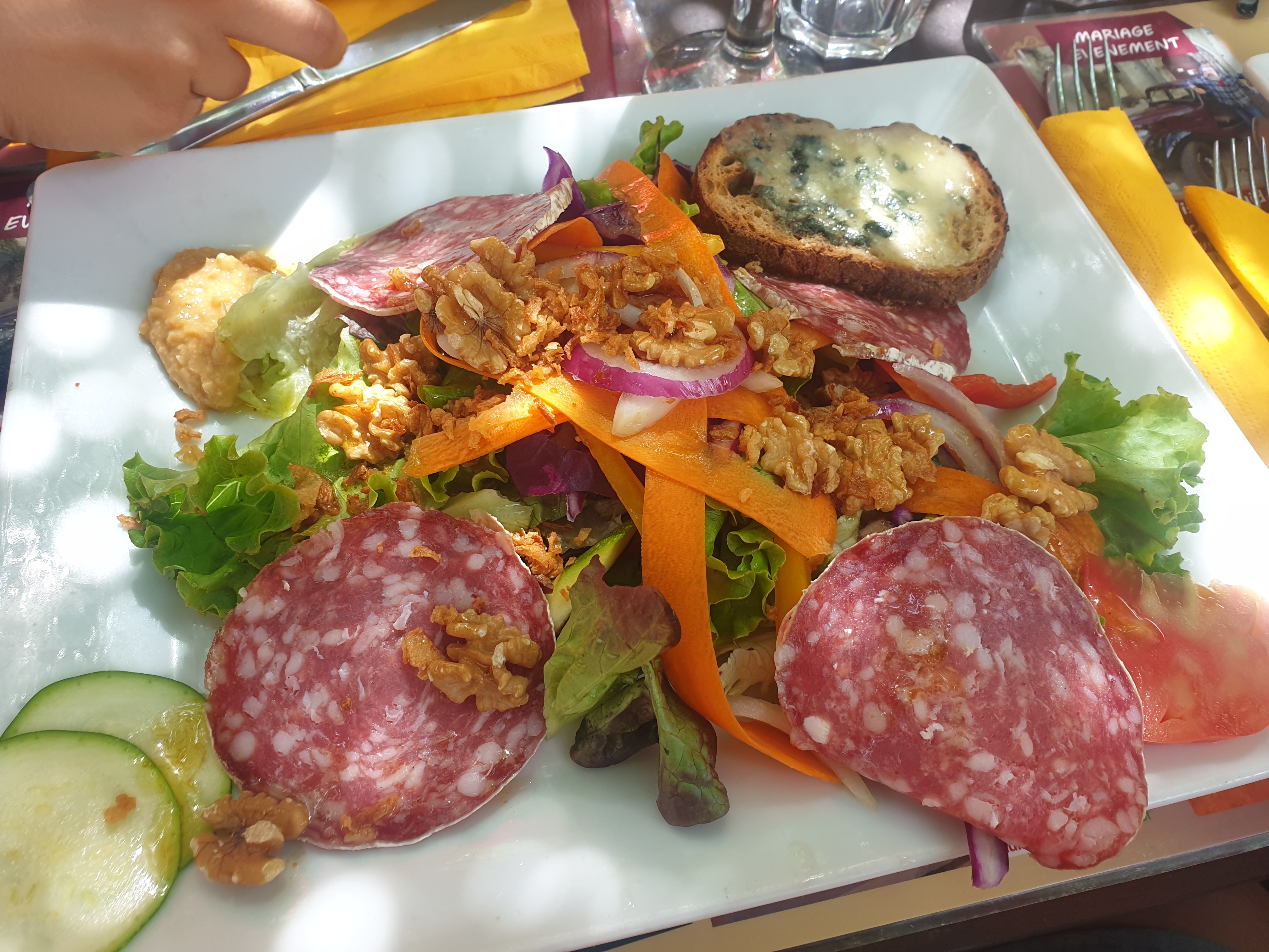 On a pris en entrée une ardoise Cambajon (indiquée pour deux) à 15 euros. On a attendu 30 à 40 minutes pour qu'elle arrive et là, la déception : de la charcuterie bas de gamme, 4 tranches de chorizo, jambon de pays et rosette, c'était accompagné de tapenade et d'un gaspacho, mais pour une assiette centrée sur la charcuterie on a été déçus. En plat j'ai pris une salade avec la truite fumée et tartare, la truite fumée n'avait pas beaucoup de goût, et le dressage n'était pas terrible. Côté cadre rien à dire c'est beau, le service aussi on a bien été pris en charge mais côté cuisine ça laisse sur sa faim surtout compte tenu des prix. Je ne comprend pas la recommandation du Routard.