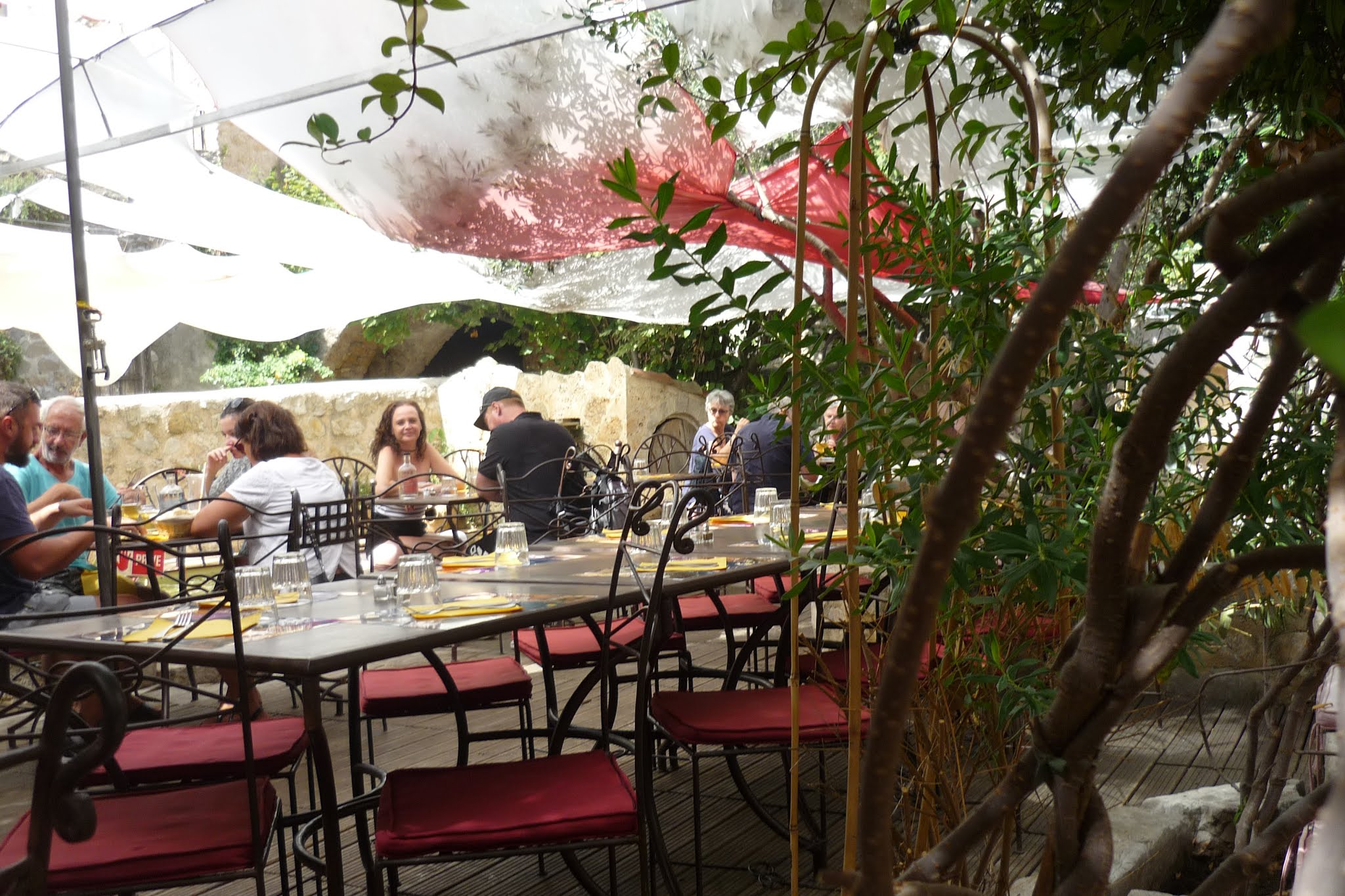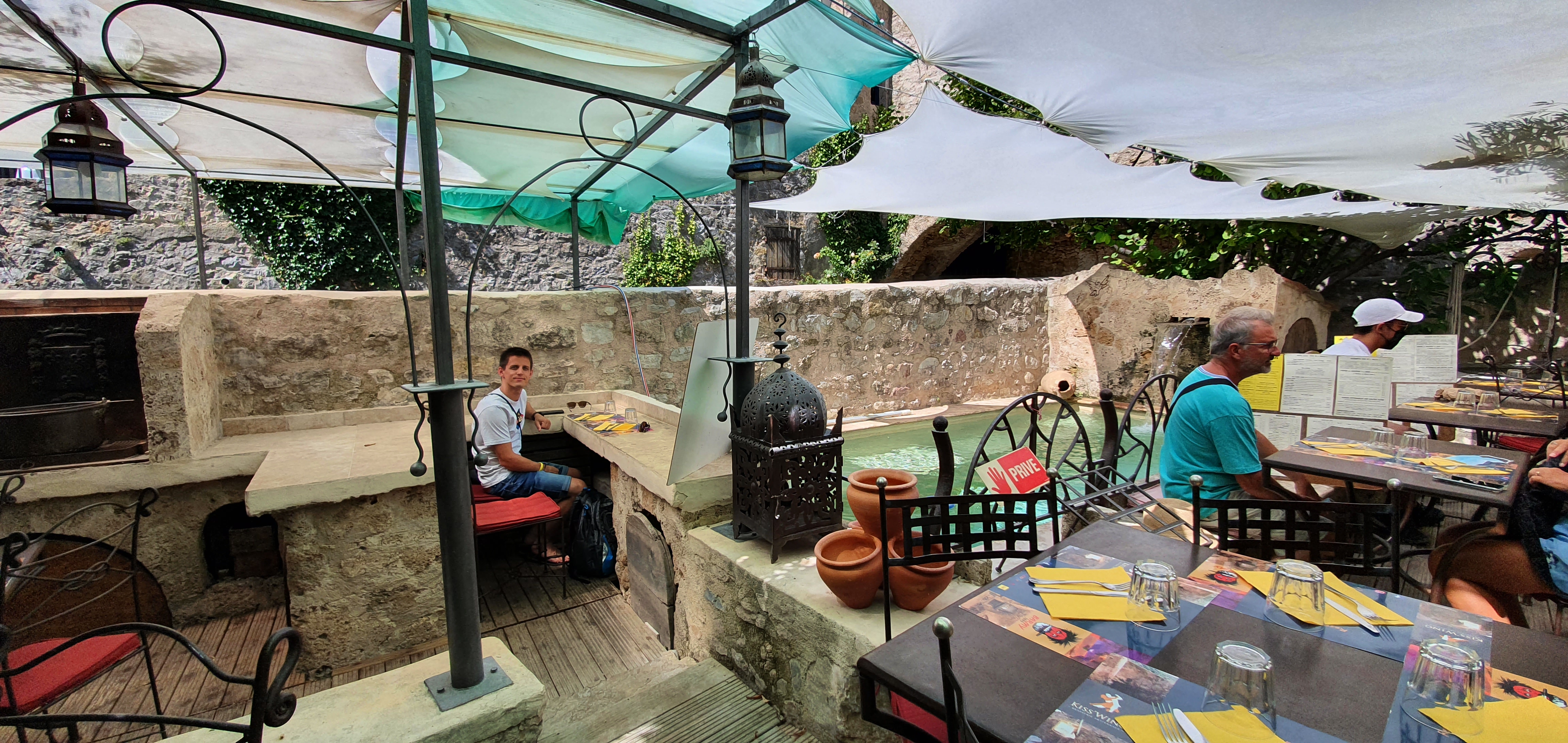 Sympa manger extérieur sous des voiles. Mais s'il pleut le patron n'est pas content et nous le fait savoir quand on s'abrite.