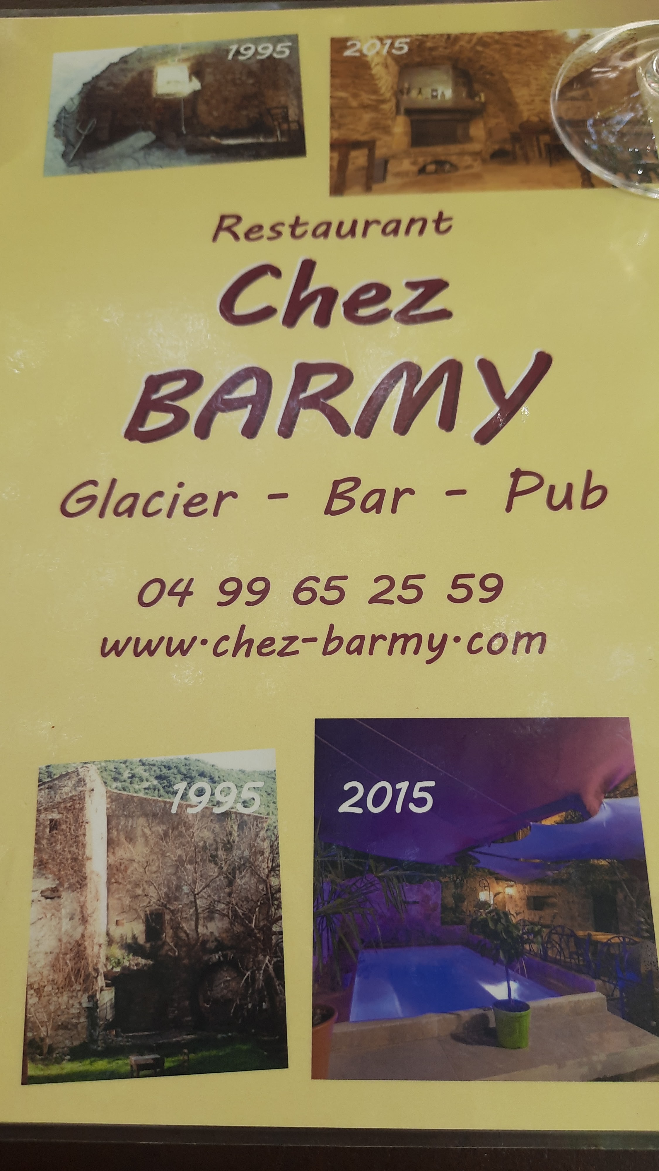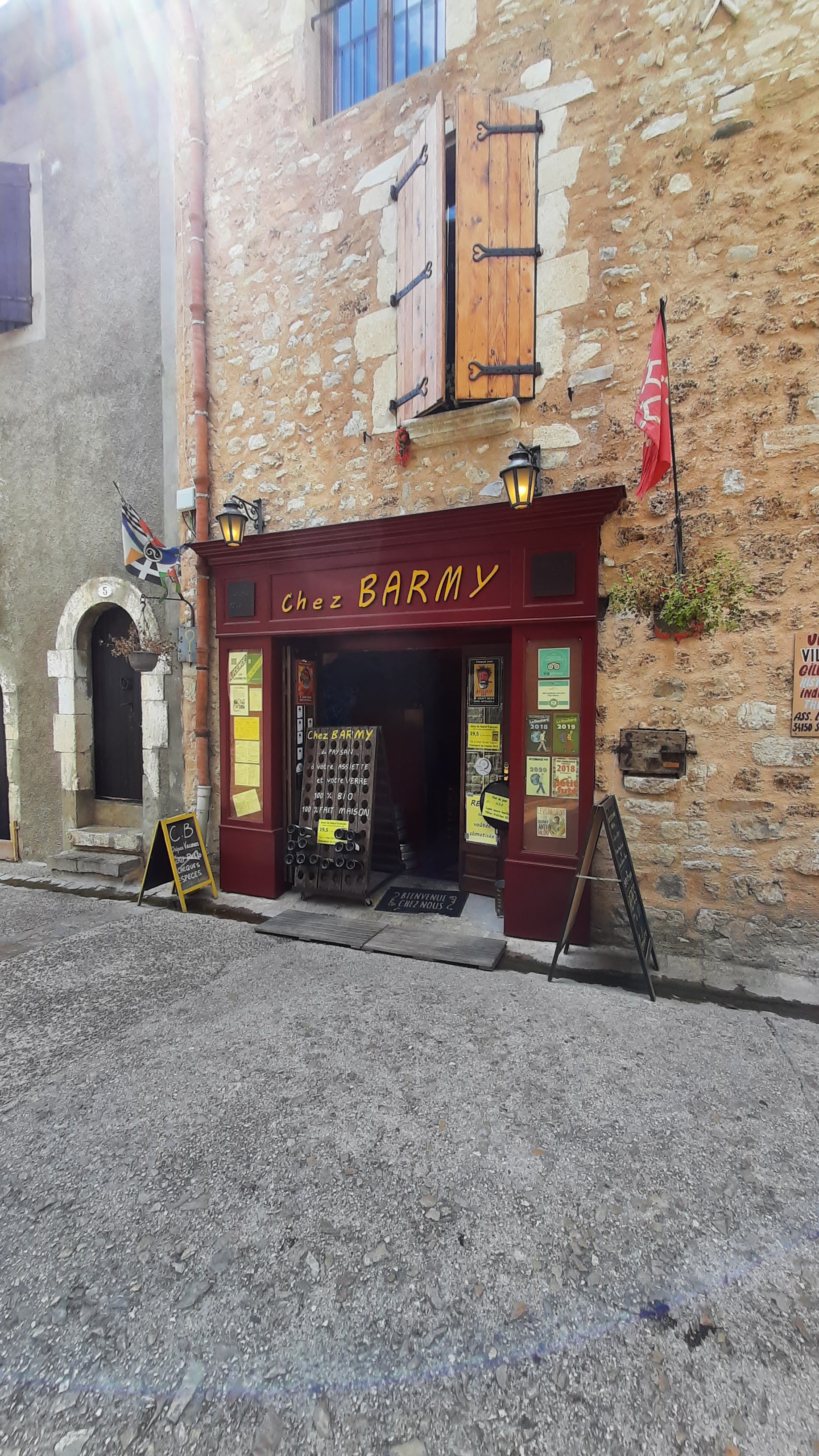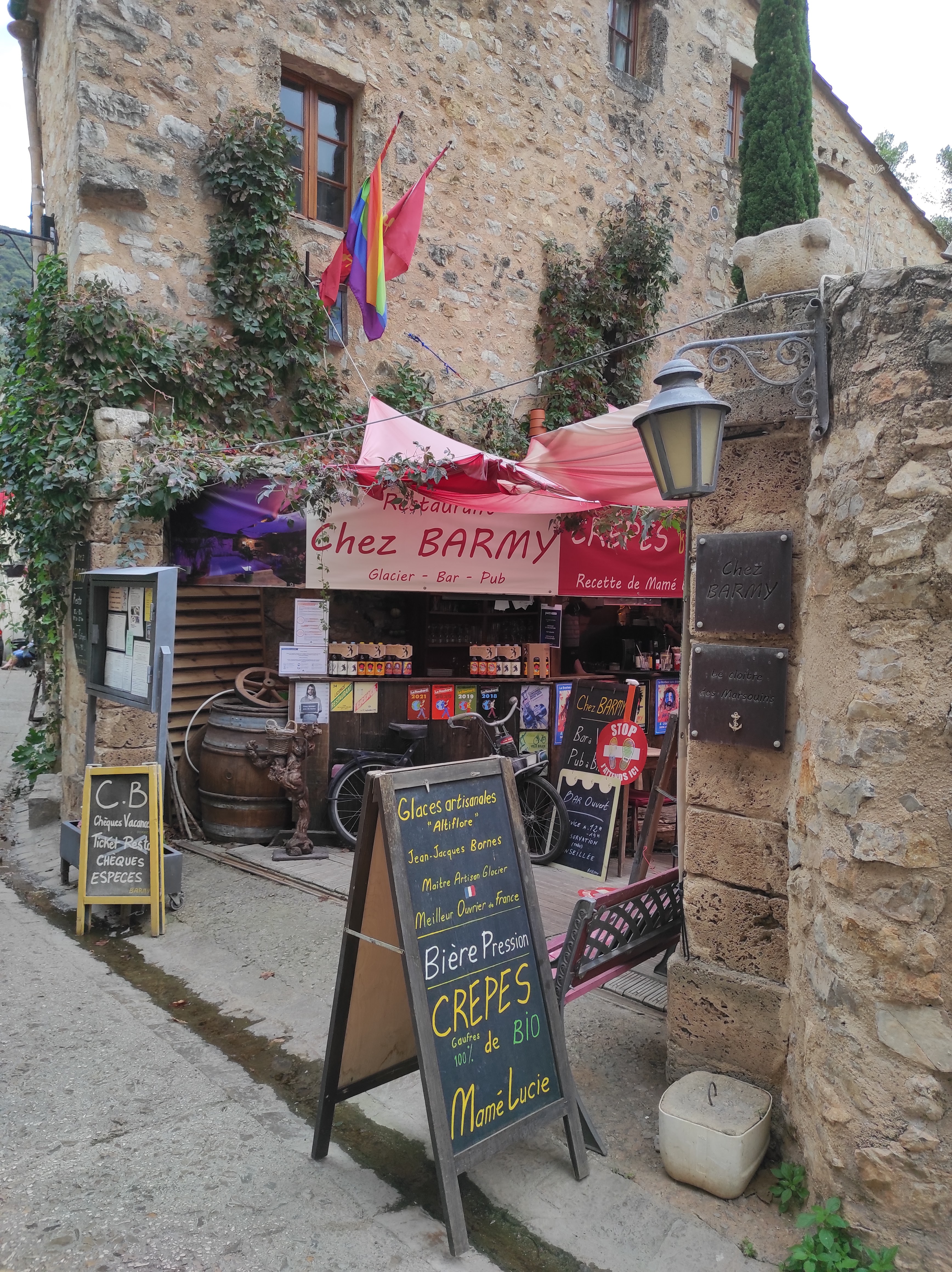 Le Désert n’est pas dans l’assiette Il est des endroits ou il fait bon se promener ; le village de St Guilhem le désert, en est un exemple frappant. Classée parmi « Les plus beaux villages de France » ; laisser vos pas vous emmenez dans les rues pentues et arrivez sur sa place ombragée par un platane plus que centenaire. Mais la faim vous tenaille et l’heure du repas est arrivé, revenez au début de la rue, là où commence votre visite ; là vous trouverez un café-restaurant unique en son genre ; le bien nommé ‘’Chez Barmy’’. Tenu depuis des années par ce tenancier, vous serrez accueil avec le sourire et la bienveillance de l’ensemble des intervenants, des serveurs en passant par le patron. Ici pas de chichis ; du vrai que ce soit dans les assiettes ou dans le service. Des salades plus que copieuses, et un plat du jour, loin du traditionnel steak/Frites, en ce jour, place au lapin et ces tagliatelles aux morilles. Bon il est vrai que l’affluence de ces dernières n’est pas dans mon assiette, mais le gout, la cuisson et la qualité est là. Pas déçus par l’ensemble du repas et de la fraîcheur de ces agates. Une adresse pour qui cherche une cuisine faite sur place et de bonne facture. Pas de surprise, on passe un bon moment. Attention peu de places en terrasse, et vue la renommée, celle-ci se remplit vite ; venir sur les coups de midi ou faire une réservation, la chaleur de ce mois d’Août demande un coin de détente à l’hombre des voiles et de ces brumisateurs, tel est la récompense.