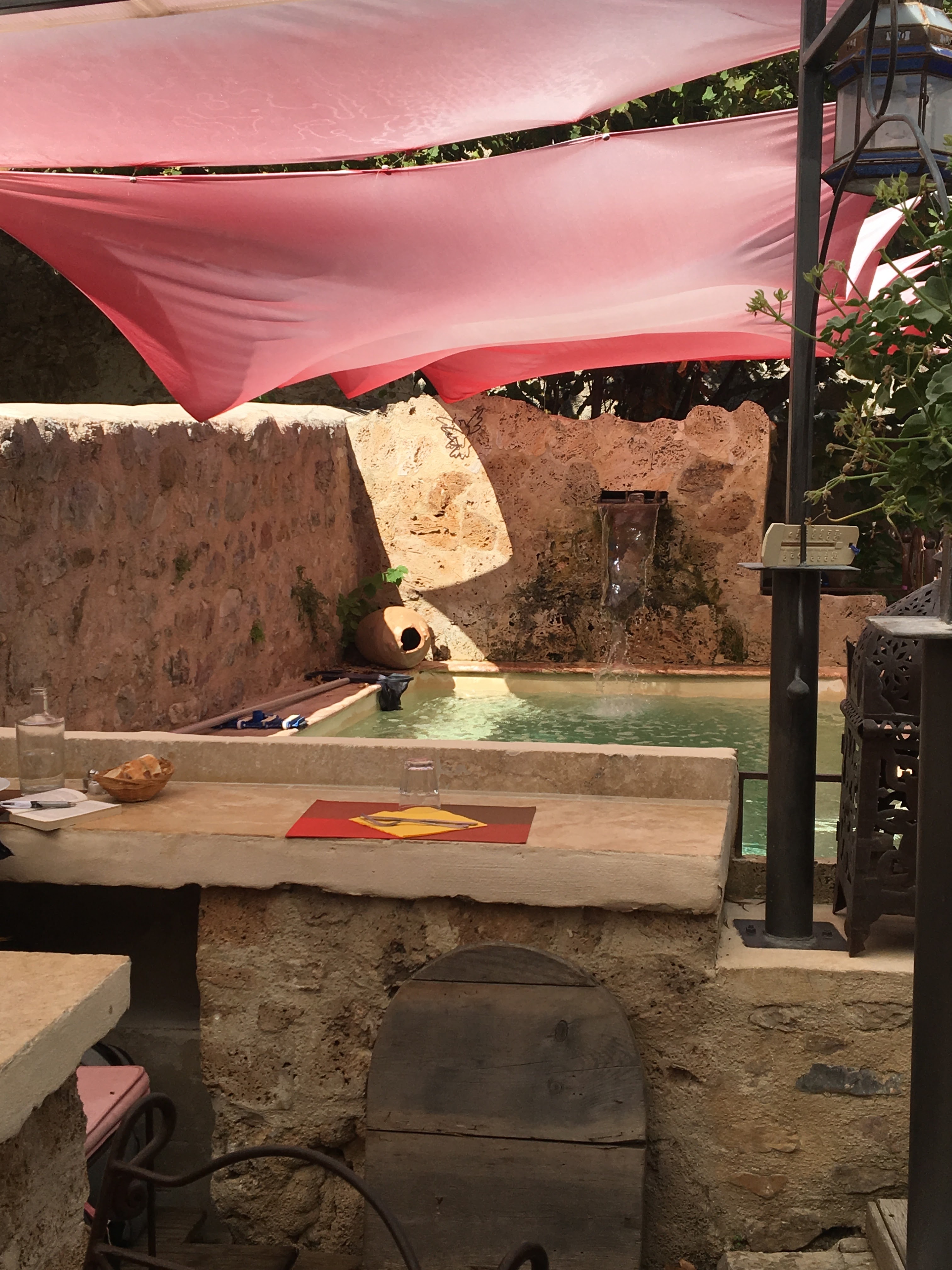 Immanquable a gauche a l'entrée du village. Terrasse ombragé .vielles pierres , plantes grimpantes et mobilier en fer forger .petit bassin avec cascade . Le décor est planter, reste le patron attipique et attentionnée, plats de qualité et copieux .tarif correct et rapide.