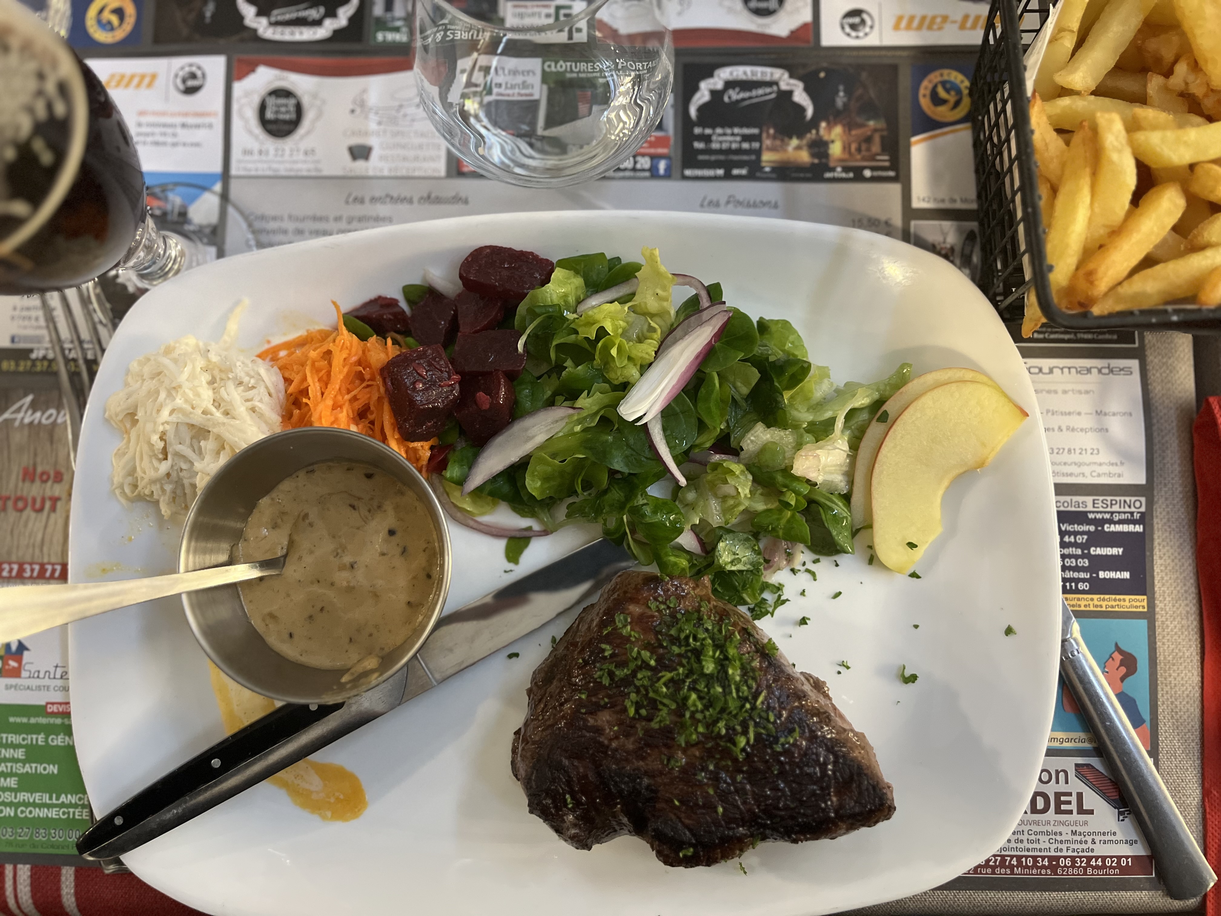 Mauvaise expérience!! Patrone plutôt désagréable a l'arrivée... très froide. Kir vin blanc extrêmement sucré... plus de sirop que de vin blanc ?? Andouillette a 16.50 pas terrible ... Viande cuisson demandée soignante, arrivée a point Sauce au maroilles très bonne ! Retrouvé un cheveux ou poil dans les frites .... Très déçue!