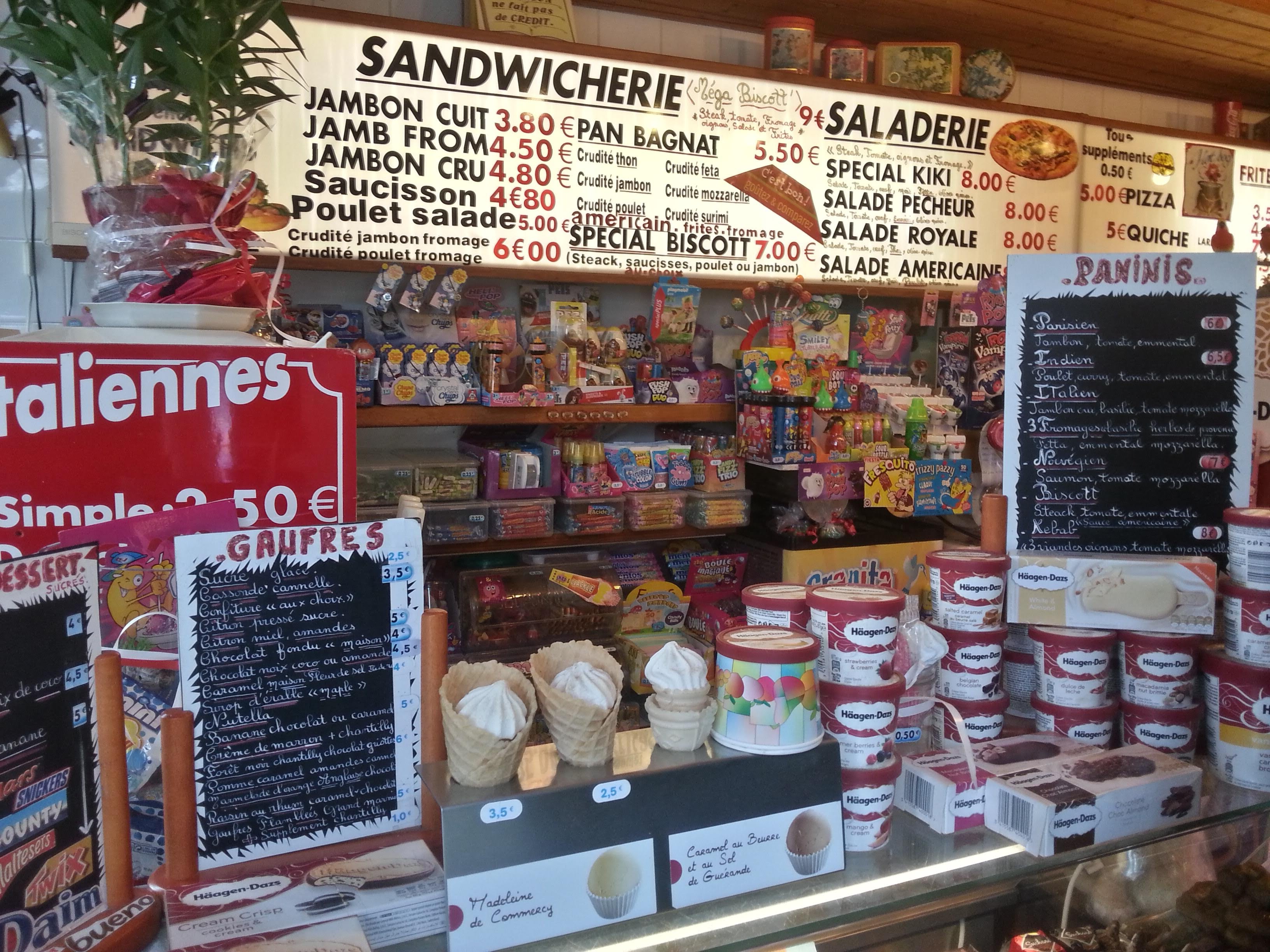 Great and friendly place, if you dont have time for lunch just stop by and get a panini. Good for kids ice cream and sweets. My kids enjoy it. I give them 5 euros and they go and buy themselves a few sweets, icecream or pancakes and gaufres. Highly recommend. My kids go every night after dinner for icecream. There is an advantage for us the house we rent is down the pathway from Biscott's. Super endroit sympathique, si vous n'avez pas le temps de déjeuner, arrêtez-vous et prenez un panini. Bon pour les glaces et les bonbons pour les enfants. Mes enfants l'apprécient. Je leur donne 5 euros et ils vont s'acheter quelques bonbons, glaces ou crêpes et gaufres. Recommande fortement. Mes enfants vont tous les soirs après le dîner pour une glace. Il y a un avantage pour nous, la maison que nous louons se trouve sur le chemin de Biscott.