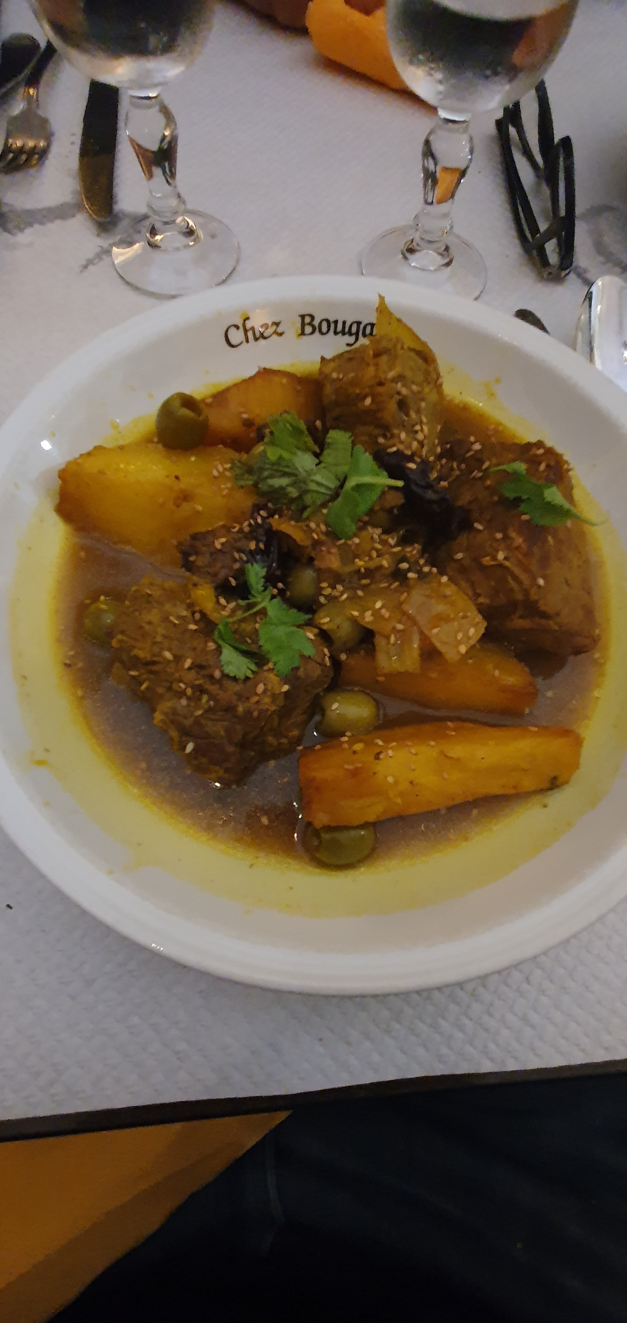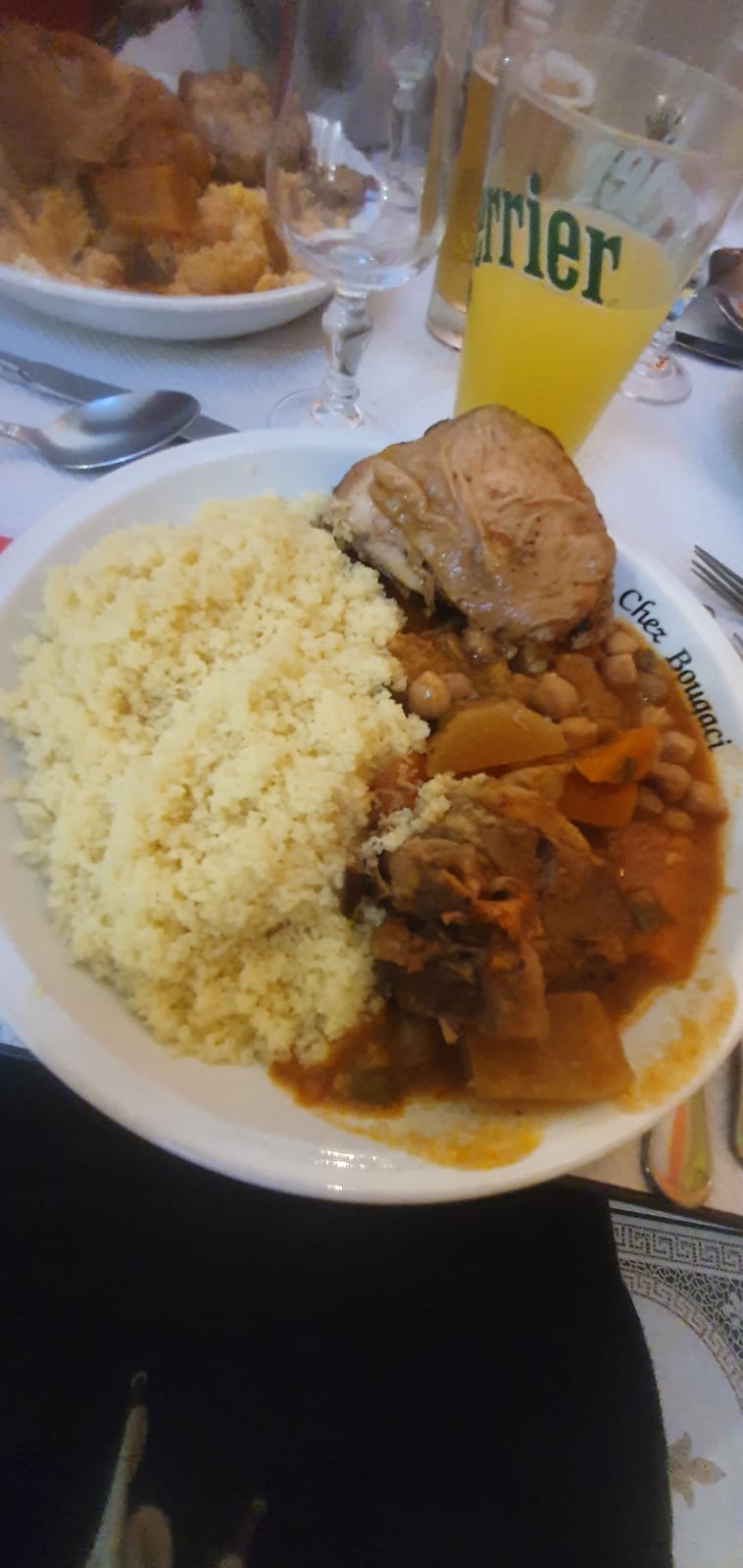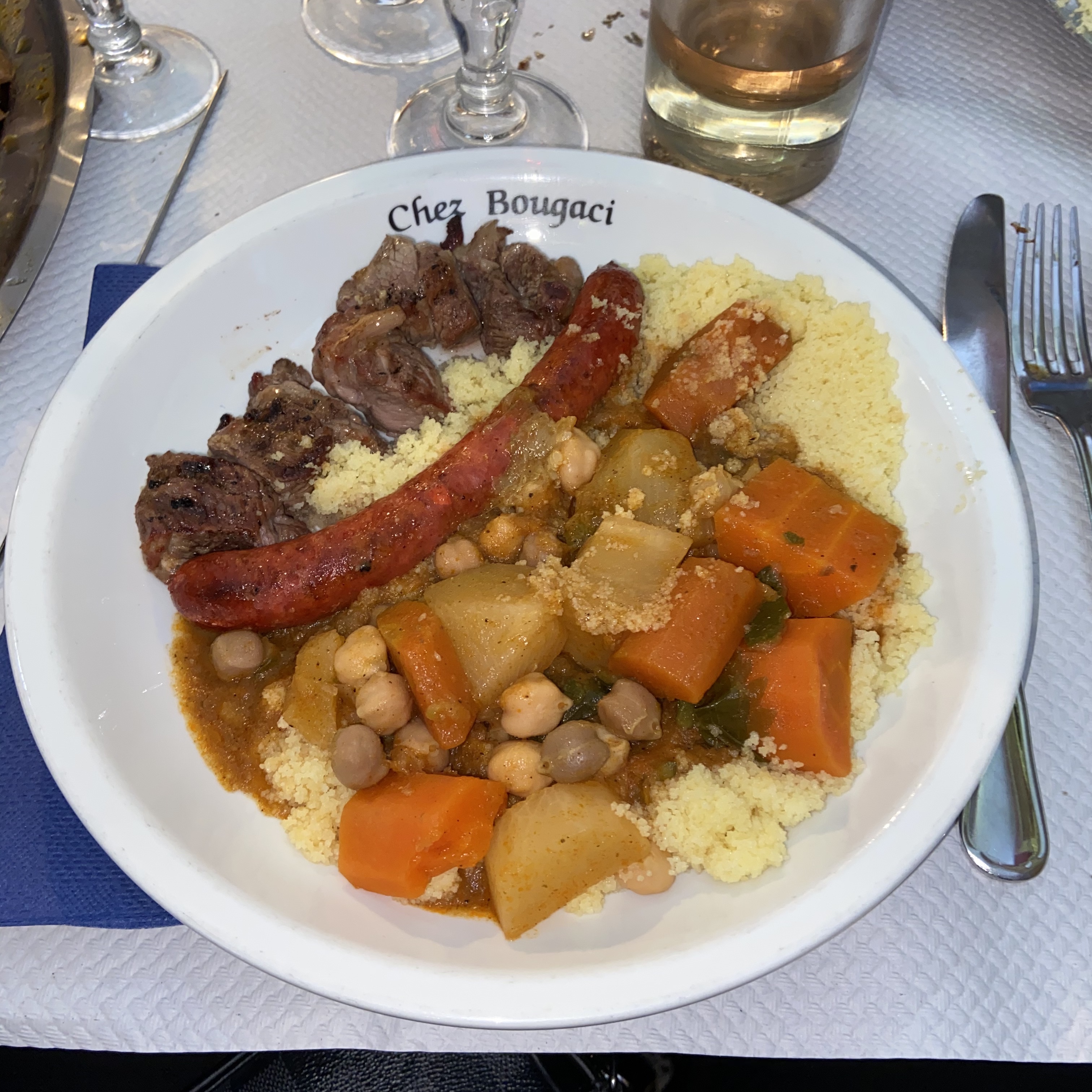 Moi et mon mari très très satisfait de l accueil agréable serveur très professionnel discret poli . Que dire du couscous un régal j ai jamais dans un restaurant manger un couscous aussi bon de ma vie et le plat de viande garni que mon mari a choisi étais aussi un régal nous nous somme régalés portion généreuse , le prix et raisonnable . Un Grand MERCI à l équipes BOUGACI à très vite .