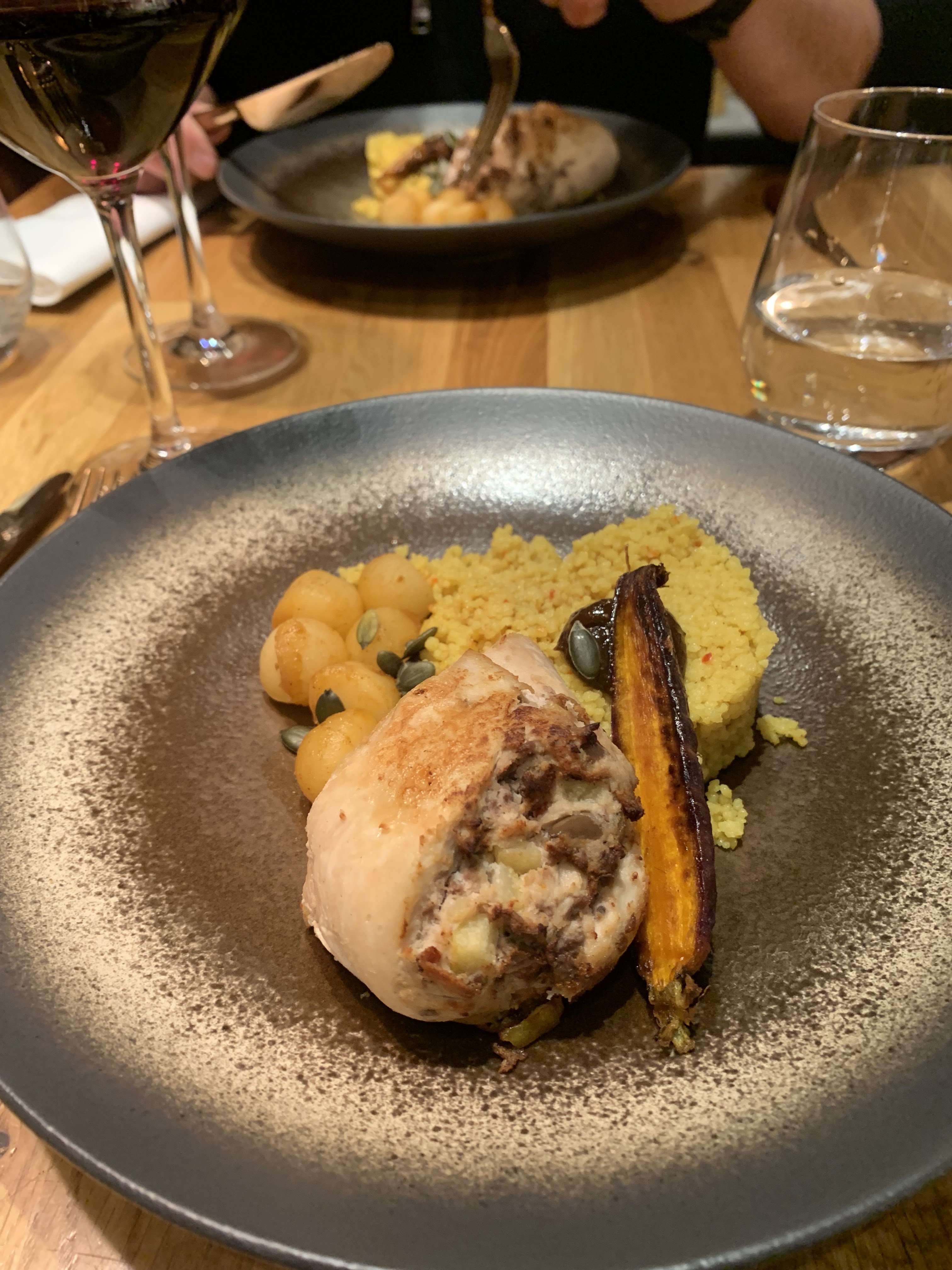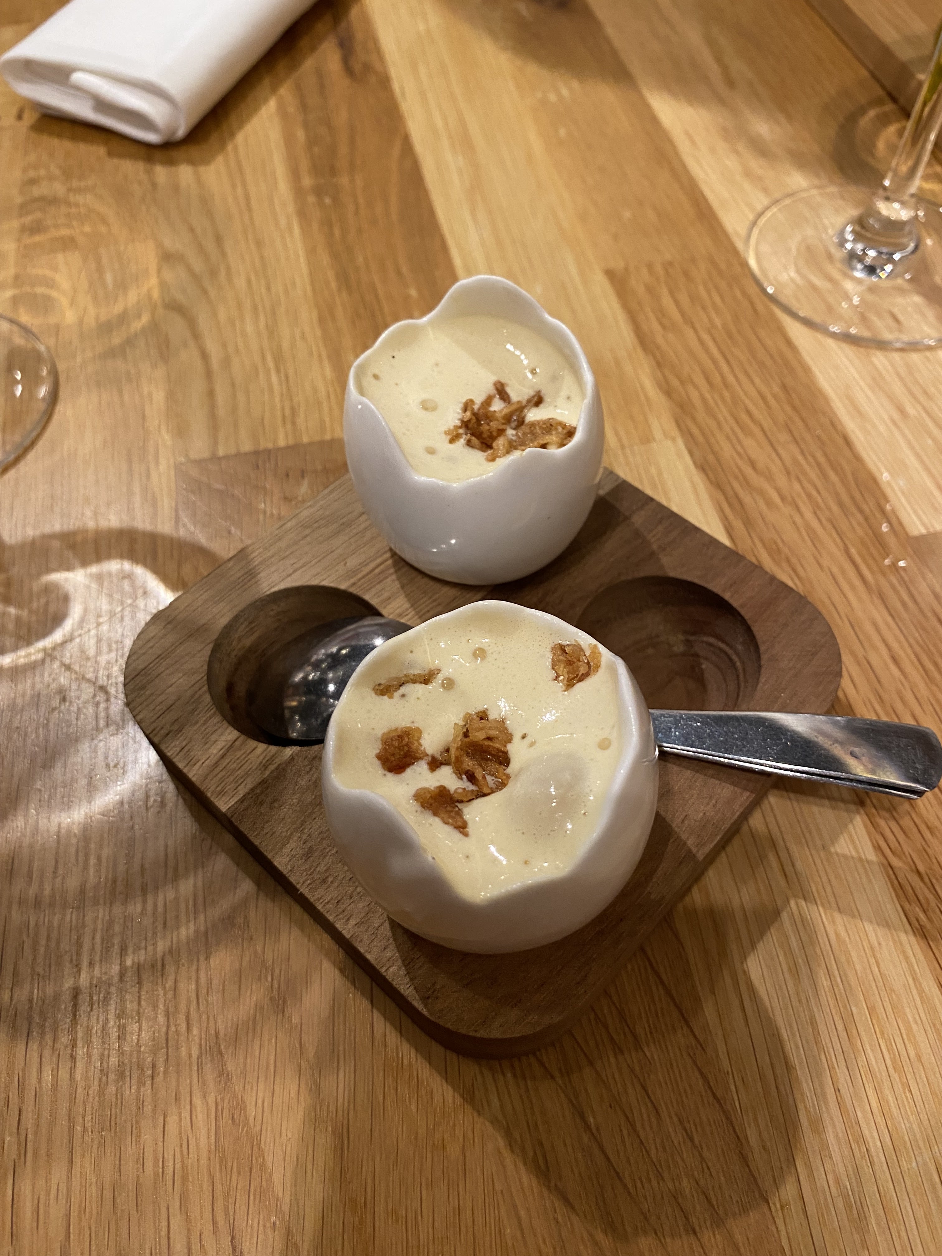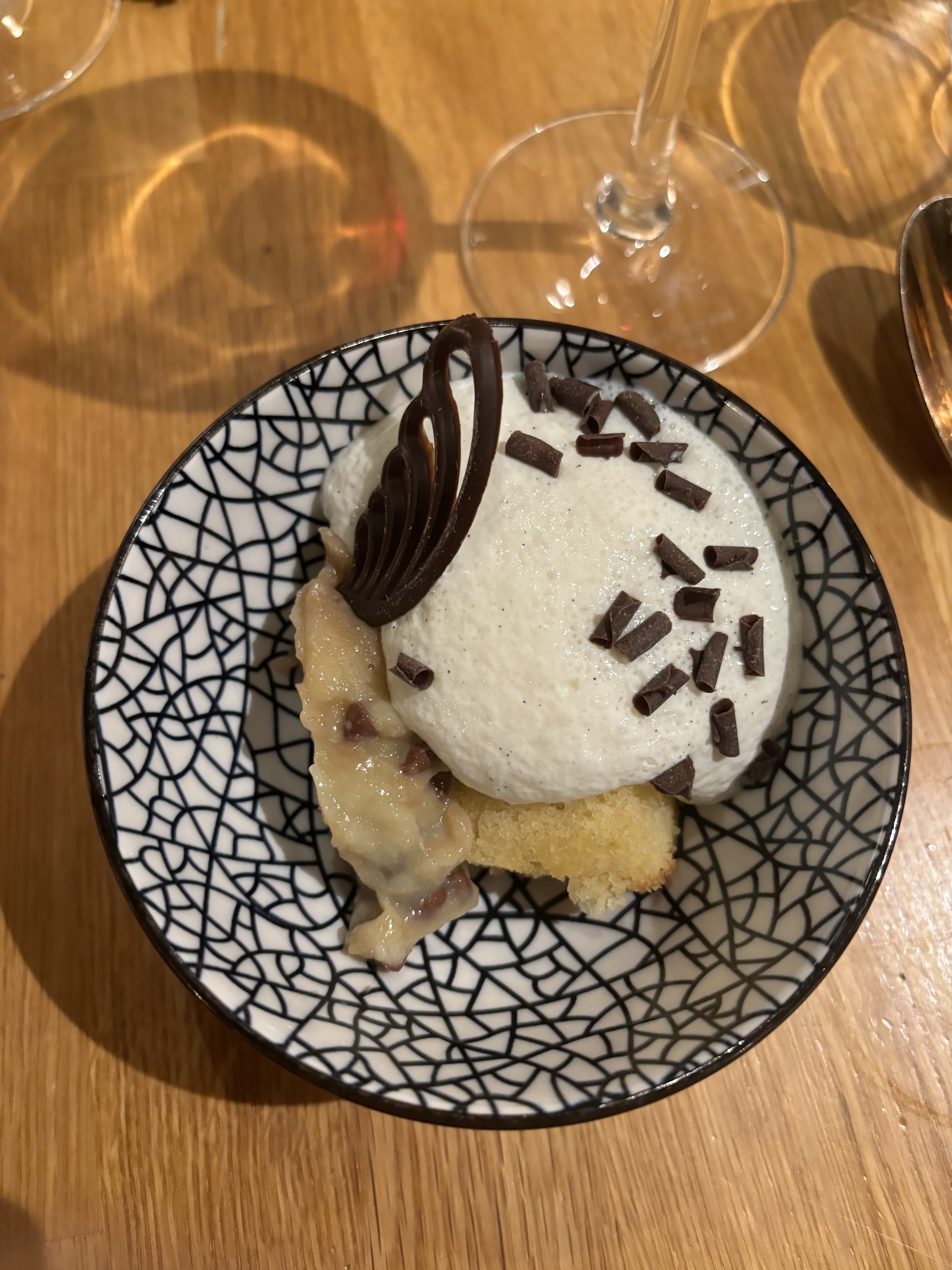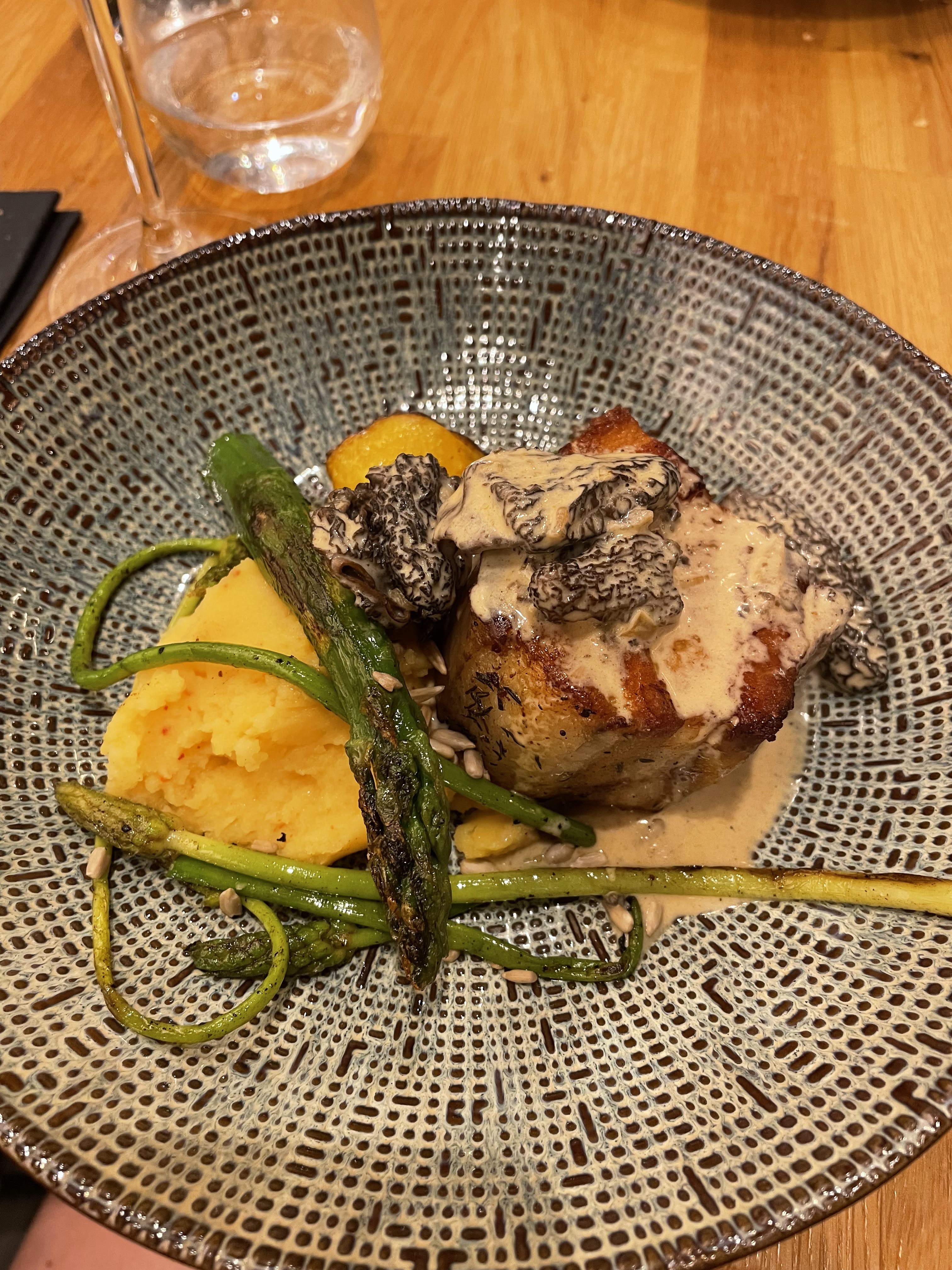 Excellent service, rien à redire. Mais malheureusement et en dépit des produits de très bonne qualité, la cuisine est trop amer à notre goût : Jus trop corsé, purée fumée, sauce à l’ail noir pour la poitrine de porc. Et de même pour le cabillaud malheureusement dont les saveurs ne créent pas d’explosion en bouche ( pois cassés / girolles / cabillaud/ purée fumée (encore) . L’ensemble rend le plat « assechant » Dommage car on sent une bonne intention mais les associations méritent d’être revus pour mieux équilibrer les plats.