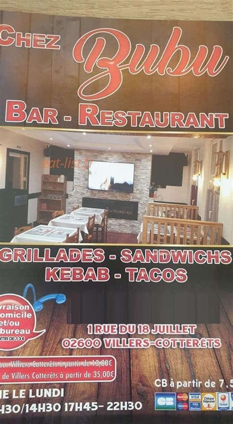 Voici toutes les informations sur le Restaurant Chez bubu qui ce trouve au 1 Rue du 18 Juillet, 02600 Villers-Cotterêts (02). Sur cette fiche vous trouverez les photos, l'adresse, les horaires d'ouverture, le numero de téléphone et les avis clients.Vous pouvez églement rédiger un avis si vous le souhaitez en bas de page.