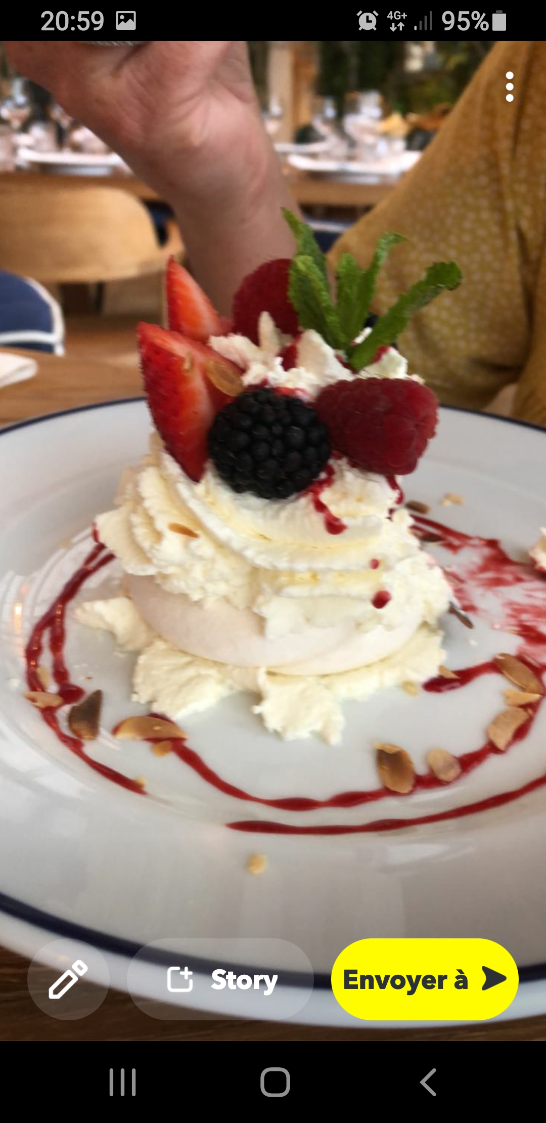 Nous avons choisi le poisson grillé au feu de bois: un Saint Pierre de 1,2 kg accompagné d’un blanc de Cassis et pour le dessert un Pavlova aux fruits rouges et une omelette norvégienne. Tout était excellent dans un très beau cadre .
