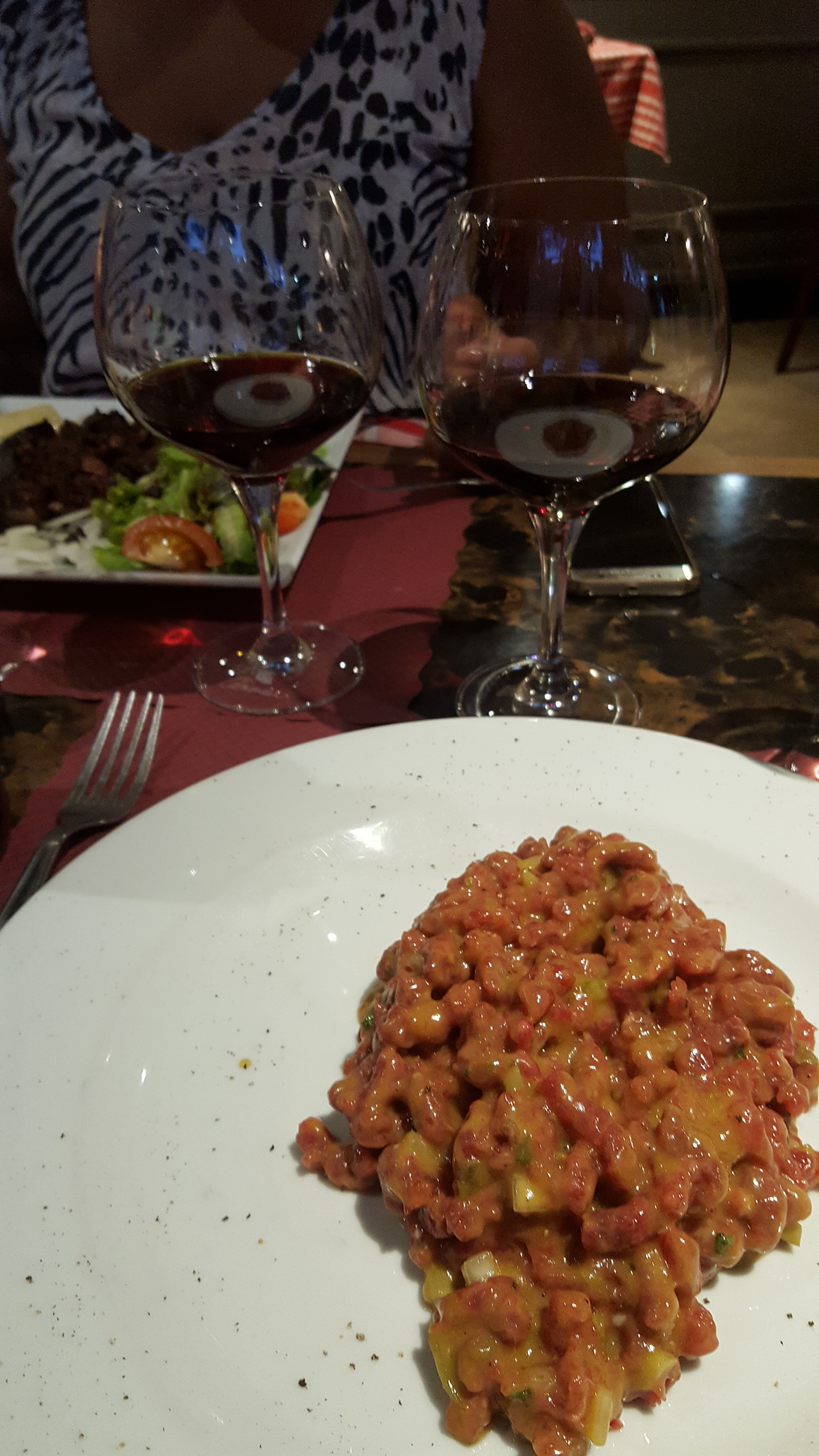 En soirée , restaurant à moitié plein et on vous colle aux autres clients avec juste une petite console de 20 cm entre les tables . Question intimité verbale ... impossible et culinaire ... vous pouvez piocher dans l ' assiette des autres ... Ça ne correspond pas à notre esprit , mais à vous de voir ! La viande était bonne et bien cuite , mais que des frites comme légumes ... Première et dernière visite pour nous